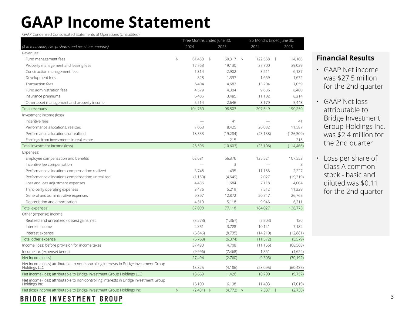 3 GAAP Income Statement GAAP Condensed Consolidated Statements of Operations (Unaudited) Three Months Ended June 30, Six Months Ended June 30, ($ in thousands, except shares and per share amounts) 2024 2023 2024 2023 Revenues: Fund management fees $ 61,453 $ 60,317 $ 122,558 $ 114,166 Property management and leasing fees 17,763 19,130 37,700 39,029 Construction management fees 1,814 2,902 3,511 6,187 Development fees 828 1,337 1,659 1,672 Transaction fees 6,404 4,682 13,204 7,059 Fund administration fees 4,579 4,304 9,636 8,480 Insurance premiums 6,405 3,485 11,102 8,214 Other asset management and property income 5,514 2,646 8,179 5,443 Total revenues 104,760 98,803 207,549 190,250 Investment income (loss): Incentive fees — 41 — 41 Performance allocations: realized 7,063 8,425 20,032 11,587 Performance allocations: unrealized 18,533 (19,284) (43,138) (126,309) Earnings from investments in real estate — 215 — 215 Total investment income (loss) 25,596 (10,603) (23,106) (114,466) Expenses: Employee compensation and benefits 62,681 56,376 125,521 107,553 Incentive fee compensation — 3 — 3 Performance allocations compensation: realized 3,748 495 11,156 2,227 Performance allocations compensation: unrealized (1,150) (4,649) 2,027 (19,319) Loss and loss adjustment expenses 4,436 1,684 7,118 4,004 Third-party operating expenses 3,476 5,219 7,512 11,329 General and administrative expenses 9,397 12,872 20,747 26,765 Depreciation and amortization 4,510 5,118 9,946 6,211 Total expenses 87,098 77,118 184,027 138,773 Other (expense) income: Realized and unrealized (losses) gains, net (3,273) (1,367) (7,503) 120 Interest income 4,351 3,728 10,141 7,182 Interest expense (6,846) (8,735) (14,210) (12,881) Total other expense (5,768) (6,374) (11,572) (5,579) Income (loss) before provision for income taxes 37,490 4,708 (11,156) (68,568) Income tax (expense) benefit (9,996) (7,468) 1,851 (1,624) Net income (loss) 27,494 (2,760) (9,305) (70,192) Net income (loss) attributable to non-controlling interests in Bridge Investment Group Holdings LLC 13,825 (4,186) (28,095) (60,435) Net income (loss) attributable to Bridge Investment Group Holdings LLC 13,669 1,426 18,790 (9,757) Net income (loss) attributable to non-controlling interests in Bridge Investment Group Holdings Inc. 16,100 6,198 11,403 (7,019) Net (loss) income attributable to Bridge Investment Group Holdings Inc. $ (2,431) $ (4,772) $ 7,387 $ (2,738) Financial Results • GAAP Net income was $27.5 million for the 2nd quarter • GAAP Net loss attributable to Bridge Investment Group Holdings Inc. was $2.4 million for the 2nd quarter • Loss per share of Class A common stock - basic and diluted was $0.11 for the 2nd quarter