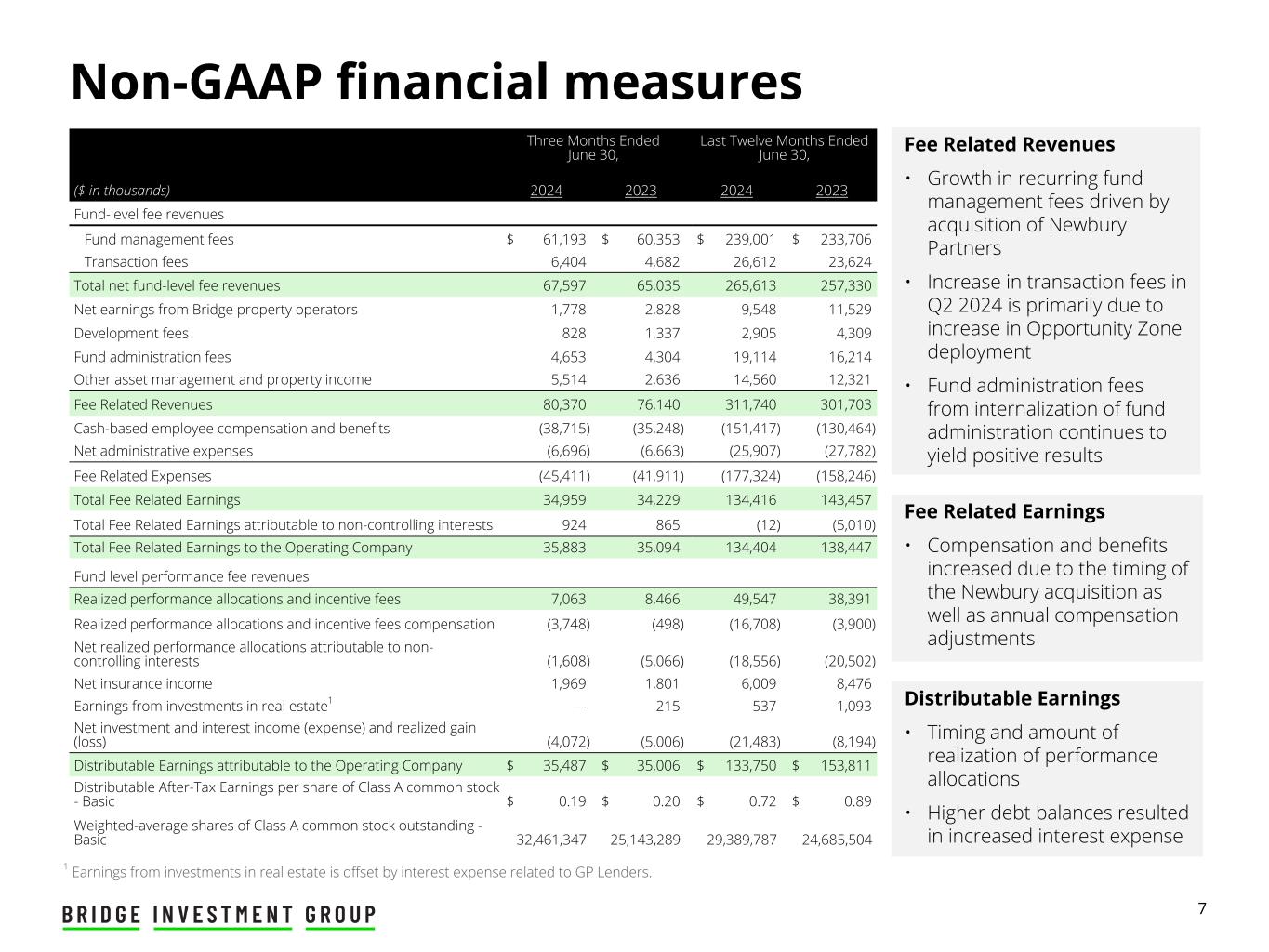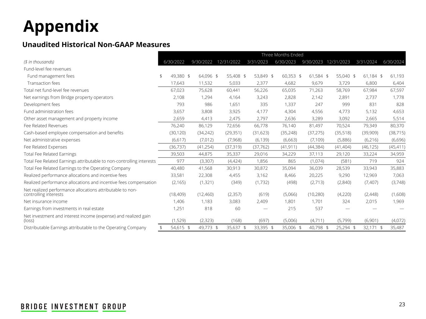 23 Appendix Unaudited Historical Non-GAAP Measures Three Months Ended ($ in thousands) 6/30/2022 9/30/2022 12/31/2022 3/31/2023 6/30/2023 9/30/2023 12/31/2023 3/31/2024 6/30/2024 Fund-level fee revenues Fund management fees $ 49,380 $ 64,096 $ 55,408 $ 53,849 $ 60,353 $ 61,584 $ 55,040 $ 61,184 $ 61,193 Transaction fees 17,643 11,532 5,033 2,377 4,682 9,679 3,729 6,800 6,404 Total net fund-level fee revenues 67,023 75,628 60,441 56,226 65,035 71,263 58,769 67,984 67,597 Net earnings from Bridge property operators 2,108 1,294 4,164 3,243 2,828 2,142 2,891 2,737 1,778 Development fees 793 986 1,651 335 1,337 247 999 831 828 Fund administration fees 3,657 3,808 3,925 4,177 4,304 4,556 4,773 5,132 4,653 Other asset management and property income 2,659 4,413 2,475 2,797 2,636 3,289 3,092 2,665 5,514 Fee Related Revenues 76,240 86,129 72,656 66,778 76,140 81,497 70,524 79,349 80,370 Cash-based employee compensation and benefits (30,120) (34,242) (29,351) (31,623) (35,248) (37,275) (35,518) (39,909) (38,715) Net administrative expenses (6,617) (7,012) (7,968) (6,139) (6,663) (7,109) (5,886) (6,216) (6,696) Fee Related Expenses (36,737) (41,254) (37,319) (37,762) (41,911) (44,384) (41,404) (46,125) (45,411) Total Fee Related Earnings 39,503 44,875 35,337 29,016 34,229 37,113 29,120 33,224 34,959 Total Fee Related Earnings attributable to non-controlling interests 977 (3,307) (4,424) 1,856 865 (1,074) (581) 719 924 Total Fee Related Earnings to the Operating Company 40,480 41,568 30,913 30,872 35,094 36,039 28,539 33,943 35,883 Realized performance allocations and incentive fees 33,581 22,308 4,455 3,162 8,466 20,225 9,290 12,969 7,063 Realized performance allocations and incentive fees compensation (2,165) (1,321) (349) (1,732) (498) (2,713) (2,840) (7,407) (3,748) Net realized performance allocations attributable to non- controlling interests (18,409) (12,460) (2,357) (619) (5,066) (10,280) (4,220) (2,448) (1,608) Net insurance income 1,406 1,183 3,083 2,409 1,801 1,701 324 2,015 1,969 Earnings from investments in real estate 1,251 818 60 — 215 537 — — — Net investment and interest income (expense) and realized gain (loss) (1,529) (2,323) (168) (697) (5,006) (4,711) (5,799) (6,901) (4,072) Distributable Earnings attributable to the Operating Company $ 54,615 $ 49,773 $ 35,637 $ 33,395 $ 35,006 $ 40,798 $ 25,294 $ 32,171 $ 35,487