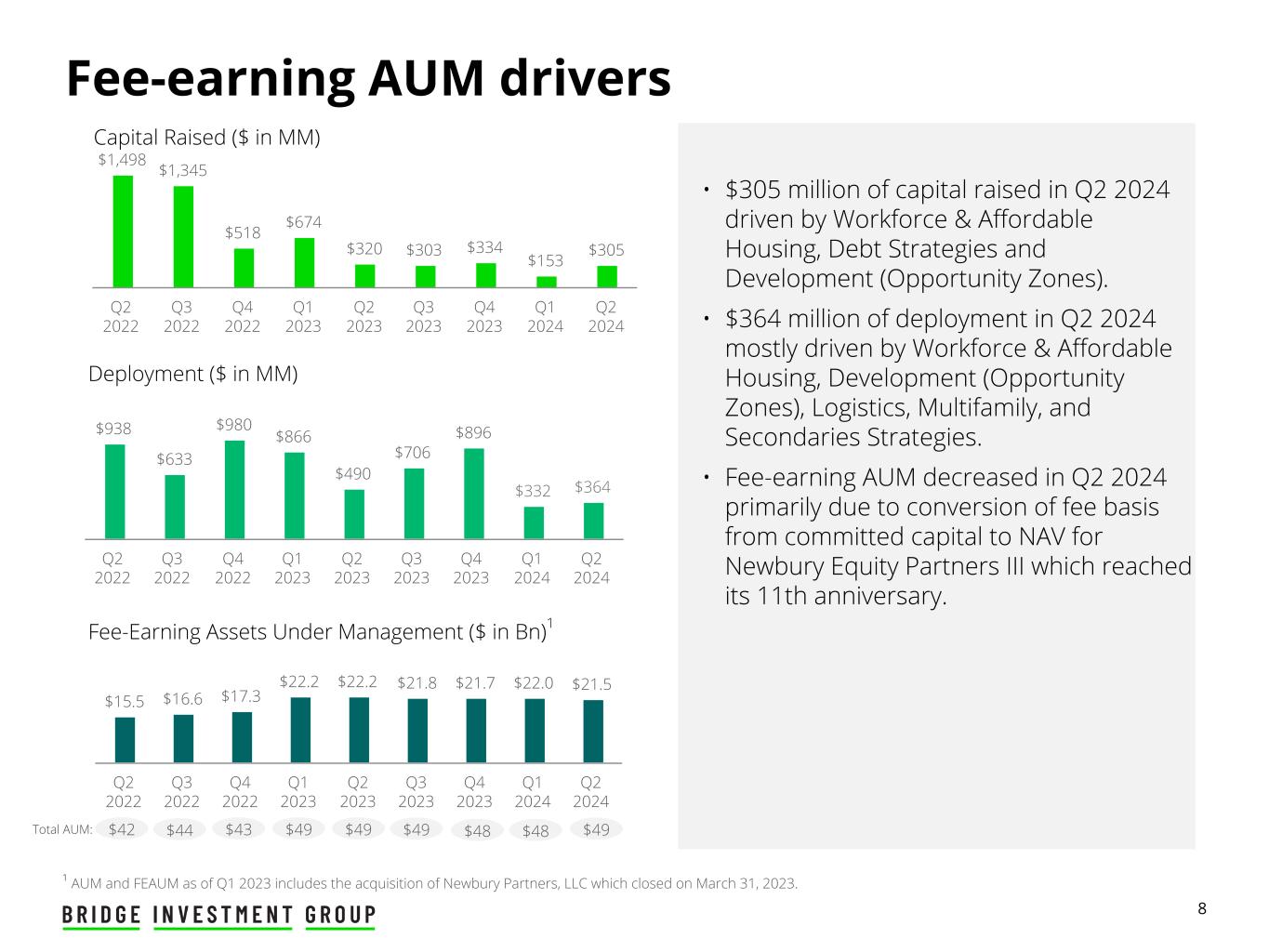 7 Distributable Earnings • Timing and amount of realization of performance allocations • Higher debt balances resulted in increased interest expense Fee Related Earnings • Compensation and benefits increased due to the timing of the Newbury acquisition as well as annual compensation adjustments Non-GAAP financial measures Three Months Ended June 30, Last Twelve Months Ended June 30, ($ in thousands) 2024 2023 2024 2023 Fund-level fee revenues Fund management fees $ 61,193 $ 60,353 $ 239,001 $ 233,706 Transaction fees 6,404 4,682 26,612 23,624 Total net fund-level fee revenues 67,597 65,035 265,613 257,330 Net earnings from Bridge property operators 1,778 2,828 9,548 11,529 Development fees 828 1,337 2,905 4,309 Fund administration fees 4,653 4,304 19,114 16,214 Other asset management and property income 5,514 2,636 14,560 12,321 Fee Related Revenues 80,370 76,140 311,740 301,703 Cash-based employee compensation and benefits (38,715) (35,248) (151,417) (130,464) Net administrative expenses (6,696) (6,663) (25,907) (27,782) Fee Related Expenses (45,411) (41,911) (177,324) (158,246) Total Fee Related Earnings 34,959 34,229 134,416 143,457 Total Fee Related Earnings attributable to non-controlling interests 924 865 (12) (5,010) Total Fee Related Earnings to the Operating Company 35,883 35,094 134,404 138,447 Fund level performance fee revenues Realized performance allocations and incentive fees 7,063 8,466 49,547 38,391 Realized performance allocations and incentive fees compensation (3,748) (498) (16,708) (3,900) Net realized performance allocations attributable to non- controlling interests (1,608) (5,066) (18,556) (20,502) Net insurance income 1,969 1,801 6,009 8,476 Earnings from investments in real estate1 — 215 537 1,093 Net investment and interest income (expense) and realized gain (loss) (4,072) (5,006) (21,483) (8,194) Distributable Earnings attributable to the Operating Company $ 35,487 $ 35,006 $ 133,750 $ 153,811 Distributable After-Tax Earnings per share of Class A common stock - Basic $ 0.19 $ 0.20 $ 0.72 $ 0.89 Weighted-average shares of Class A common stock outstanding - Basic 32,461,347 25,143,289 29,389,787 24,685,504 1 Earnings from investments in real estate is offset by interest expense related to GP Lenders. Fee Related Revenues • Growth in recurring fund management fees driven by acquisition of Newbury Partners • Increase in transaction fees in Q2 2024 is primarily due to increase in Opportunity Zone deployment • Fund administration fees from internalization of fund administration continues to yield positive results