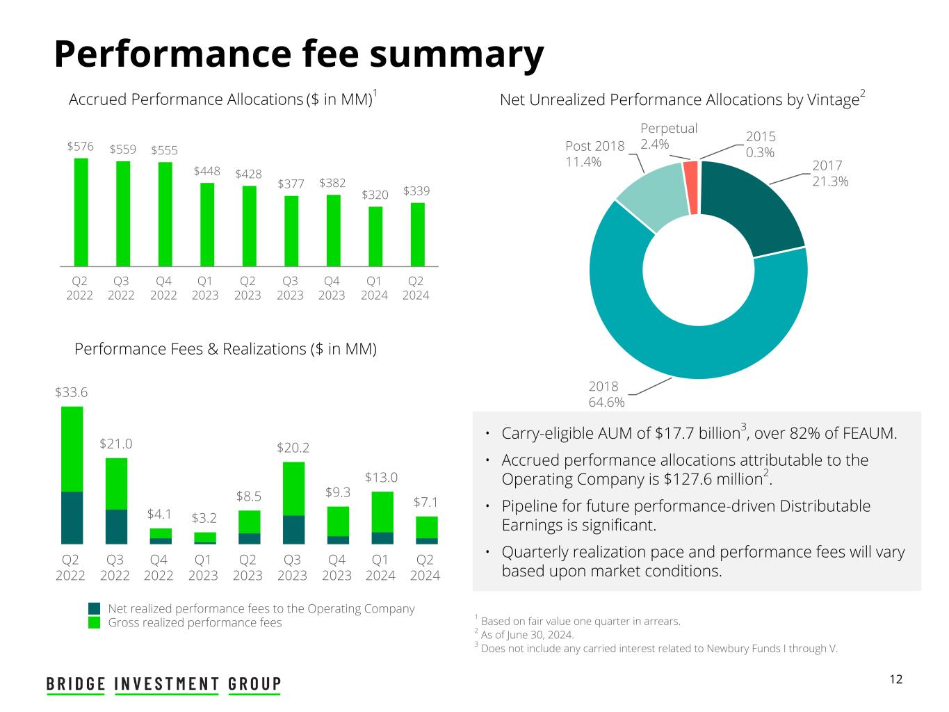 11 $40 $45 $35 $29 $34 $37 $29 $33 $35 Q2 2022 Q3 2022 Q4 2022 Q1 2023 Q2 2023 Q3 2023 Q4 2023 Q1 2024 Q2 2024 Total Revenues & GAAP Net Income (Loss) ($ in MM) Earnings summary Fee Related Earnings & Distributable Earnings attributable to the Operating Company ($ in MM) • Fee Related Earnings increased $1.7 million, or 5% compared to Q1 2024, driven by stable FEAUM and healthy margins. • Distributable Earnings to the Operating Company increased $3.3 million, or 10% compared to Q1 2024. Fee Related Earnings & Margin ($ in MM) $99 $110 $95 $91 $99 $106 $94 $103 $105 $124 $32 $18 $(67) $(3) $(18) $1 $(37) $27 Total Revenues GAAP Net Income (Loss) Q2 2022 Q3 2022 Q4 2022 Q1 2023 Q2 2023 Q3 2023 Q4 2023 Q1 2024 Q2 2024 $40 $42 $31 $31 $35 $36 $29 $34 $36 $55 $50 $36 $33 $35 $41 $25 $32 $35 Fee Related Earnings attributable to Operating Company Distributable Earnings attributable to Operating Company Q2 2022 Q3 2022 Q4 2022 Q1 2023 Q2 2023 Q3 2023 Q4 2023 Q1 2024 Q2 2024 52% 52% 49% 43% 45% 46% 41% 42% 43%Margin: