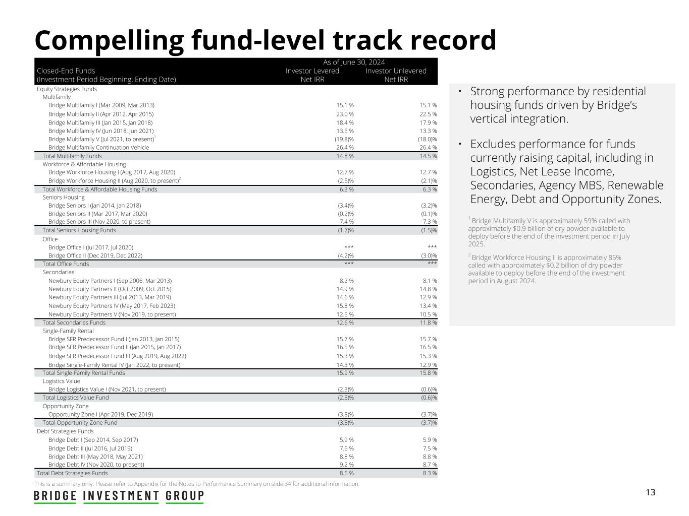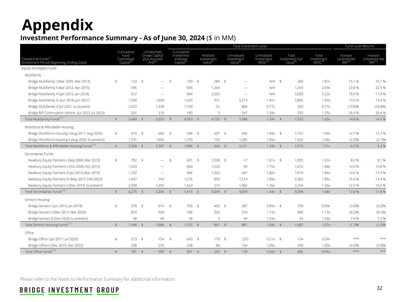 32 Investment Performance Summary - As of June 30, 2024 ($ in MM) Appendix Total Investment-Level Fund-Level Returns Closed-End Funds(1) (Investment Period Beginning, Ending Date) Cumulative Fund Committed Capital(2) Unreturned Drawn Capital plus Accrued Pref(3) Cumulative Investment Invested Capital(4) Realized Investment Value(5) Unrealized Investment Value(6) Unrealized Investment MOIC(7) Total Investment Fair Value(8) Total Investment MOIC(9) Investor Levered Net IRR(10) Investor Unlevered Net IRR(11) Equity Strategies Funds Multifamily Bridge Multifamily I (Mar 2009, Mar 2013) $ 124 $ — $ 150 $ 280 $ — N/A $ 280 1.87x 15.1 % 15.1 % Bridge Multifamily II (Apr 2012, Apr 2015) 596 — 605 1,264 — N/A 1,264 2.09x 23.0 % 22.5 % Bridge Multifamily III (Jan 2015, Jan 2018) 912 — 904 2,003 — N/A 2,003 2.22x 18.4 % 17.9 % Bridge Multifamily IV (Jun 2018, Jun 2021) 1,590 1,659 1,529 531 2,273 1.81x 2,805 1.83x 13.5 % 13.3 % Bridge Multifamily V (Jul 2021, to present) 2,257 1,478 1,190 52 868 0.77x 920 0.77x (19.8) % (18.0) % Bridge MF Continuation Vehicle (Jul 2023, Jul 2023) 201 216 185 3 247 1.34x 250 1.35x 26.4 % 26.4 % Total Multifamily Funds(12) $ 5,680 $ 3,353 $ 4,563 $ 4,135 $ 3,388 1.34x $ 7,523 1.65x 14.8 % 14.5 % Workforce & Affordable Housing Bridge Workforce Housing I (Aug 2017, Aug 2020) $ 619 $ 683 $ 596 $ 207 $ 946 1.89x $ 1,153 1.94x 12.7 % 12.7 % Bridge Workforce Housing II (Aug 2020, to present) 1,741 1,604 1,370 135 1,285 1.04x 1,420 1.04x (2.5) % (2.1) % Total Workforce & Affordable Housing Funds(12) $ 2,360 $ 2,287 $ 1,966 $ 342 $ 2,231 1.29x $ 2,573 1.31x 6.3 % 6.3 % Secondaries Funds Newbury Equity Partners I (Sep 2006, Mar 2013) $ 702 $ — $ 631 $ 1,038 $ 17 1.61x $ 1,055 1.67x 8.2 % 8.1 % Newbury Equity Partners II (Oct 2009, Oct 2015) 1,024 — 860 1,526 90 1.75x 1,616 1.88x 14.9 % 14.8 % Newbury Equity Partners III (Jul 2013, Mar 2019) 1,102 — 986 1,363 447 1.82x 1,810 1.84x 14.6 % 12.9 % Newbury Equity Partners IV (May 2017, Feb 2023) 1,447 744 1,276 850 1,514 1.89x 2,363 1.85x 15.8 % 13.4 % Newbury Equity Partners V (Nov 2019, to present) 2,000 1,492 1,663 272 1,982 1.35x 2,254 1.36x 12.5 % 10.5 % Total Secondaries Funds(12) $ 6,275 $ 2,236 $ 5,415 $ 5,049 $ 4,049 1.64x $ 9,098 1.68x 12.6 % 11.8 % Seniors Housing Bridge Seniors I (Jan 2014, Jan 2018) $ 578 $ 914 $ 759 $ 463 $ 287 0.85x $ 750 0.99x (3.4) % (3.2) % Bridge Seniors II (Mar 2017, Mar 2020) 820 934 788 335 554 1.15x 889 1.13x (0.2) % (0.1) % Bridge Seniors III (Nov 2020, to present) 48 40 28 3 40 1.54x 43 1.54x 7.4 % 7.3 % Total Seniors Housing Funds(12) $ 1,446 $ 1,888 $ 1,575 $ 801 $ 881 1.04x $ 1,682 1.07x (1.7) % (1.5) % Office Bridge Office I (Jul 2017, Jul 2020) $ 573 $ 754 $ 643 $ 179 $ (25) 0.21x $ 154 0.24x *** *** Bridge Office II (Dec 2019, Dec 2022) 208 235 248 84 164 1.00x 248 1.00x (4.2) % (3.0) % Total Office Funds(12) $ 781 $ 989 $ 891 $ 263 $ 139 0.50x $ 402 0.45x *** *** Please refer to the Notes to Performance Summary for additional information.
