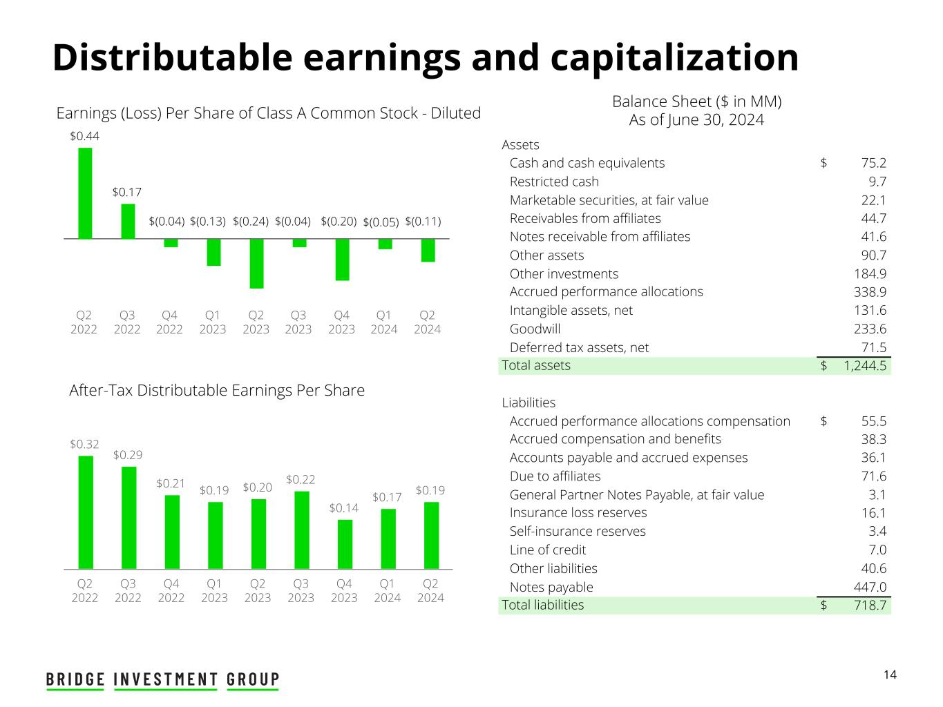 14 $0.44 $0.17 Q2 2022 Q3 2022 Q4 2022 Q1 2023 Q2 2023 Q3 2023 Q4 2023 Q1 2024 Q2 2024 Distributable earnings and capitalization Balance Sheet ($ in MM) As of June 30, 2024 After-Tax Distributable Earnings Per Share $0.32 $0.29 $0.21 $0.19 $0.20 $0.22 $0.14 $0.17 $0.19 Q2 2022 Q3 2022 Q4 2022 Q1 2023 Q2 2023 Q3 2023 Q4 2023 Q1 2024 Q2 2024 Assets Cash and cash equivalents $ 75.2 Restricted cash 9.7 Marketable securities, at fair value 22.1 Receivables from affiliates 44.7 Notes receivable from affiliates 41.6 Other assets 90.7 Other investments 184.9 Accrued performance allocations 338.9 Intangible assets, net 131.6 Goodwill 233.6 Deferred tax assets, net 71.5 Total assets $ 1,244.5 Liabilities Accrued performance allocations compensation $ 55.5 Accrued compensation and benefits 38.3 Accounts payable and accrued expenses 36.1 Due to affiliates 71.6 General Partner Notes Payable, at fair value 3.1 Insurance loss reserves 16.1 Self-insurance reserves 3.4 Line of credit 7.0 Other liabilities 40.6 Notes payable 447.0 Total liabilities $ 718.7 Earnings (Loss) Per Share of Class A Common Stock - Diluted $(0.13) $(0.24) $(0.04)$(0.04) $(0.20) $(0.11)$(0.05)