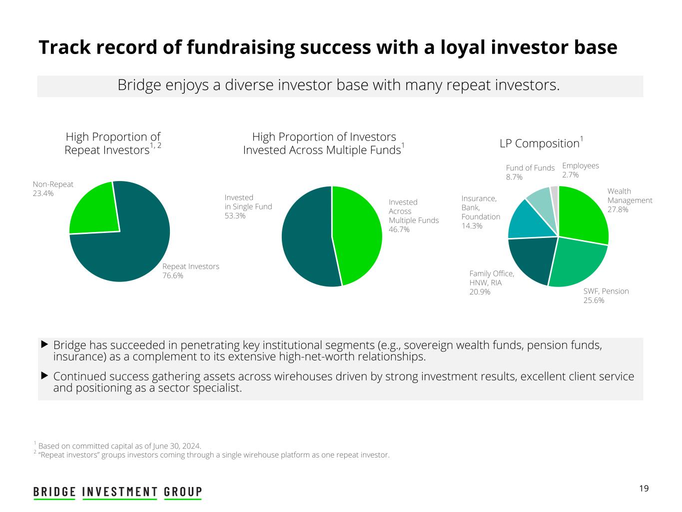 18 Individual 51% Institutional 49% Balanced investor base Fund Investor by Geography1 Fund Investor by Type1 Bridge’s Client Solutions Group maintains deep institutional and retail investor relationships and has built an impressive track record of raising capital and driving growth. u During Q2 2024, 72% of capital was raised domestically and 72% came from institutional investors. u Deep and broad individual investors relationships driven in part by relationships with some of the largest wirehouses and RIAs in the world. US 60% Rest of World 40% 1 Based on committed capital as of June 30, 2024.