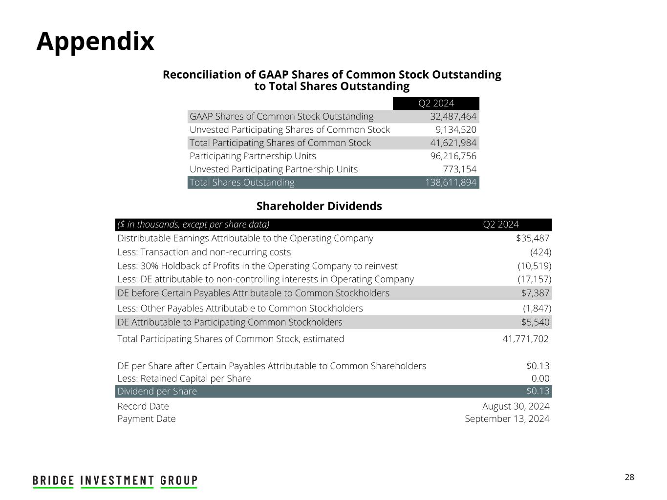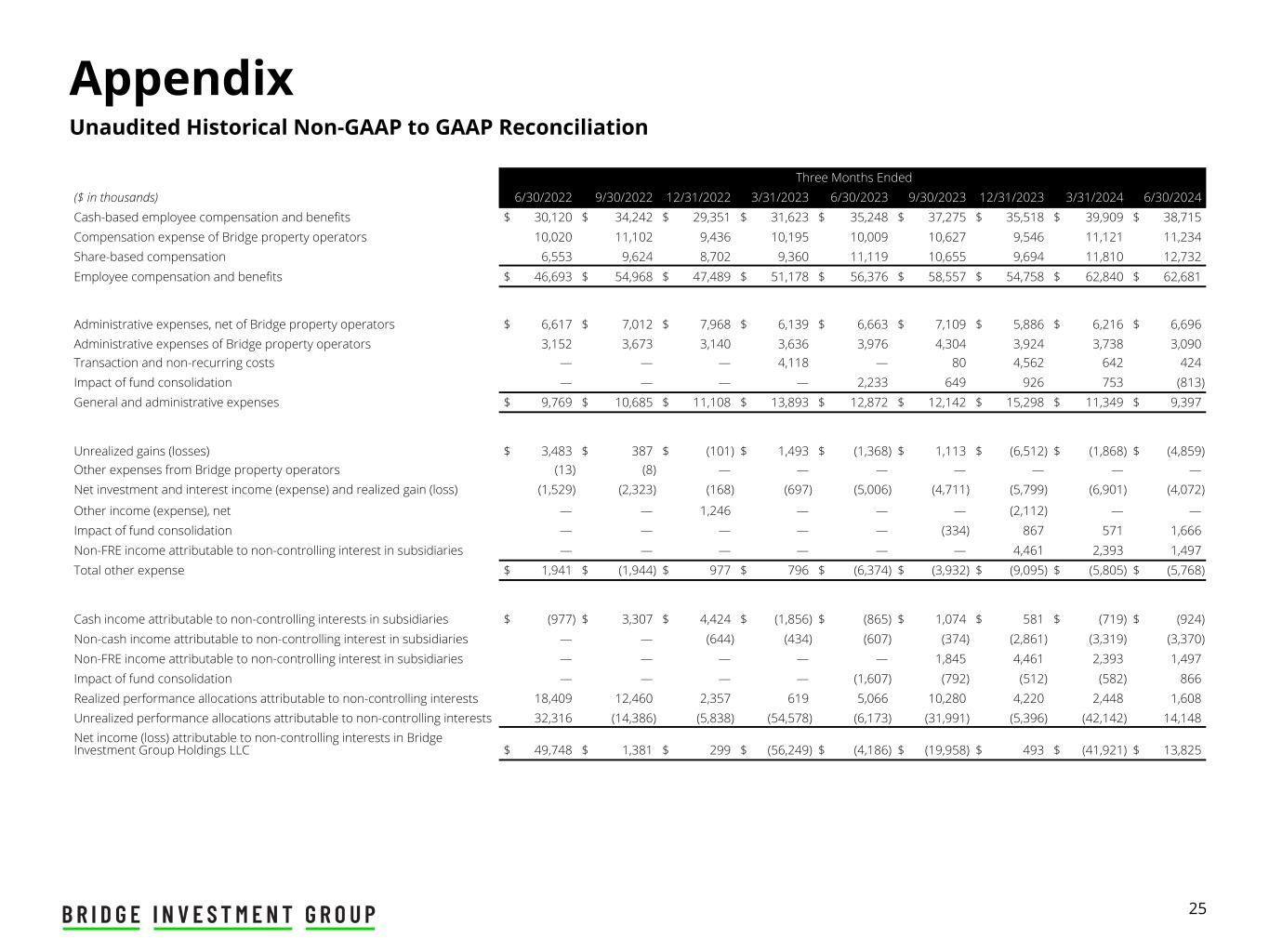 24 Appendix Unaudited Historical Reconciliation of Non-GAAP Distributable Earnings per Share Three Months Ended ($ in thousands, except per share and per share amounts) 6/30/2022 9/30/2022 12/31/2022 3/31/2023 6/30/2023 9/30/2023 12/31/2023 3/31/2024 6/30/2024 Numerator: Distributable Earnings ("DE") attributable to the Operating Company $ 54,615 $ 49,773 $ 35,637 $ 33,395 $ 35,006 $ 40,798 $ 25,294 $ 32,171 $ 35,487 Less: DE attributable to non-controlling interests in the Operating Company (42,256) (38,451) (27,488) (25,230) (26,436) (30,665) (18,704) (22,734) (24,812) DE attributable to Bridge Investment Group Holdings Inc. 12,359 11,322 8,149 8,165 8,570 10,133 6,590 9,437 10,675 Less: Income allocated to participating Restricted Shares (2,126) (1,969) (1,405) (1,917) (1,998) (2,393) (1,445) (2,177) (2,372) DE available to common shareholders 10,233 9,353 6,744 6,248 6,572 7,740 5,145 7,260 8,303 Income tax benefit (expense) (2,558) (2,338) (1,686) (1,562) (1,643) (1,935) (1,286) (1,815) (2,076) After-tax DE available to common shareholders $ 7,675 $ 7,015 $ 5,058 $ 4,686 $ 4,929 $ 5,805 $ 3,859 $ 5,445 $ 6,227 Denominator: Weighted-average shares of Class A Common stock outstanding - Basic 24,029,107 24,157,236 24,373,172 25,068,319 25,143,289 25,956,587 27,798,236 31,342,979 32,461,347 After-Tax Non-GAAP Distributable Earnings Per Share $ 0.32 $ 0.29 $ 0.21 $ 0.19 $ 0.20 $ 0.22 $ 0.14 $ 0.17 $ 0.19