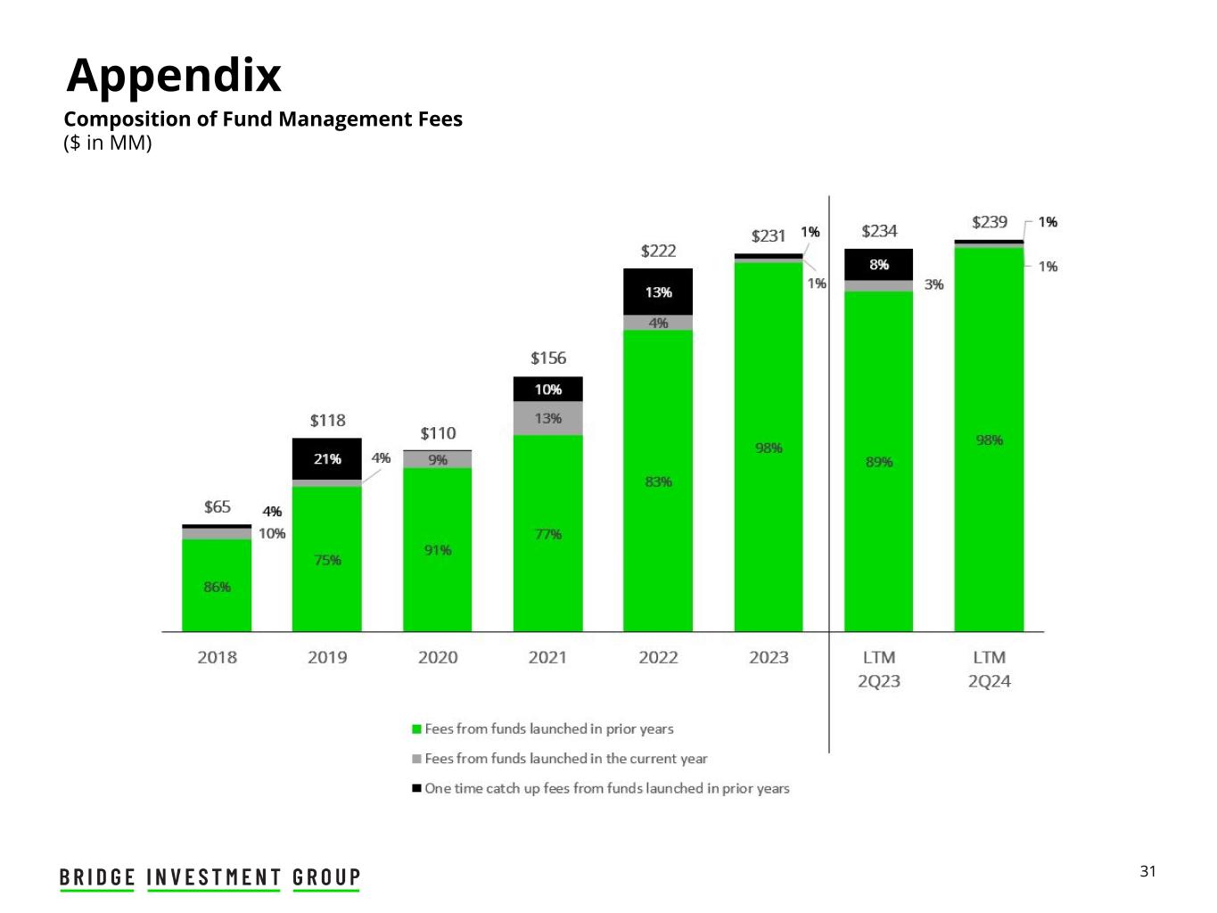 30 Appendix Profits Interests • 2019 profits interests converted on January 1, 2022 • 2020 profits interests converted on January 1, 2023 • 2021 profits interests converted on July 1, 2023 • Resulted in a reduction in non-controlling interest and an increase in Net Income to the Operating Company. • Resulted in an increase in share count; however, expected to be antidilutive to public shareholders. Performance Income • The Operating Company receives 24% to 40% of the gross performance allocations. Non-Controlling Interests ($ in thousands) For Three Months Ended June 30, 2024 NON-GAAP FINANCIAL MEASURES Total Fund Management Performance income Fund-level fee revenues Fund management fees $ 61,193 $ 61,193 $ — Transaction fees 6,404 6,404 — Total net fund-level fee revenues 67,597 67,597 — Net earnings from Bridge property operators 1,778 1,778 — Development fees 828 828 — Fund administration fees 4,653 4,653 — Other asset management and property income 5,514 5,514 — Fee Related Revenues 80,370 80,370 — Cash-based employee compensation and benefits (38,715) (38,715) — Net administrative expenses (6,696) (6,696) — Fee Related Expenses (45,411) (45,411) — Total Fee Related Earnings 34,959 34,959 — Total Fee Related Earnings attributable to non-controlling interests 924 924 — Total Fee Related Earnings to the Operating Company 35,883 35,883 — Realized performance allocations and incentive fees 7,063 — 7,063 Realized performance allocations and incentive fees compensation (3,748) — (3,748) Net realized performance allocations attributable to non-controlling interests (1,608) — (1,608) Net insurance income 1,969 1,969 — Earnings from investments in real estate — — — Net investment and interest income (expense) and realized gain (loss) (4,072) (4,072) — Distributable Earnings Attributable to the Operating Company $ 35,487 $ 33,780 $ 1,707