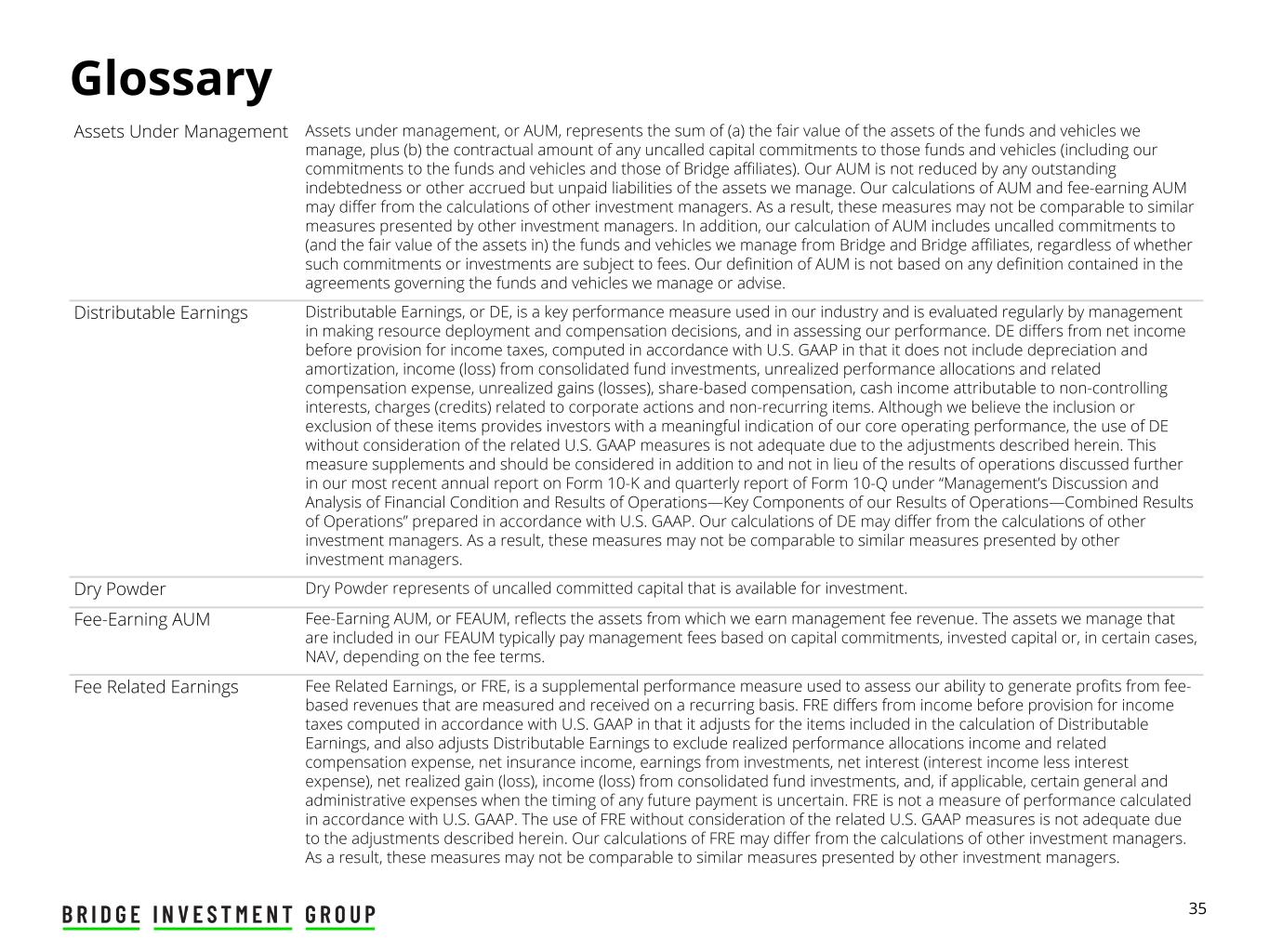35 Glossary Assets Under Management Assets under management, or AUM, represents the sum of (a) the fair value of the assets of the funds and vehicles we manage, plus (b) the contractual amount of any uncalled capital commitments to those funds and vehicles (including our commitments to the funds and vehicles and those of Bridge affiliates). Our AUM is not reduced by any outstanding indebtedness or other accrued but unpaid liabilities of the assets we manage. Our calculations of AUM and fee-earning AUM may differ from the calculations of other investment managers. As a result, these measures may not be comparable to similar measures presented by other investment managers. In addition, our calculation of AUM includes uncalled commitments to (and the fair value of the assets in) the funds and vehicles we manage from Bridge and Bridge affiliates, regardless of whether such commitments or investments are subject to fees. Our definition of AUM is not based on any definition contained in the agreements governing the funds and vehicles we manage or advise. Distributable Earnings Distributable Earnings, or DE, is a key performance measure used in our industry and is evaluated regularly by management in making resource deployment and compensation decisions, and in assessing our performance. DE differs from net income before provision for income taxes, computed in accordance with U.S. GAAP in that it does not include depreciation and amortization, income (loss) from consolidated fund investments, unrealized performance allocations and related compensation expense, unrealized gains (losses), share-based compensation, cash income attributable to non-controlling interests, charges (credits) related to corporate actions and non-recurring items. Although we believe the inclusion or exclusion of these items provides investors with a meaningful indication of our core operating performance, the use of DE without consideration of the related U.S. GAAP measures is not adequate due to the adjustments described herein. This measure supplements and should be considered in addition to and not in lieu of the results of operations discussed further in our most recent annual report on Form 10-K and quarterly report of Form 10-Q under “Management’s Discussion and Analysis of Financial Condition and Results of Operations—Key Components of our Results of Operations—Combined Results of Operations” prepared in accordance with U.S. GAAP. Our calculations of DE may differ from the calculations of other investment managers. As a result, these measures may not be comparable to similar measures presented by other investment managers. Dry Powder Dry Powder represents of uncalled committed capital that is available for investment. Fee-Earning AUM Fee-Earning AUM, or FEAUM, reflects the assets from which we earn management fee revenue. The assets we manage that are included in our FEAUM typically pay management fees based on capital commitments, invested capital or, in certain cases, NAV, depending on the fee terms. Fee Related Earnings Fee Related Earnings, or FRE, is a supplemental performance measure used to assess our ability to generate profits from fee- based revenues that are measured and received on a recurring basis. FRE differs from income before provision for income taxes computed in accordance with U.S. GAAP in that it adjusts for the items included in the calculation of Distributable Earnings, and also adjusts Distributable Earnings to exclude realized performance allocations income and related compensation expense, net insurance income, earnings from investments, net interest (interest income less interest expense), net realized gain (loss), income (loss) from consolidated fund investments, and, if applicable, certain general and administrative expenses when the timing of any future payment is uncertain. FRE is not a measure of performance calculated in accordance with U.S. GAAP. The use of FRE without consideration of the related U.S. GAAP measures is not adequate due to the adjustments described herein. Our calculations of FRE may differ from the calculations of other investment managers. As a result, these measures may not be comparable to similar measures presented by other investment managers.