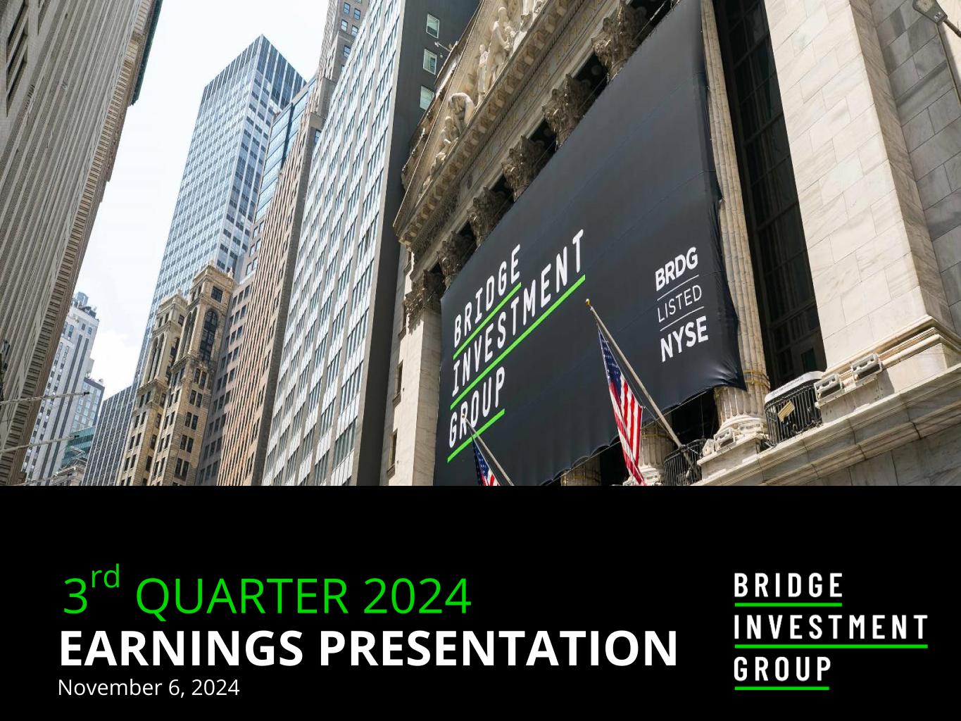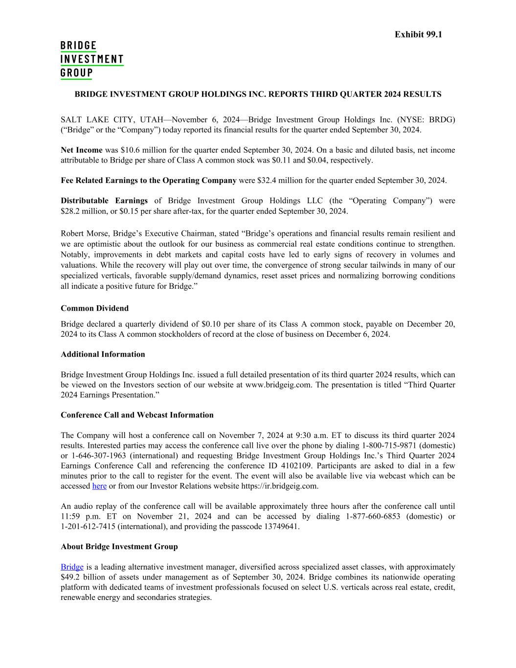 BRIDGE INVESTMENT GROUP HOLDINGS INC. REPORTS THIRD QUARTER 2024 RESULTS SALT LAKE CITY, UTAH—November 6, 2024—Bridge Investment Group Holdings Inc. (NYSE: BRDG) (“Bridge” or the “Company”) today reported its financial results for the quarter ended September 30, 2024. Net Income was $10.6 million for the quarter ended September 30, 2024. On a basic and diluted basis, net income attributable to Bridge per share of Class A common stock was $0.11 and $0.04, respectively. Fee Related Earnings to the Operating Company were $32.4 million for the quarter ended September 30, 2024. Distributable Earnings of Bridge Investment Group Holdings LLC (the “Operating Company”) were $28.2 million, or $0.15 per share after-tax, for the quarter ended September 30, 2024. Robert Morse, Bridge’s Executive Chairman, stated “Bridge’s operations and financial results remain resilient and we are optimistic about the outlook for our business as commercial real estate conditions continue to strengthen. Notably, improvements in debt markets and capital costs have led to early signs of recovery in volumes and valuations. While the recovery will play out over time, the convergence of strong secular tailwinds in many of our specialized verticals, favorable supply/demand dynamics, reset asset prices and normalizing borrowing conditions all indicate a positive future for Bridge.” Common Dividend Bridge declared a quarterly dividend of $0.10 per share of its Class A common stock, payable on December 20, 2024 to its Class A common stockholders of record at the close of business on December 6, 2024. Additional Information Bridge Investment Group Holdings Inc. issued a full detailed presentation of its third quarter 2024 results, which can be viewed on the Investors section of our website at www.bridgeig.com. The presentation is titled “Third Quarter 2024 Earnings Presentation.” Conference Call and Webcast Information The Company will host a conference call on November 7, 2024 at 9:30 a.m. ET to discuss its third quarter 2024 results. Interested parties may access the conference call live over the phone by dialing 1-800-715-9871 (domestic) or 1-646-307-1963 (international) and requesting Bridge Investment Group Holdings Inc.’s Third Quarter 2024 Earnings Conference Call and referencing the conference ID 4102109. Participants are asked to dial in a few minutes prior to the call to register for the event. The event will also be available live via webcast which can be accessed here or from our Investor Relations website https://ir.bridgeig.com. An audio replay of the conference call will be available approximately three hours after the conference call until 11:59 p.m. ET on November 21, 2024 and can be accessed by dialing 1-877-660-6853 (domestic) or 1-201-612-7415 (international), and providing the passcode 13749641. About Bridge Investment Group Bridge is a leading alternative investment manager, diversified across specialized asset classes, with approximately $49.2 billion of assets under management as of September 30, 2024. Bridge combines its nationwide operating platform with dedicated teams of investment professionals focused on select U.S. verticals across real estate, credit, renewable energy and secondaries strategies.