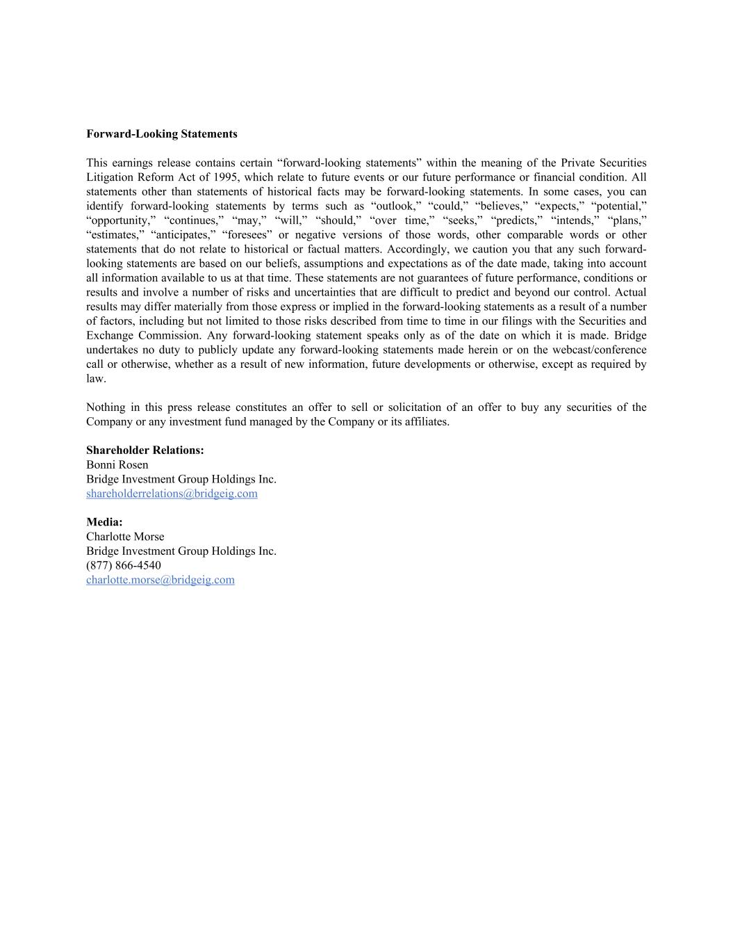 Forward-Looking Statements This earnings release contains certain “forward-looking statements” within the meaning of the Private Securities Litigation Reform Act of 1995, which relate to future events or our future performance or financial condition. All statements other than statements of historical facts may be forward-looking statements. In some cases, you can identify forward-looking statements by terms such as “outlook,” “could,” “believes,” “expects,” “potential,” “opportunity,” “continues,” “may,” “will,” “should,” “over time,” “seeks,” “predicts,” “intends,” “plans,” “estimates,” “anticipates,” “foresees” or negative versions of those words, other comparable words or other statements that do not relate to historical or factual matters. Accordingly, we caution you that any such forward- looking statements are based on our beliefs, assumptions and expectations as of the date made, taking into account all information available to us at that time. These statements are not guarantees of future performance, conditions or results and involve a number of risks and uncertainties that are difficult to predict and beyond our control. Actual results may differ materially from those express or implied in the forward-looking statements as a result of a number of factors, including but not limited to those risks described from time to time in our filings with the Securities and Exchange Commission. Any forward-looking statement speaks only as of the date on which it is made. Bridge undertakes no duty to publicly update any forward-looking statements made herein or on the webcast/conference call or otherwise, whether as a result of new information, future developments or otherwise, except as required by law. Nothing in this press release constitutes an offer to sell or solicitation of an offer to buy any securities of the Company or any investment fund managed by the Company or its affiliates. Shareholder Relations: Bonni Rosen Bridge Investment Group Holdings Inc. shareholderrelations@bridgeig.com Media: Charlotte Morse Bridge Investment Group Holdings Inc. (877) 866-4540 charlotte.morse@bridgeig.com