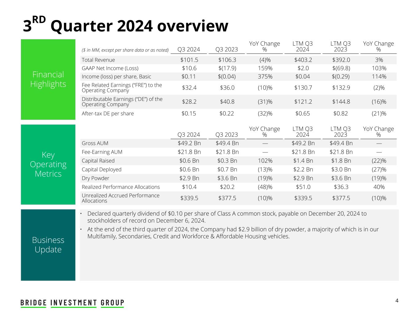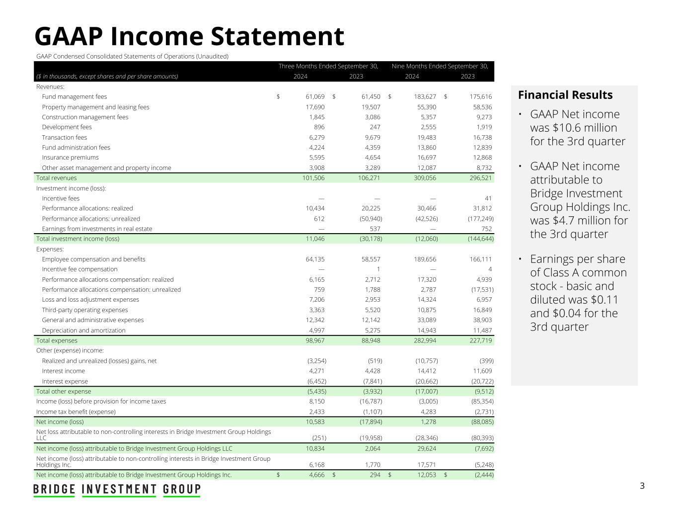 3 GAAP Income Statement GAAP Condensed Consolidated Statements of Operations (Unaudited) Three Months Ended September 30, Nine Months Ended September 30, ($ in thousands, except shares and per share amounts) 2024 2023 2024 2023 Revenues: Fund management fees $ 61,069 $ 61,450 $ 183,627 $ 175,616 Property management and leasing fees 17,690 19,507 55,390 58,536 Construction management fees 1,845 3,086 5,357 9,273 Development fees 896 247 2,555 1,919 Transaction fees 6,279 9,679 19,483 16,738 Fund administration fees 4,224 4,359 13,860 12,839 Insurance premiums 5,595 4,654 16,697 12,868 Other asset management and property income 3,908 3,289 12,087 8,732 Total revenues 101,506 106,271 309,056 296,521 Investment income (loss): Incentive fees — — — 41 Performance allocations: realized 10,434 20,225 30,466 31,812 Performance allocations: unrealized 612 (50,940) (42,526) (177,249) Earnings from investments in real estate — 537 — 752 Total investment income (loss) 11,046 (30,178) (12,060) (144,644) Expenses: Employee compensation and benefits 64,135 58,557 189,656 166,111 Incentive fee compensation — 1 — 4 Performance allocations compensation: realized 6,165 2,712 17,320 4,939 Performance allocations compensation: unrealized 759 1,788 2,787 (17,531) Loss and loss adjustment expenses 7,206 2,953 14,324 6,957 Third-party operating expenses 3,363 5,520 10,875 16,849 General and administrative expenses 12,342 12,142 33,089 38,903 Depreciation and amortization 4,997 5,275 14,943 11,487 Total expenses 98,967 88,948 282,994 227,719 Other (expense) income: Realized and unrealized (losses) gains, net (3,254) (519) (10,757) (399) Interest income 4,271 4,428 14,412 11,609 Interest expense (6,452) (7,841) (20,662) (20,722) Total other expense (5,435) (3,932) (17,007) (9,512) Income (loss) before provision for income taxes 8,150 (16,787) (3,005) (85,354) Income tax benefit (expense) 2,433 (1,107) 4,283 (2,731) Net income (loss) 10,583 (17,894) 1,278 (88,085) Net loss attributable to non-controlling interests in Bridge Investment Group Holdings LLC (251) (19,958) (28,346) (80,393) Net income (loss) attributable to Bridge Investment Group Holdings LLC 10,834 2,064 29,624 (7,692) Net income (loss) attributable to non-controlling interests in Bridge Investment Group Holdings Inc. 6,168 1,770 17,571 (5,248) Net income (loss) attributable to Bridge Investment Group Holdings Inc. $ 4,666 $ 294 $ 12,053 $ (2,444) Financial Results • GAAP Net income was $10.6 million for the 3rd quarter • GAAP Net income attributable to Bridge Investment Group Holdings Inc. was $4.7 million for the 3rd quarter • Earnings per share of Class A common stock - basic and diluted was $0.11 and $0.04 for the 3rd quarter