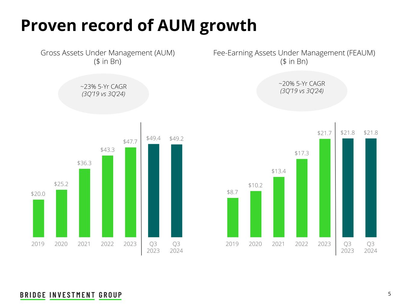 4 Financial Highlights 3RD Quarter 2024 overview Key Operating Metrics Business Update • Declared quarterly dividend of $0.10 per share of Class A common stock, payable on December 20, 2024 to stockholders of record on December 6, 2024. • At the end of the third quarter of 2024, the Company had $2.9 billion of dry powder, a majority of which is in our Multifamily, Secondaries, Credit and Workforce & Affordable Housing vehicles. ($ in MM, except per share data or as noted) Q3 2024 Q3 2023 YoY Change % LTM Q3 2024 LTM Q3 2023 YoY Change % Total Revenue $101.5 $106.3 (4)% $403.2 $392.0 3% GAAP Net Income (Loss) $10.6 $(17.9) 159% $2.0 $(69.8) 103% Income (loss) per share, Basic $0.11 $(0.04) 375% $0.04 $(0.29) 114% Fee Related Earnings (“FRE”) to the Operating Company $32.4 $36.0 (10)% $130.7 $132.9 (2)% Distributable Earnings (“DE”) of the Operating Company $28.2 $40.8 (31)% $121.2 $144.8 (16)% After-tax DE per share $0.15 $0.22 (32)% $0.65 $0.82 (21)% Q3 2024 Q3 2023 YoY Change % LTM Q3 2024 LTM Q3 2023 YoY Change % Gross AUM $49.2 Bn $49.4 Bn — $49.2 Bn $49.4 Bn — Fee-Earning AUM $21.8 Bn $21.8 Bn — $21.8 Bn $21.8 Bn — Capital Raised $0.6 Bn $0.3 Bn 102% $1.4 Bn $1.8 Bn (22)% Capital Deployed $0.6 Bn $0.7 Bn (13)% $2.2 Bn $3.0 Bn (27)% Dry Powder $2.9 Bn $3.6 Bn (19)% $2.9 Bn $3.6 Bn (19)% Realized Performance Allocations $10.4 $20.2 (48)% $51.0 $36.3 40% Unrealized Accrued Performance Allocations $339.5 $377.5 (10)% $339.5 $377.5 (10)%