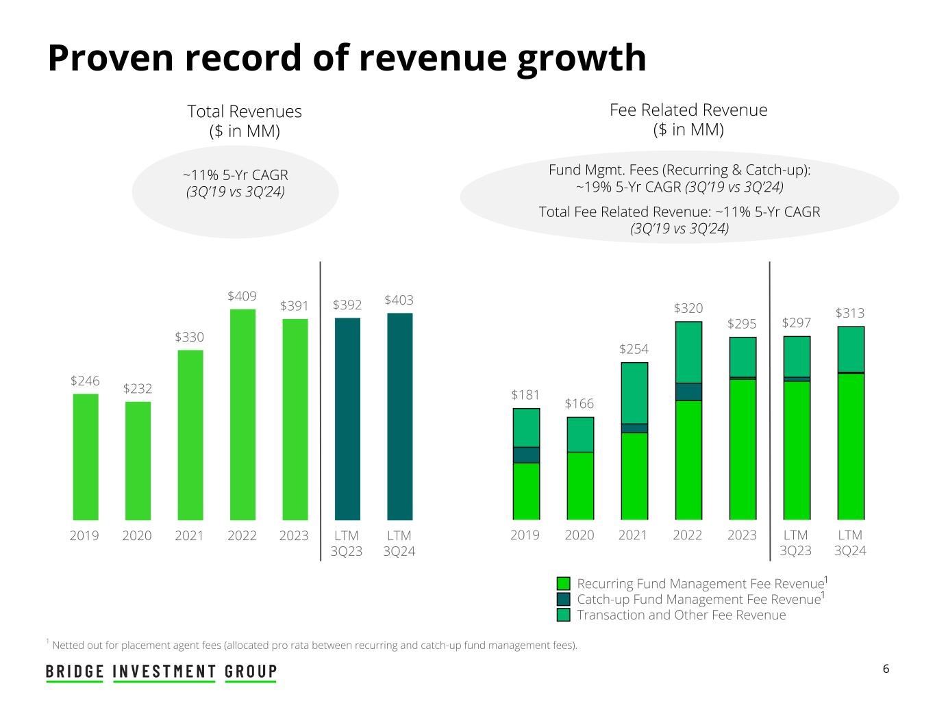 5 $20.0 $25.2 $36.3 $43.3 $47.7 $49.4 $49.2 2019 2020 2021 2022 2023 Q3 2023 Q3 2024 Gross Assets Under Management (AUM) ($ in Bn) Fee-Earning Assets Under Management (FEAUM) ($ in Bn) Proven record of AUM growth ~23% 5-Yr CAGR (3Q’19 vs 3Q’24) $8.7 $10.2 $13.4 $17.3 $21.7 $21.8 $21.8 2019 2020 2021 2022 2023 Q3 2023 Q3 2024 ~20% 5-Yr CAGR (3Q’19 vs 3Q’24)