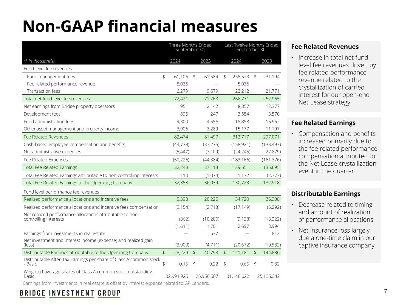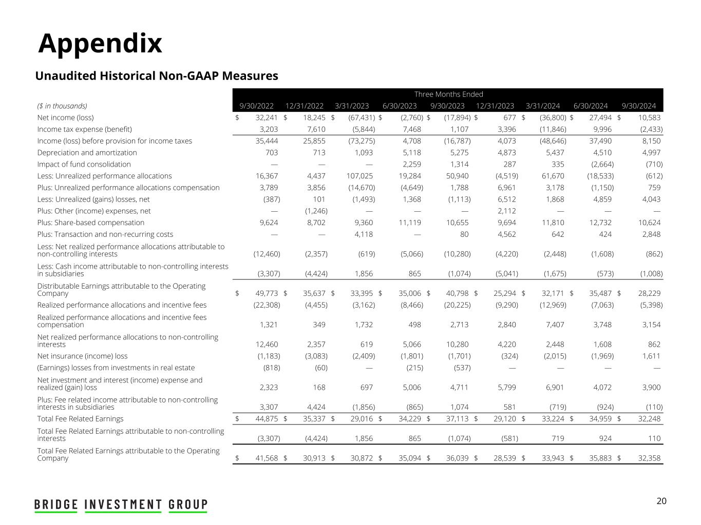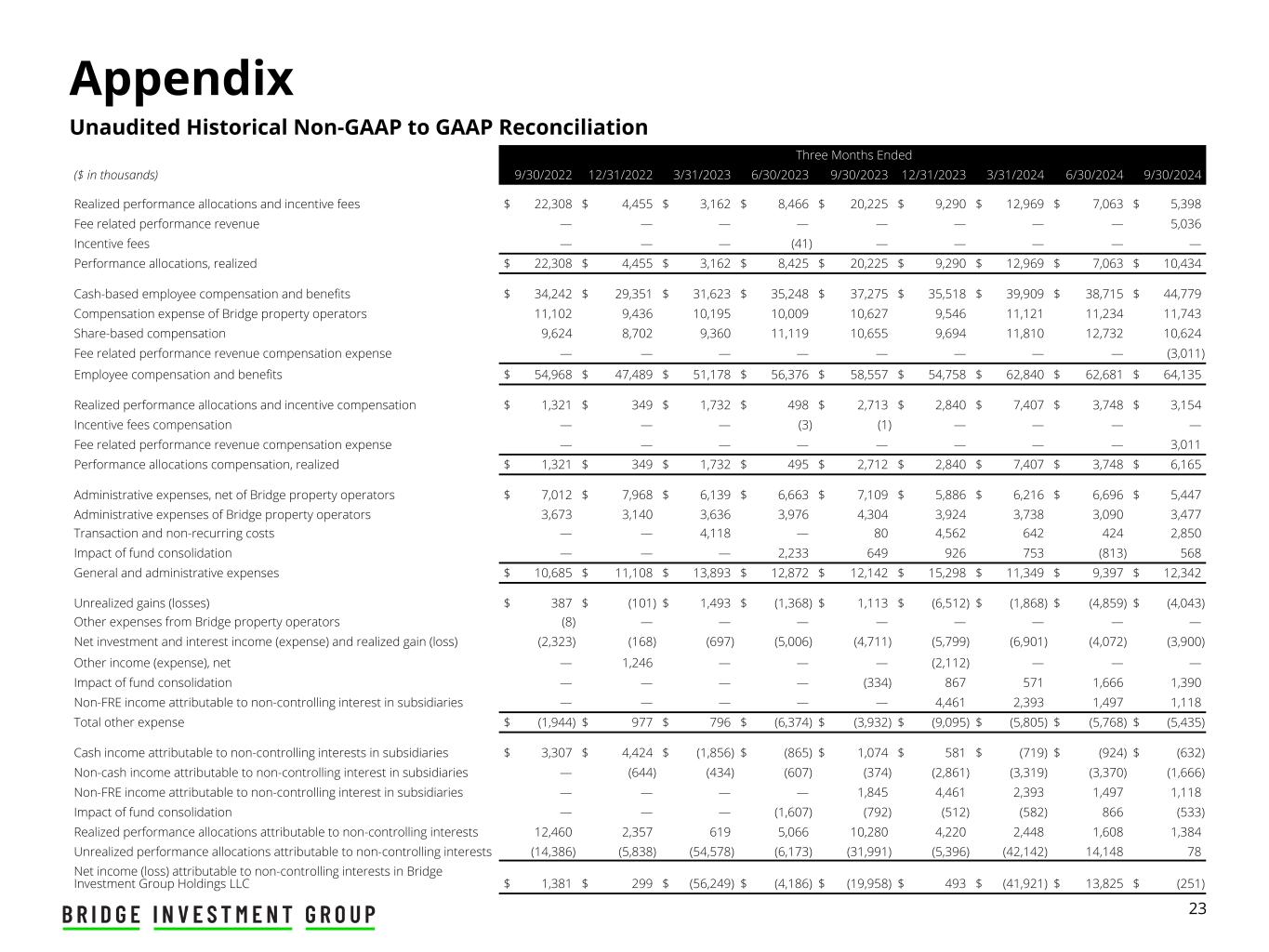 23 Appendix Unaudited Historical Non-GAAP to GAAP Reconciliation Three Months Ended ($ in thousands) 9/30/2022 12/31/2022 3/31/2023 6/30/2023 9/30/2023 12/31/2023 3/31/2024 6/30/2024 9/30/2024 Realized performance allocations and incentive fees $ 22,308 $ 4,455 $ 3,162 $ 8,466 $ 20,225 $ 9,290 $ 12,969 $ 7,063 $ 5,398 Fee related performance revenue — — — — — — — — 5,036 Incentive fees — — — (41) — — — — — Performance allocations, realized $ 22,308 $ 4,455 $ 3,162 $ 8,425 $ 20,225 $ 9,290 $ 12,969 $ 7,063 $ 10,434 Cash-based employee compensation and benefits $ 34,242 $ 29,351 $ 31,623 $ 35,248 $ 37,275 $ 35,518 $ 39,909 $ 38,715 $ 44,779 Compensation expense of Bridge property operators 11,102 9,436 10,195 10,009 10,627 9,546 11,121 11,234 11,743 Share-based compensation 9,624 8,702 9,360 11,119 10,655 9,694 11,810 12,732 10,624 Fee related performance revenue compensation expense — — — — — — — — (3,011) Employee compensation and benefits $ 54,968 $ 47,489 $ 51,178 $ 56,376 $ 58,557 $ 54,758 $ 62,840 $ 62,681 $ 64,135 Realized performance allocations and incentive compensation $ 1,321 $ 349 $ 1,732 $ 498 $ 2,713 $ 2,840 $ 7,407 $ 3,748 $ 3,154 Incentive fees compensation — — — (3) (1) — — — — Fee related performance revenue compensation expense — — — — — — — — 3,011 Performance allocations compensation, realized $ 1,321 $ 349 $ 1,732 $ 495 $ 2,712 $ 2,840 $ 7,407 $ 3,748 $ 6,165 Administrative expenses, net of Bridge property operators $ 7,012 $ 7,968 $ 6,139 $ 6,663 $ 7,109 $ 5,886 $ 6,216 $ 6,696 $ 5,447 Administrative expenses of Bridge property operators 3,673 3,140 3,636 3,976 4,304 3,924 3,738 3,090 3,477 Transaction and non-recurring costs — — 4,118 — 80 4,562 642 424 2,850 Impact of fund consolidation — — — 2,233 649 926 753 (813) 568 General and administrative expenses $ 10,685 $ 11,108 $ 13,893 $ 12,872 $ 12,142 $ 15,298 $ 11,349 $ 9,397 $ 12,342 Unrealized gains (losses) $ 387 $ (101) $ 1,493 $ (1,368) $ 1,113 $ (6,512) $ (1,868) $ (4,859) $ (4,043) Other expenses from Bridge property operators (8) — — — — — — — — Net investment and interest income (expense) and realized gain (loss) (2,323) (168) (697) (5,006) (4,711) (5,799) (6,901) (4,072) (3,900) Other income (expense), net — 1,246 — — — (2,112) — — — Impact of fund consolidation — — — — (334) 867 571 1,666 1,390 Non-FRE income attributable to non-controlling interest in subsidiaries — — — — — 4,461 2,393 1,497 1,118 Total other expense $ (1,944) $ 977 $ 796 $ (6,374) $ (3,932) $ (9,095) $ (5,805) $ (5,768) $ (5,435) Cash income attributable to non-controlling interests in subsidiaries $ 3,307 $ 4,424 $ (1,856) $ (865) $ 1,074 $ 581 $ (719) $ (924) $ (632) Non-cash income attributable to non-controlling interest in subsidiaries — (644) (434) (607) (374) (2,861) (3,319) (3,370) (1,666) Non-FRE income attributable to non-controlling interest in subsidiaries — — — — 1,845 4,461 2,393 1,497 1,118 Impact of fund consolidation — — — (1,607) (792) (512) (582) 866 (533) Realized performance allocations attributable to non-controlling interests 12,460 2,357 619 5,066 10,280 4,220 2,448 1,608 1,384 Unrealized performance allocations attributable to non-controlling interests (14,386) (5,838) (54,578) (6,173) (31,991) (5,396) (42,142) 14,148 78 Net income (loss) attributable to non-controlling interests in Bridge Investment Group Holdings LLC $ 1,381 $ 299 $ (56,249) $ (4,186) $ (19,958) $ 493 $ (41,921) $ 13,825 $ (251)
