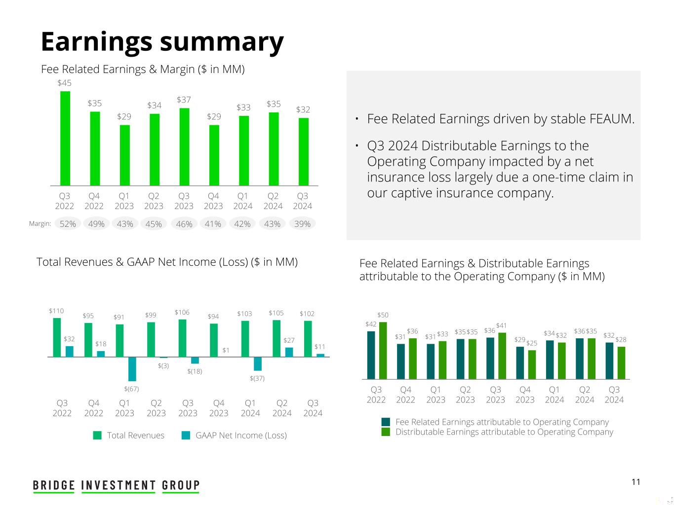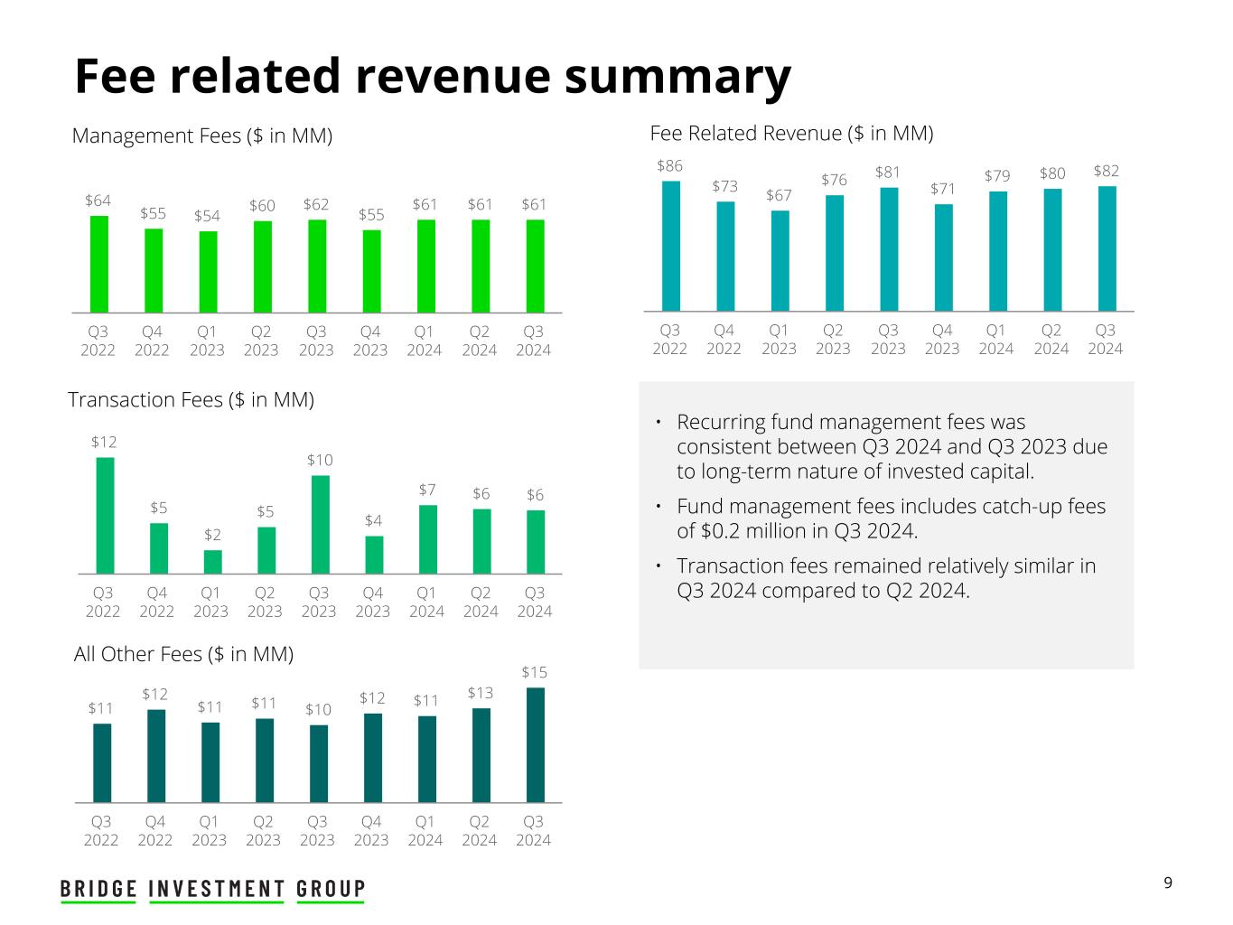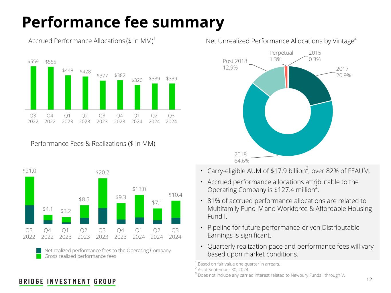 23 Appendix Unaudited Historical Non-GAAP to GAAP Reconciliation Three Months Ended ($ in thousands) 9/30/2022 12/31/2022 3/31/2023 6/30/2023 9/30/2023 12/31/2023 3/31/2024 6/30/2024 9/30/2024 Realized performance allocations and incentive fees $ 22,308 $ 4,455 $ 3,162 $ 8,466 $ 20,225 $ 9,290 $ 12,969 $ 7,063 $ 5,398 Fee related performance revenue — — — — — — — — 5,036 Incentive fees — — — (41) — — — — — Performance allocations, realized $ 22,308 $ 4,455 $ 3,162 $ 8,425 $ 20,225 $ 9,290 $ 12,969 $ 7,063 $ 10,434 Cash-based employee compensation and benefits $ 34,242 $ 29,351 $ 31,623 $ 35,248 $ 37,275 $ 35,518 $ 39,909 $ 38,715 $ 44,779 Compensation expense of Bridge property operators 11,102 9,436 10,195 10,009 10,627 9,546 11,121 11,234 11,743 Share-based compensation 9,624 8,702 9,360 11,119 10,655 9,694 11,810 12,732 10,624 Fee related performance revenue compensation expense — — — — — — — — (3,011) Employee compensation and benefits $ 54,968 $ 47,489 $ 51,178 $ 56,376 $ 58,557 $ 54,758 $ 62,840 $ 62,681 $ 64,135 Realized performance allocations and incentive compensation $ 1,321 $ 349 $ 1,732 $ 498 $ 2,713 $ 2,840 $ 7,407 $ 3,748 $ 3,154 Incentive fees compensation — — — (3) (1) — — — — Fee related performance revenue compensation expense — — — — — — — — 3,011 Performance allocations compensation, realized $ 1,321 $ 349 $ 1,732 $ 495 $ 2,712 $ 2,840 $ 7,407 $ 3,748 $ 6,165 Administrative expenses, net of Bridge property operators $ 7,012 $ 7,968 $ 6,139 $ 6,663 $ 7,109 $ 5,886 $ 6,216 $ 6,696 $ 5,447 Administrative expenses of Bridge property operators 3,673 3,140 3,636 3,976 4,304 3,924 3,738 3,090 3,477 Transaction and non-recurring costs — — 4,118 — 80 4,562 642 424 2,850 Impact of fund consolidation — — — 2,233 649 926 753 (813) 568 General and administrative expenses $ 10,685 $ 11,108 $ 13,893 $ 12,872 $ 12,142 $ 15,298 $ 11,349 $ 9,397 $ 12,342 Unrealized gains (losses) $ 387 $ (101) $ 1,493 $ (1,368) $ 1,113 $ (6,512) $ (1,868) $ (4,859) $ (4,043) Other expenses from Bridge property operators (8) — — — — — — — — Net investment and interest income (expense) and realized gain (loss) (2,323) (168) (697) (5,006) (4,711) (5,799) (6,901) (4,072) (3,900) Other income (expense), net — 1,246 — — — (2,112) — — — Impact of fund consolidation — — — — (334) 867 571 1,666 1,390 Non-FRE income attributable to non-controlling interest in subsidiaries — — — — — 4,461 2,393 1,497 1,118 Total other expense $ (1,944) $ 977 $ 796 $ (6,374) $ (3,932) $ (9,095) $ (5,805) $ (5,768) $ (5,435) Cash income attributable to non-controlling interests in subsidiaries $ 3,307 $ 4,424 $ (1,856) $ (865) $ 1,074 $ 581 $ (719) $ (924) $ (632) Non-cash income attributable to non-controlling interest in subsidiaries — (644) (434) (607) (374) (2,861) (3,319) (3,370) (1,666) Non-FRE income attributable to non-controlling interest in subsidiaries — — — — 1,845 4,461 2,393 1,497 1,118 Impact of fund consolidation — — — (1,607) (792) (512) (582) 866 (533) Realized performance allocations attributable to non-controlling interests 12,460 2,357 619 5,066 10,280 4,220 2,448 1,608 1,384 Unrealized performance allocations attributable to non-controlling interests (14,386) (5,838) (54,578) (6,173) (31,991) (5,396) (42,142) 14,148 78 Net income (loss) attributable to non-controlling interests in Bridge Investment Group Holdings LLC $ 1,381 $ 299 $ (56,249) $ (4,186) $ (19,958) $ 493 $ (41,921) $ 13,825 $ (251)
