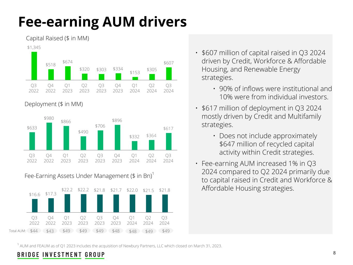 7 Distributable Earnings • Decrease related to timing and amount of realization of performance allocations • Net insurance loss largely due a one-time claim in our captive insurance company Fee Related Earnings • Compensation and benefits increased primarily due to the fee related performance compensation attributed to the Net Lease crystallization event in the quarter Non-GAAP financial measures Three Months Ended September 30, Last Twelve Months Ended September 30, ($ in thousands) 2024 2023 2024 2023 Fund-level fee revenues Fund management fees $ 61,106 $ 61,584 $ 238,523 $ 231,194 Fee related performance revenue 5,036 — 5,036 — Transaction fees 6,279 9,679 23,212 21,771 Total net fund-level fee revenues 72,421 71,263 266,771 252,965 Net earnings from Bridge property operators 951 2,142 8,357 12,377 Development fees 896 247 3,554 3,570 Fund administration fees 4,300 4,556 18,858 16,962 Other asset management and property income 3,906 3,289 15,177 11,197 Fee Related Revenues 82,474 81,497 312,717 297,071 Cash-based employee compensation and benefits (44,779) (37,275) (158,921) (133,497) Net administrative expenses (5,447) (7,109) (24,245) (27,879) Fee Related Expenses (50,226) (44,384) (183,166) (161,376) Total Fee Related Earnings 32,248 37,113 129,551 135,695 Total Fee Related Earnings attributable to non-controlling interests 110 (1,074) 1,172 (2,777) Total Fee Related Earnings to the Operating Company 32,358 36,039 130,723 132,918 Fund level performance fee revenues Realized performance allocations and incentive fees 5,398 20,225 34,720 36,308 Realized performance allocations and incentive fees compensation (3,154) (2,713) (17,149) (5,292) Net realized performance allocations attributable to non- controlling interests (862) (10,280) (9,138) (18,322) (1,611) 1,701 2,697 8,994 Earnings from investments in real estate1 — 537 — 812 Net investment and interest income (expense) and realized gain (loss) (3,900) (4,711) (20,672) (10,582) Distributable Earnings attributable to the Operating Company $ 28,229 $ 40,798 $ 121,181 $ 144,836 Distributable After-Tax Earnings per share of Class A common stock - Basic $ 0.15 $ 0.22 $ 0.65 $ 0.82 Weighted-average shares of Class A common stock outstanding - Basic 32,991,925 25,956,587 31,148,622 25,135,342 1 Earnings from investments in real estate is offset by interest expense related to GP Lenders. Fee Related Revenues • Increase in total net fund- level fee revenues driven by fee related performance revenue related to the crystallization of carried interest for our open-end Net Lease strategy