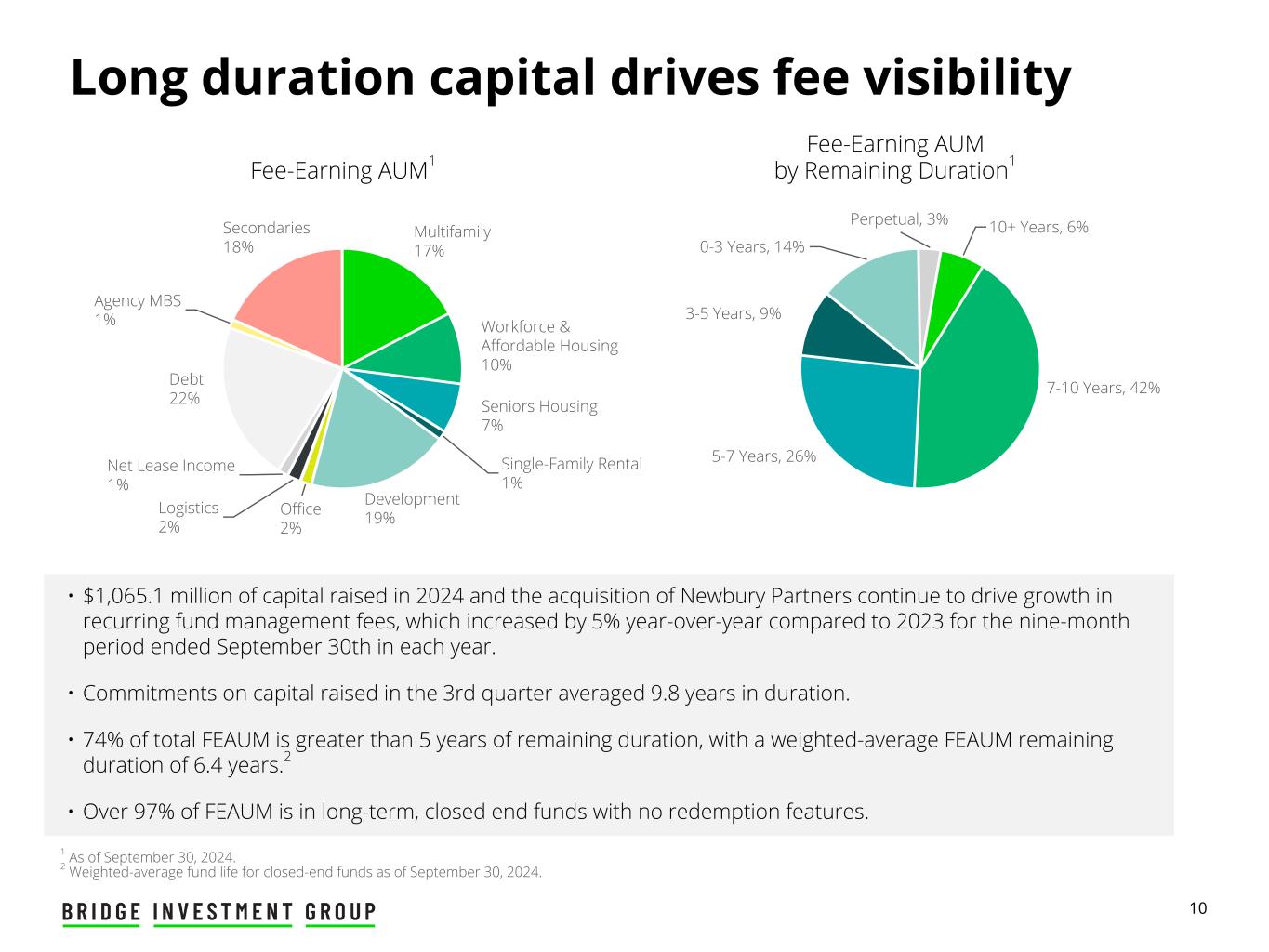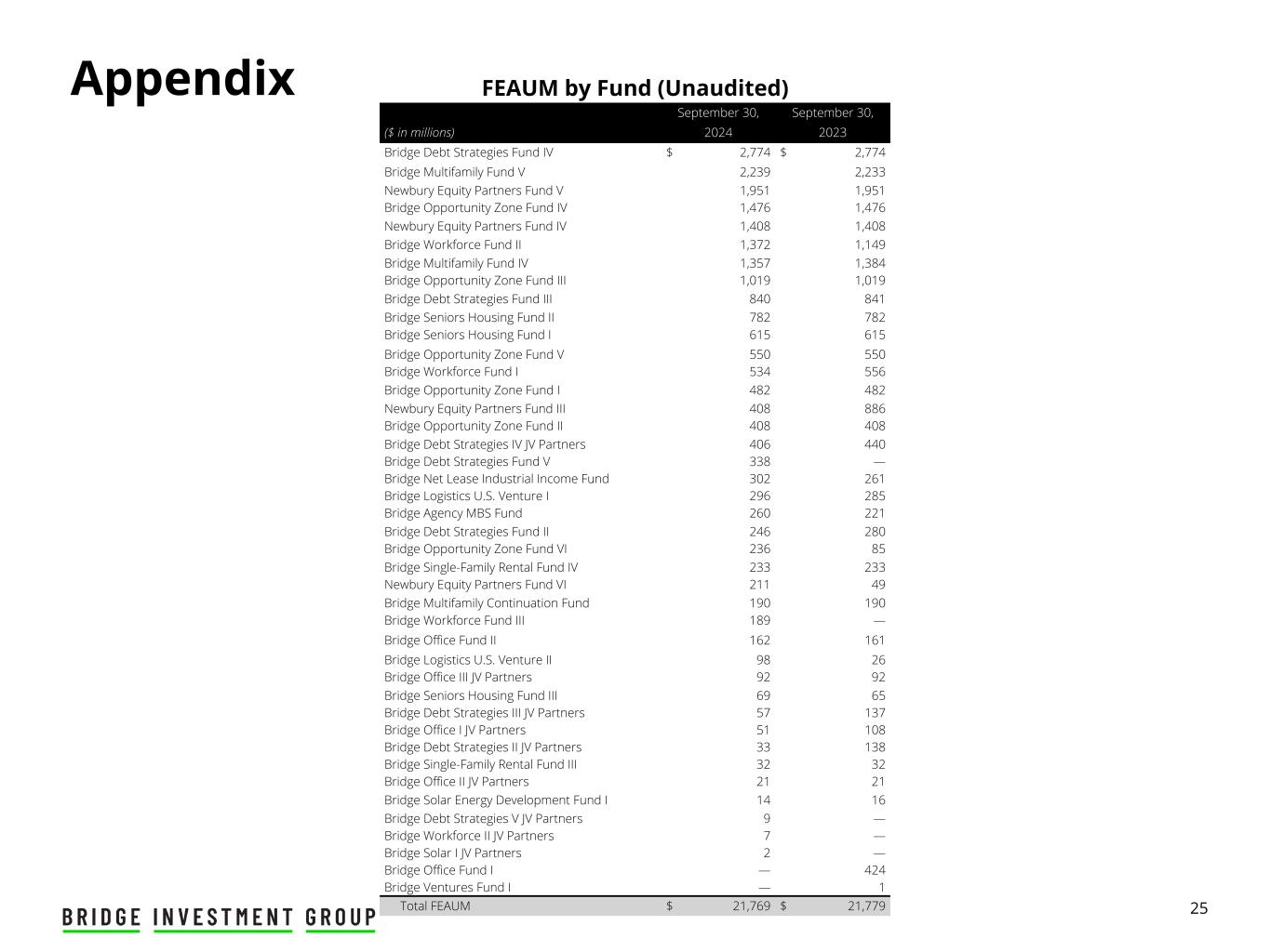 25 Appendix FEAUM by Fund (Unaudited) September 30, September 30, ($ in millions) 2024 2023 Bridge Debt Strategies Fund IV $ 2,774 $ 2,774 Bridge Multifamily Fund V 2,239 2,233 Newbury Equity Partners Fund V 1,951 1,951 Bridge Opportunity Zone Fund IV 1,476 1,476 Newbury Equity Partners Fund IV 1,408 1,408 Bridge Workforce Fund II 1,372 1,149 Bridge Multifamily Fund IV 1,357 1,384 Bridge Opportunity Zone Fund III 1,019 1,019 Bridge Debt Strategies Fund III 840 841 Bridge Seniors Housing Fund II 782 782 Bridge Seniors Housing Fund I 615 615 Bridge Opportunity Zone Fund V 550 550 Bridge Workforce Fund I 534 556 Bridge Opportunity Zone Fund I 482 482 Newbury Equity Partners Fund III 408 886 Bridge Opportunity Zone Fund II 408 408 Bridge Debt Strategies IV JV Partners 406 440 Bridge Debt Strategies Fund V 338 — Bridge Net Lease Industrial Income Fund 302 261 Bridge Logistics U.S. Venture I 296 285 Bridge Agency MBS Fund 260 221 Bridge Debt Strategies Fund II 246 280 Bridge Opportunity Zone Fund VI 236 85 Bridge Single-Family Rental Fund IV 233 233 Newbury Equity Partners Fund VI 211 49 Bridge Multifamily Continuation Fund 190 190 Bridge Workforce Fund III 189 — Bridge Office Fund II 162 161 Bridge Logistics U.S. Venture II 98 26 Bridge Office III JV Partners 92 92 Bridge Seniors Housing Fund III 69 65 Bridge Debt Strategies III JV Partners 57 137 Bridge Office I JV Partners 51 108 Bridge Debt Strategies II JV Partners 33 138 Bridge Single-Family Rental Fund III 32 32 Bridge Office II JV Partners 21 21 Bridge Solar Energy Development Fund I 14 16 Bridge Debt Strategies V JV Partners 9 — Bridge Workforce II JV Partners 7 — Bridge Solar I JV Partners 2 — Bridge Office Fund I — 424 Bridge Ventures Fund I — 1 Total FEAUM $ 21,769 $ 21,779