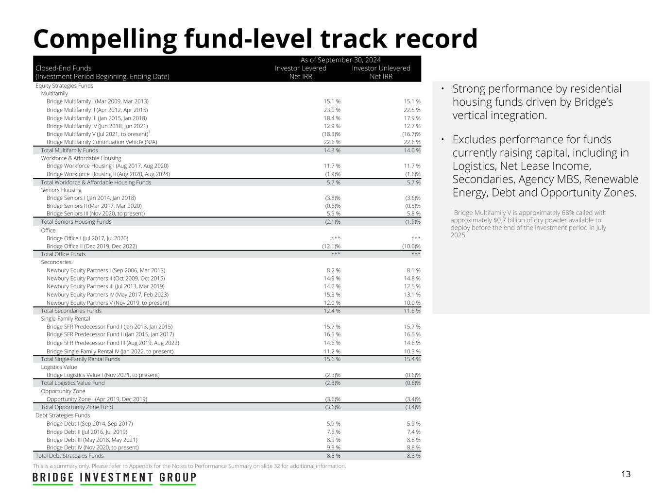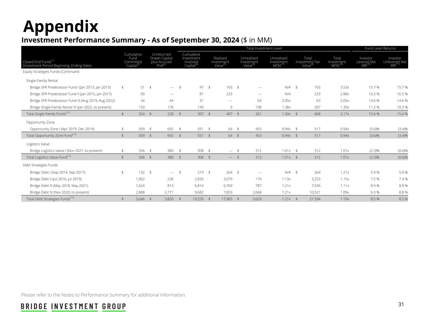 30 Investment Performance Summary - As of September 30, 2024 ($ in MM) Appendix Total Investment-Level Fund-Level Returns Closed-End Funds(1) (Investment Period Beginning, Ending Date) Cumulative Fund Committed Capital(2) Unreturned Drawn Capital plus Accrued Pref(3) Cumulative Investment Invested Capital(4) Realized Investment Value(5) Unrealized Investment Value(6) Unrealized Investment MOIC(7) Total Investment Fair Value(8) Total Investment MOIC(9) Investor Levered Net IRR(10) Investor Unlevered Net IRR(11) Equity Strategies Funds Multifamily Bridge Multifamily I (Mar 2009, Mar 2013) $ 124 $ — $ 150 $ 280 $ — N/A $ 280 1.87x 15.1 % 15.1 % Bridge Multifamily II (Apr 2012, Apr 2015) 596 — 605 1,264 — N/A 1,264 2.09x 23.0 % 22.5 % Bridge Multifamily III (Jan 2015, Jan 2018) 912 — 904 2,004 — N/A 2,004 2.22x 18.4 % 17.9 % Bridge Multifamily IV (Jun 2018, Jun 2021) 1,590 1,665 1,537 566 2,264 1.81x 2,830 1.84x 12.9 % 12.7 % Bridge Multifamily V (Jul 2021, to present) 2,257 1,700 1,355 60 1,015 0.79x 1,075 0.79x (18.3) % (16.7) % Bridge MF Continuation Vehicle (N/A) 201 220 187 4 248 1.34x 252 1.35x 22.6 % 22.6 % Total Multifamily Funds(12) $ 5,680 $ 3,585 $ 4,738 $ 4,179 $ 3,527 1.32x $ 7,706 1.63x 14.3 % 14.0 % Workforce & Affordable Housing Bridge Workforce Housing I (Aug 2017, Aug 2020) $ 619 $ 665 $ 598 $ 239 $ 902 1.84x $ 1,141 1.91x 11.7 % 11.7 % Bridge Workforce Housing II (Aug 2020, Aug 2024) 1,741 1,624 1,403 166 1,302 1.05x 1,468 1.05x (1.9) % (1.6) % Total Workforce & Affordable Housing Funds(12) $ 2,360 $ 2,289 $ 2,001 $ 405 $ 2,204 1.27x $ 2,609 1.30x 5.7 % 5.7 % Secondaries Funds Newbury Equity Partners I (Sep 2006, Mar 2013) $ 702 $ — $ 631 $ 1,039 $ 17 1.63x $ 1,056 1.67x 8.2 % 8.1 % Newbury Equity Partners II (Oct 2009, Oct 2015) 1,024 — 860 1,529 87 1.75x 1,616 1.88x 14.9 % 14.8 % Newbury Equity Partners III (Jul 2013, Mar 2019) 1,102 — 987 1,385 407 1.79x 1,792 1.82x 14.2 % 12.5 % Newbury Equity Partners IV (May 2017, Feb 2023) 1,447 739 1,283 873 1,521 1.90x 2,394 1.87x 15.3 % 13.1 % Newbury Equity Partners V (Nov 2019, to present) 2,000 1,531 1,681 289 2,026 1.37x 2,316 1.38x 12.0 % 10.0 % Total Secondaries Funds(12) $ 6,275 $ 2,270 $ 5,442 $ 5,115 $ 4,058 1.65x $ 9,173 1.69x 12.4 % 11.6 % Seniors Housing Bridge Seniors I (Jan 2014, Jan 2018) $ 578 $ 932 $ 763 $ 461 $ 276 0.84x $ 737 0.97x (3.8) % (3.6) % Bridge Seniors II (Mar 2017, Mar 2020) 820 946 803 339 554 1.13x 893 1.11x (0.6) % (0.5) % Bridge Seniors III (Nov 2020, to present) 48 44 30 5 40 1.49x 45 1.49x 5.9 % 5.8 % Total Seniors Housing Funds(12) $ 1,446 $ 1,922 $ 1,596 $ 805 $ 870 1.02x $ 1,675 1.05x (2.1) % (1.9) % Office Bridge Office I (Jul 2017, Jul 2020) $ 573 $ 769 $ 643 $ 178 $ (62) 0.10x $ 116 0.18x *** *** Bridge Office II (Dec 2019, Dec 2022) 208 239 251 84 124 0.83x 208 0.83x (12.1) % (10.0) % Total Office Funds(12) $ 781 $ 1,008 $ 894 $ 262 $ 62 0.39x $ 324 0.36x *** *** Please refer to the Notes to Performance Summary for additional information.