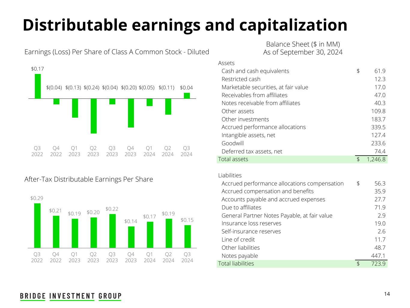 14 $0.17 $0.04 Q3 2022 Q4 2022 Q1 2023 Q2 2023 Q3 2023 Q4 2023 Q1 2024 Q2 2024 Q3 2024 Distributable earnings and capitalization Balance Sheet ($ in MM) As of September 30, 2024 After-Tax Distributable Earnings Per Share $0.29 $0.21 $0.19 $0.20 $0.22 $0.14 $0.17 $0.19 $0.15 Q3 2022 Q4 2022 Q1 2023 Q2 2023 Q3 2023 Q4 2023 Q1 2024 Q2 2024 Q3 2024 Assets Cash and cash equivalents $ 61.9 Restricted cash 12.3 Marketable securities, at fair value 17.0 Receivables from affiliates 47.0 Notes receivable from affiliates 40.3 Other assets 109.8 Other investments 183.7 Accrued performance allocations 339.5 Intangible assets, net 127.4 Goodwill 233.6 Deferred tax assets, net 74.4 Total assets $ 1,246.8 Liabilities Accrued performance allocations compensation $ 56.3 Accrued compensation and benefits 35.9 Accounts payable and accrued expenses 27.7 Due to affiliates 71.9 General Partner Notes Payable, at fair value 2.9 Insurance loss reserves 19.0 Self-insurance reserves 2.6 Line of credit 11.7 Other liabilities 48.7 Notes payable 447.1 Total liabilities $ 723.9 Earnings (Loss) Per Share of Class A Common Stock - Diluted $(0.13) $(0.24) $(0.04)$(0.04) $(0.20) $(0.05) $(0.11)