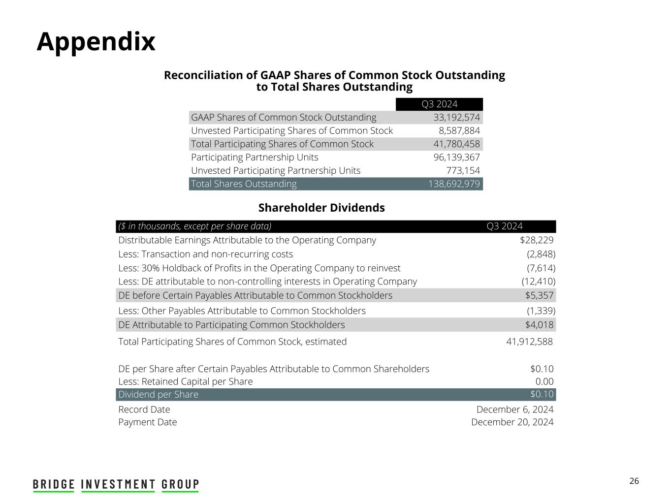 22 Appendix Unaudited Historical Reconciliation of Non-GAAP Distributable Earnings per Share Three Months Ended ($ in thousands, except per share and per share amounts) 9/30/2022 12/31/2022 3/31/2023 6/30/2023 9/30/2023 12/31/2023 3/31/2024 6/30/2024 9/30/2024 Numerator: Distributable Earnings ("DE") attributable to the Operating Company $ 49,773 $ 35,637 $ 33,395 $ 35,006 $ 40,798 $ 25,294 $ 32,171 $ 35,487 $ 28,229 Less: DE attributable to non-controlling interests in the Operating Company (38,451) (27,488) (25,230) (26,436) (30,665) (18,704) (22,734) (24,812) (19,723) DE attributable to Bridge Investment Group Holdings Inc. 11,322 8,149 8,165 8,570 10,133 6,590 9,437 10,675 8,506 Less: Income allocated to participating Restricted Shares (1,969) (1,405) (1,917) (1,998) (2,393) (1,445) (2,177) (2,372) (1,796) DE available to common shareholders 9,353 6,744 6,248 6,572 7,740 5,145 7,260 8,303 6,710 Income tax benefit (expense) (2,338) (1,686) (1,562) (1,643) (1,935) (1,286) (1,815) (2,076) (1,678) After-tax DE available to common shareholders $ 7,015 $ 5,058 $ 4,686 $ 4,929 $ 5,805 $ 3,859 $ 5,445 $ 6,227 $ 5,032 Denominator: Weighted-average shares of Class A Common stock outstanding - Basic 24,157,236 24,373,172 25,068,319 25,143,289 25,956,587 27,798,236 31,342,979 32,461,347 32,991,925 After-Tax Non-GAAP Distributable Earnings Per Share $ 0.29 $ 0.21 $ 0.19 $ 0.20 $ 0.22 $ 0.14 $ 0.17 $ 0.19 $ 0.15