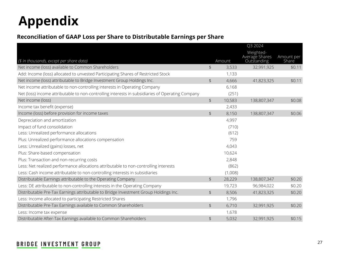 27 Appendix Reconciliation of GAAP Loss per Share to Distributable Earnings per Share Q3 2024 ($ in thousands, except per share data) Amount Weighted- Average Shares Outstanding Amount per Share Net income (loss) available to Common Shareholders $ 3,533 32,991,925 $0.11 Add: Income (loss) allocated to unvested Participating Shares of Restricted Stock 1,133 Net income (loss) attributable to Bridge Investment Group Holdings Inc. $ 4,666 41,823,325 $0.11 Net income attributable to non-controlling interests in Operating Company 6,168 Net (loss) income attributable to non-controlling interests in subsidiaries of Operating Company (251) Net income (loss) $ 10,583 138,807,347 $0.08 Income tax benefit (expense) 2,433 Income (loss) before provision for income taxes $ 8,150 138,807,347 $0.06 Depreciation and amortization 4,997 Impact of fund consolidation (710) Less: Unrealized performance allocations (612) Plus: Unrealized performance allocations compensation 759 Less: Unrealized (gains) losses, net 4,043 Plus: Share-based compensation 10,624 Plus: Transaction and non-recurring costs 2,848 Less: Net realized performance allocations attributable to non-controlling interests (862) Less: Cash income attributable to non-controlling interests in subsidiaries (1,008) Distributable Earnings attributable to the Operating Company $ 28,229 138,807,347 $0.20 Less: DE attributable to non-controlling interests in the Operating Company 19,723 96,984,022 $0.20 Distributable Pre-Tax Earnings attributable to Bridge Investment Group Holdings Inc. $ 8,506 41,823,325 $0.20 Less: Income allocated to participating Restricted Shares 1,796 Distributable Pre-Tax Earnings available to Common Shareholders $ 6,710 32,991,925 $0.20 Less: Income tax expense 1,678 Distributable After-Tax Earnings available to Common Shareholders $ 5,032 32,991,925 $0.15