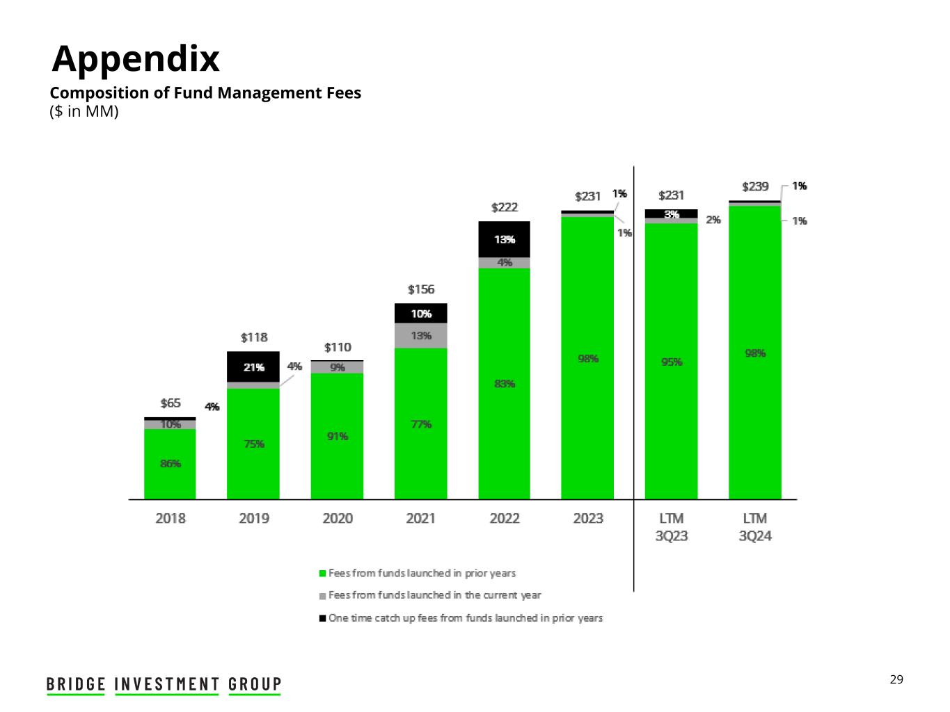 28 Appendix Profits Interests • 2019 profits interests converted on January 1, 2022 • 2020 profits interests converted on January 1, 2023 • 2021 profits interests converted on July 1, 2023 • Resulted in a reduction in non-controlling interest and an increase in Net Income to the Operating Company. • Resulted in an increase in share count; however, expected to be antidilutive to public shareholders. Performance Income • The Operating Company receives 24% to 40% of the gross performance allocations. Non-Controlling Interests ($ in thousands) For Three Months Ended September 30, 2024 NON-GAAP FINANCIAL MEASURES Total Fund Management Performance income Fund-level fee revenues Fund management fees $ 61,106 $ 61,106 $ — Fee related performance revenue 5,036 — 5,036 Transaction fees 6,279 6,279 — Total net fund-level fee revenues 72,421 67,385 5,036 Net earnings from Bridge property operators 951 951 — Development fees 896 896 — Fund administration fees 4,300 4,300 — Other asset management and property income 3,906 3,906 — Fee Related Revenues 82,474 77,438 5,036 Cash-based employee compensation and benefits (44,779) (41,768) (3,011) Net administrative expenses (5,447) (5,447) — Fee Related Expenses (50,226) (47,215) (3,011) Total Fee Related Earnings 32,248 30,223 2,025 Total Fee Related Earnings attributable to non-controlling interests 110 632 (522) Total Fee Related Earnings to the Operating Company 32,358 30,855 1,503 Realized performance allocations and incentive fees 5,398 — 5,398 Realized performance allocations and incentive fees compensation (3,154) — (3,154) Net realized performance allocations attributable to non-controlling interests (862) — (862) Net insurance income (1,611) (1,611) — Earnings from investments in real estate — — — Net investment and interest income (expense) and realized gain (loss) (3,900) (3,900) — Distributable Earnings Attributable to the Operating Company $ 28,229 $ 25,344 $ 2,885