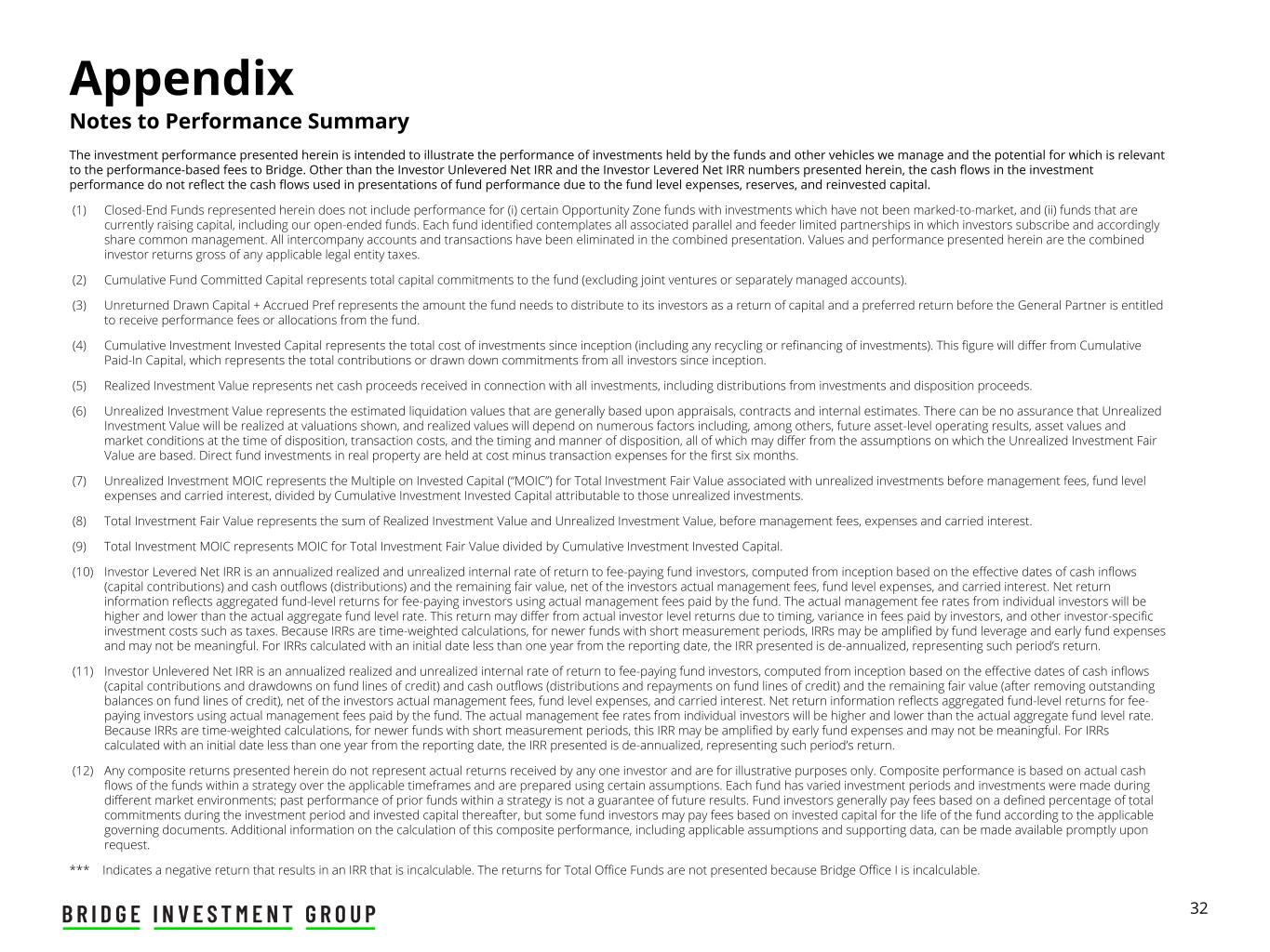 31 Investment Performance Summary - As of September 30, 2024 ($ in MM) Appendix Total Investment-Level Fund-Level Returns Closed-End Funds(1) (Investment Period Beginning, Ending Date) Cumulative Fund Committed Capital(2) Unreturned Drawn Capital plus Accrued Pref(3) Cumulative Investment Invested Capital(4) Realized Investment Value(5) Unrealized Investment Value(6) Unrealized Investment MOIC(7) Total Investment Fair Value(8) Total Investment MOIC(9) Investor Levered Net IRR(10) Investor Unlevered Net IRR(11) Equity Strategies Funds (Continued) Single-Family Rental Bridge SFR Predecessor Fund I (Jan 2013, Jan 2015) $ 51 $ — $ 47 $ 165 $ — N/A $ 165 3.53x 15.7 % 15.7 % Bridge SFR Predecessor Fund II (Jan 2015, Jan 2017) 90 — 81 233 — N/A 233 2.88x 16.5 % 16.5 % Bridge SFR Predecessor Fund III (Aug 2019, Aug 2022) 34 44 31 — 63 2.05x 63 2.05x 14.6 % 14.6 % Bridge Single-Family Rental IV (Jan 2022, to present) 150 176 149 9 198 1.38x 207 1.39x 11.2 % 10.3 % Total Single Family Funds(12) $ 324 $ 220 $ 307 $ 407 $ 261 1.50x $ 668 2.17x 15.6 % 15.4 % Opportunity Zone Opportunity Zone I (Apr 2019, Dec 2019) $ 509 $ 692 $ 551 $ 64 $ 453 0.94x $ 517 0.94x (3.6) % (3.4) % Total Opportunity Zone Fund(12) $ 509 $ 692 $ 551 $ 64 $ 453 0.94x $ 517 0.94x (3.6) % (3.4) % Logistics Value Bridge Logistics Value I (Nov 2021, to present) $ 336 $ 380 $ 308 $ — $ 312 1.01x $ 312 1.01x (2.3) % (0.6) % Total Logistics Value Fund(12) $ 336 $ 380 $ 308 $ — $ 312 1.01x $ 312 1.01x (2.3) % (0.6) % Debt Strategies Funds Bridge Debt I (Sep 2014, Sep 2017) $ 132 $ — $ 219 $ 264 $ — N/A $ 264 1.21x 5.9 % 5.9 % Bridge Debt II (Jul 2016, Jul 2019) 1,002 236 2,835 3,079 174 1.13x 3,253 1.15x 7.5 % 7.4 % Bridge Debt III (May 2018, May 2021) 1,624 813 6,814 6,769 787 1.21x 7,556 1.11x 8.9 % 8.8 % Bridge Debt IV (Nov 2020, to present) 2,888 2,771 9,682 7,853 2,668 1.21x 10,521 1.09x 9.3 % 8.8 % Total Debt Strategies Funds(12) $ 5,646 $ 3,820 $ 19,550 $ 17,965 $ 3,629 1.21x $ 21,594 1.10x 8.5 % 8.3 % Please refer to the Notes to Performance Summary for additional information.