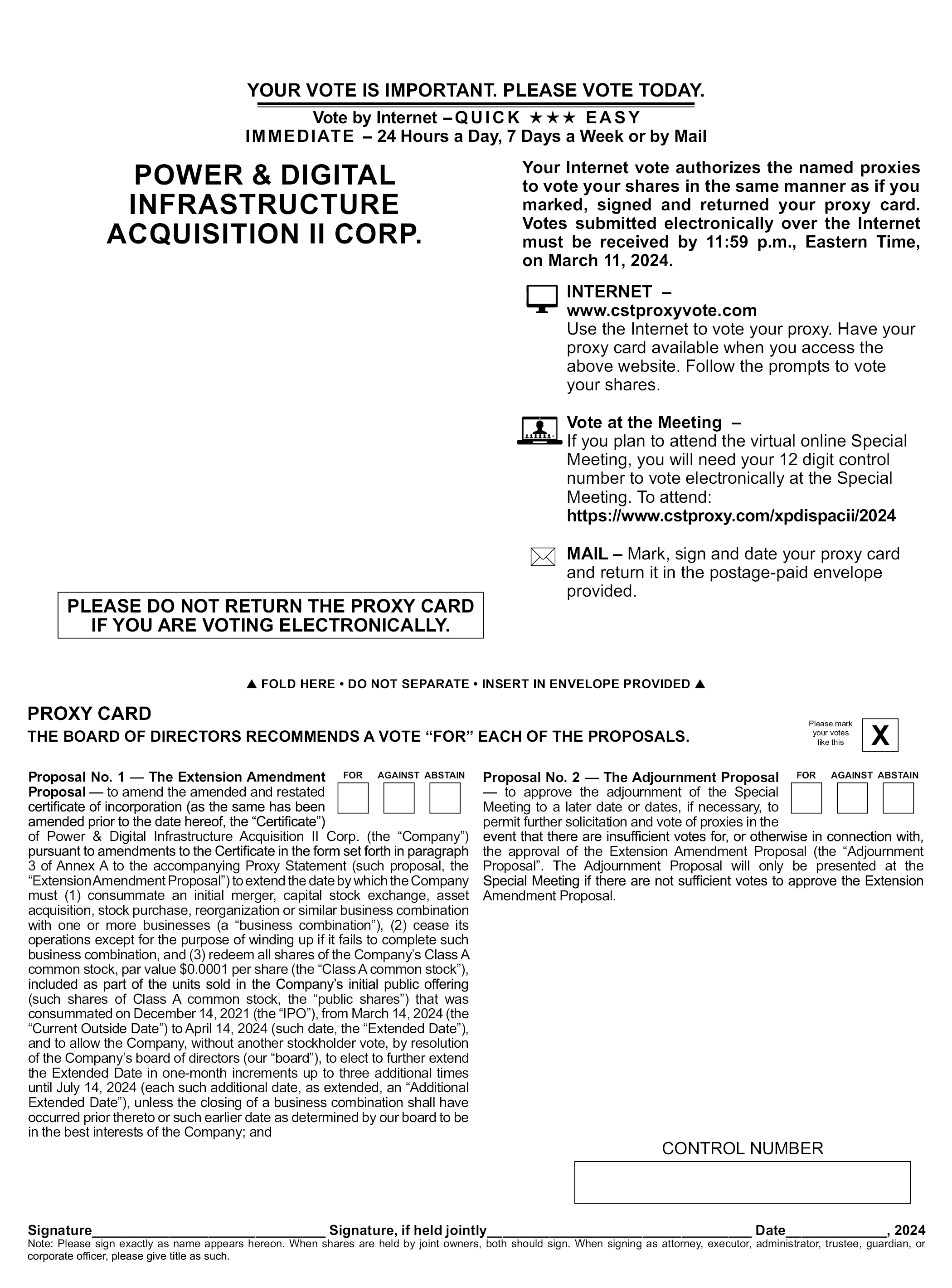 YOUR VOTE IS IMPORTANT. PLEASE VOTE TODAY Vote by Internet - QUICK EASY IMMEDIATE - 24 Hours a Day, 7 Days a Week or by Mail POWER & DIGITAL INFRASTRUCTURE ACQUISITION II CORP. Your Internet vote authorizes the named proxies to vote your shares in the same manner as if you marked, signed and returned your proxy card. Votes submitted electronically over the Internet must be received by 11:59 p.m., Eastern Time, on March 11, 2024. INTERNET – www.cstproxyvote.com Use the Internet to vote your proxy. Have your proxy card available when you access the above website. Follow the prompts to vote your shares. Vote at the Meeting – If you plan to attend the virtual online Special Meeting, you will need your 12 digit control number to vote electronically at the Special Meeting. To attend: https://www.cstproxy.com/xpdispacii/2024 MAIL – Mark, sign and date your proxy card and return it in the postage-paid envelope provided. PLEASE DO NOT RETURN THE PROXY CARD IF YOU ARE VOTING ELECTRONICALLY FOLD HERE DO NOT SEPARATE INSERT IN ENVELOPE PROVIDED PROXY CARD THE BOARD OF DIRECTORS RECOMMENDS A VOTE “FOR” EACH OF THE PROPOSALS. Please mark your votes like this FOR AGAINST ABSTAIN Proposal No. 1 — The Extension Amendment Proposal — to amend the amended and restated certificate of incorporation (as the same has been amended prior to the date hereof, the “Certificate”) of Power & Digital Infrastructure Acquisition II Corp. (the “Company”) pursuant to amendments to the Certificate in the form set forth in paragraph 3 of Annex A to the accompanying Proxy Statement (such proposal, the “Extension Amendment Proposal”) to extend the date by which the Company must (1) consummate an initial merger, capital stock exchange, asset acquisition, stock purchase, reorganization or similar business combination with one or more businesses (a “business combination”), (2) cease its operations except for the purpose of winding up if it fails to complete such business combination, and (3) redeem all shares of the Company’s Class A common stock, par value $0.0001 per share (the “Class A common stock”), included as part of the units sold in the Company’s initial public offering (such shares of Class A common stock, the “public shares”) that was consummated on December 14, 2021 (the “IPO”), from March 14, 2024 (the “Current Outside Date”) to April 14, 2024 (such date, the “Extended Date”), and to allow the Company, without another stockholder vote, by resolution of the Company’s board of directors (our “board”), to elect to further extend the Extended Date in one-month increments up to three additional times until July 14, 2024 (each such additional date, as extended, an “Additional Extended Date”), unless the closing of a business combination shall have occurred prior thereto or such earlier date as determined by our board to be in the best interests of the Company; and Proposal No. 2 — The Adjournment Proposal FOR AGAINST ABSTAIN — to approve the adjournment of the Special Meeting to a later date or dates, if necessary, to permit further solicitation and vote of proxies in the event that there are insufficient votes for, or otherwise in connection with, the approval of the Extension Amendment Proposal (the “Adjournment Proposal”. The Adjournment Proposal will only be presented at the Special Meeting if there are not sufficient votes to approve the Extension Amendment Proposal. CONTROL NUMBER Signature______________________________ Signature, if held jointly__________________________________ Date_____________, 2024 Note: Please sign exactly as name appears hereon. When shares are held by joint owners, both should sign. When signing as attorney, executor, administrator, trustee, guardian, or corporate officer, please give title as such.