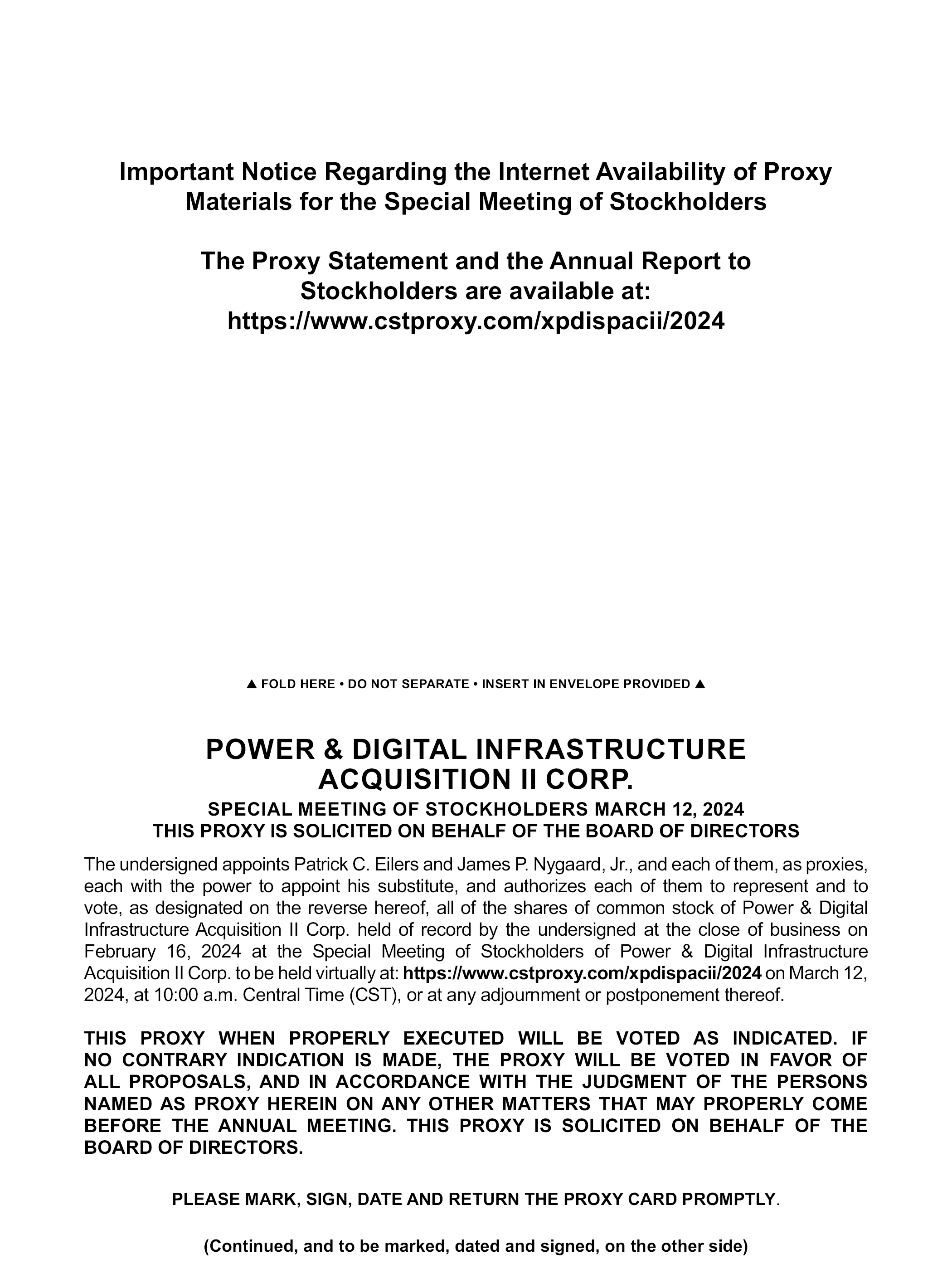 Important Notice Regarding the Internet Availability of Proxy Materials for the Special Meeting of Stockholders The Proxy Statement and the Annual Report to Stockholders are available at: https://www.cstproxy.com/xpdispacii/2024 FOLD HERE DO NOT SEPARATE INSERT IN ENVELOPE PROVIDED POWER & DIGITAL INFRASTRUCTURE ACQUISITION II CORP. SPECIAL MEETING OF STOCKHOLDERS MARCH 12, 2024 THIS PROXY IS SOLICITED ON BEHALF OF THE BOARD OF DIRECTORS The undersigned appoints Patrick C. Eilers and James P. Nygaard, Jr., and each of them, as proxies, each with the power to appoint his substitute, and authorizes each of them to represent and to vote, as designated on the reverse hereof, all of the shares of common stock of Power & Digital Infrastructure Acquisition II Corp. held of record by the undersigned at the close of business on February 16, 2024 at the Special Meeting of Stockholders of Power & Digital Infrastructure Acquisition II Corp. to be held virtually at: https://www.cstproxy.com/xpdispacii/2024 on March 12, 2024, at 10:00 a.m. Central Time (CST), or at any adjournment or postponement thereof. THIS PROXY WHEN PROPERLY EXECUTED WILL BE VOTED AS INDICATED. IF NO CONTRARY INDICATION IS MADE, THE PROXY WILL BE VOTED IN FAVOR OF ALL PROPOSALS, AND IN ACCORDANCE WITH THE JUDGMENT OF THE PERSONS NAMED AS PROXY HEREIN ON ANY OTHER MATTERS THAT MAY PROPERLY COME BEFORE THE ANNUAL MEETING. THIS PROXY IS SOLICITED ON BEHALF OF THE BOARD OF DIRECTORS. PLEASE MARK, SIGN, DATE AND RETURN THE PROXY CARD PROMPTLY. (Continued, and to be marked, dated and signed, on the other side)