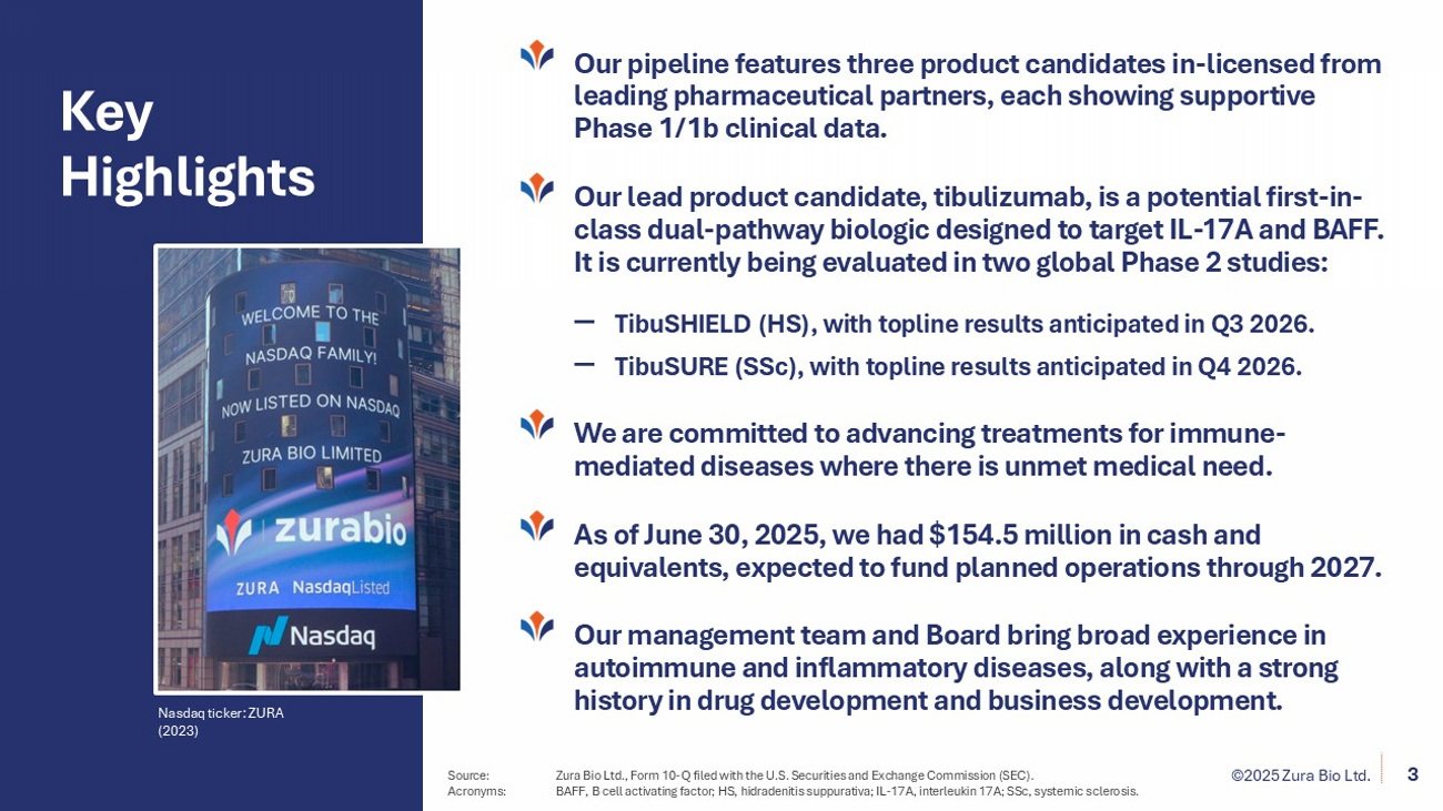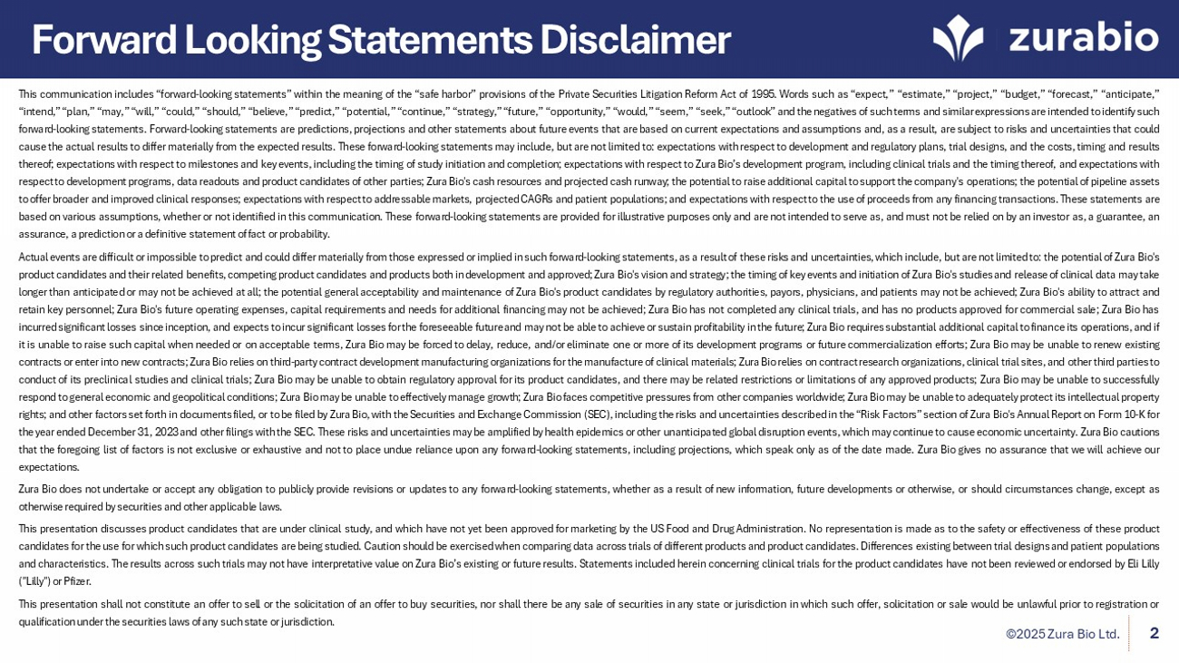 ©2025 Zura Bio Ltd. 2 Forward Looking Statements Disclaimer This communication includes “forward - looking statements” within the meaning of the “safe harbor” provisions of the Private Securities Litigation Reform Act of 1995 . Words such as “expect,” “estimate,” “project,” “budget,” “forecast,” “anticipate,” “intend,” “plan,” “may,” “will,” “could,” “should,” “believe,” “predict,” “potential,” “continue,” “strategy,” “future,” “opportunity,” “would,” “seem,” “seek,” “outlook” and the negatives of such terms and similar expressions are intended to identify such forward - looking statements . Forward - looking statements are predictions, projections and other statements about future events that are based on current expectations and assumptions and, as a result, are subject to risks and uncertainties that could cause the actual results to differ materially from the expected results . These forward - looking statements may include, but are not limited to : expectations with respect to development and regulatory plans, trial designs, and the costs, timing and results thereof ; expectations with respect to milestones and key events, including the timing of study initiation and completion ; expectations with respect to Zura Bio’s development program, including clinical trials and the timing thereof, and expectations with respect to development programs, data readouts and product candidates of other parties ; Zura Bio's cash resources and projected cash runway ; the potential to raise additional capital to support the company's operations ; the potential of pipeline assets to offer broader and improved clinical responses ; expectations with respect to addressable markets, projected CAGRs and patient populations ; and expectations with respect to the use of proceeds from any financing transactions . These statements are based on various assumptions, whether or not identified in this communication . These forward - looking statements are provided for illustrative purposes only and are not intended to serve as, and must not be relied on by an investor as, a guarantee, an assurance, a prediction or a definitive statement of fact or probability . Actual events are difficult or impossible to predict and could differ materially from those expressed or implied in such forward - looking statements, as a result of these risks and uncertainties, which include, but are not limited to : the potential of Zura Bio's product candidates and their related benefits, competing product candidates and products both in development and approved ; Zura Bio's vision and strategy ; the timing of key events and initiation of Zura Bio's studies and release of clinical data may take longer than anticipated or may not be achieved at all ; the potential general acceptability and maintenance of Zura Bio's product candidates by regulatory authorities, payors, physicians, and patients may not be achieved ; Zura Bio's ability to attract and retain key personnel ; Zura Bio's future operating expenses, capital requirements and needs for additional financing may not be achieved ; Zura Bio has not completed any clinical trials, and has no products approved for commercial sale ; Zura Bio has incurred significant losses since inception, and expects to incur significant losses for the foreseeable future and may not be able to achieve or sustain profitability in the future ; Zura Bio requires substantial additional capital to finance its operations, and if it is unable to raise such capital when needed or on acceptable terms, Zura Bio may be forced to delay, reduce, and/or eliminate one or more of its development programs or future commercialization efforts ; Zura Bio may be unable to renew existing contracts or enter into new contracts ; Zura Bio relies on third - party contract development manufacturing organizations for the manufacture of clinical materials ; Zura Bio relies on contract research organizations, clinical trial sites, and other third parties to conduct of its preclinical studies and clinical trials ; Zura Bio may be unable to obtain regulatory approval for its product candidates, and there may be related restrictions or limitations of any approved products ; Zura Bio may be unable to successfully respond to general economic and geopolitical conditions ; Zura Bio may be unable to effectively manage growth ; Zura Bio faces competitive pressures from other companies worldwide ; Zura Bio may be unable to adequately protect its intellectual property rights ; and other factors set forth in documents filed, or to be filed by Zura Bio, with the Securities and Exchange Commission (SEC), including the risks and uncertainties described in the “Risk Factors” section of Zura Bio's Annual Report on Form 10 - K for the year ended December 31 , 2023 and other filings with the SEC . These risks and uncertainties may be amplified by health epidemics or other unanticipated global disruption events, which may continue to cause economic uncertainty . Zura Bio cautions that the foregoing list of factors is not exclusive or exhaustive and not to place undue reliance upon any forward - looking statements, including projections, which speak only as of the date made . Zura Bio gives no assurance that we will achieve our expectations . Zura Bio does not undertake or accept any obligation to publicly provide revisions or updates to any forward - looking statements, whether as a result of new information, future developments or otherwise, or should circumstances change, except as otherwise required by securities and other applicable laws . This presentation discusses product candidates that are under clinical study, and which have not yet been approved for marketing by the US Food and Drug Administration . No representation is made as to the safety or effectiveness of these product candidates for the use for which such product candidates are be