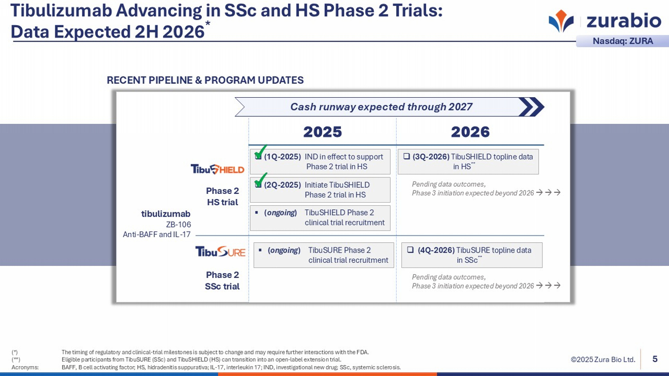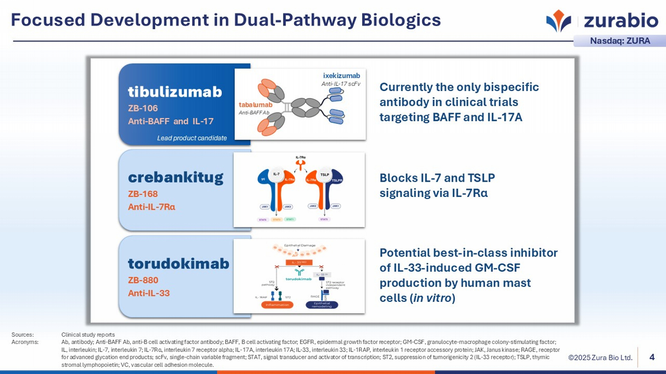 ©2025 Zura Bio Ltd. 3 Our pipeline features three product candidates in - licensed from leading pharmaceutical partners, each showing supportive Phase 1/1b clinical data. Our lead product candidate, tibulizumab, is a potential first - in - class dual - pathway biologic designed to target IL - 17A and BAFF. It is currently being evaluated in two global Phase 2 studies: – TibuSHIELD (HS), with topline results anticipated in Q3 2026. – TibuSURE (SSc), with topline results anticipated in Q4 2026. We are committed to advancing treatments for immune - mediated diseases where there is unmet medical need. As of June 30, 2025, we had $154.5 million in cash and equivalents, expected to fund planned operations through 2027. Our management team and Board bring broad experience in autoimmune and inflammatory diseases, along with a strong history in drug development and business development. Source: Zura Bio Ltd., Form 10 - Q filed with the U.S. Securities and Exchange Commission (SEC). Acronyms: BAFF, B cell activating factor; HS, hidradenitis suppurativa; IL - 17A, interleukin 17A; SSc, systemic sclerosis. Nasdaq ticker: ZURA (2023) Key Highlights