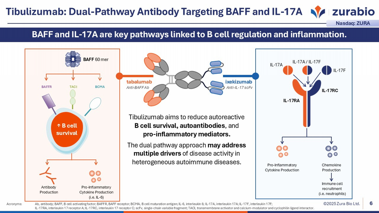 ©2025 Zura Bio Ltd. Tibulizumab: Dual - Pathway Antibody Targeting BAFF and IL - 17A Acronyms: Ab, antibody; BAFF, B cell activating factor; BAFFR, BAFF receptor; BCMA, B cell maturation antigen; IL - 6, interleukin 6; IL - 17A, interleukin 17A; IL - 17F, interleukin 17F; IL - 17RA, interleukin 17 receptor A; IL - 17RC, interleukin 17 receptor C; scFv, single - chain variable fragment; TACI, transmembra ne activator and calcium - modulator and cyclophilin ligand interactor. 6 BAFF and IL - 17A are key pathways linked to B cell regulation and inflammation. ixekizumab Anti - IL - 17 scFv tabalumab Anti - BAFF Ab Pro - Inf lammatory Cytokine Production Chemokine Production BAFF 60 mer ↑ B cell survival BCMA TACI BAFFR Antibody Production Pro - Inflammatory Cytokine Production (i.e. IL - 6) IL - 17RC IL - 17RA IL - 17A IL - 17A / IL - 17F IL - 17F Immune cell recruitment (i.e. neutrophils) Tibulizumab aims to reduce autoreactive B cell survival, autoantibodies , and pro - inflammatory mediators . The dual pathway approach may address multiple drivers of disease activity in heterogeneous autoimmune diseases. Nasdaq: ZURA