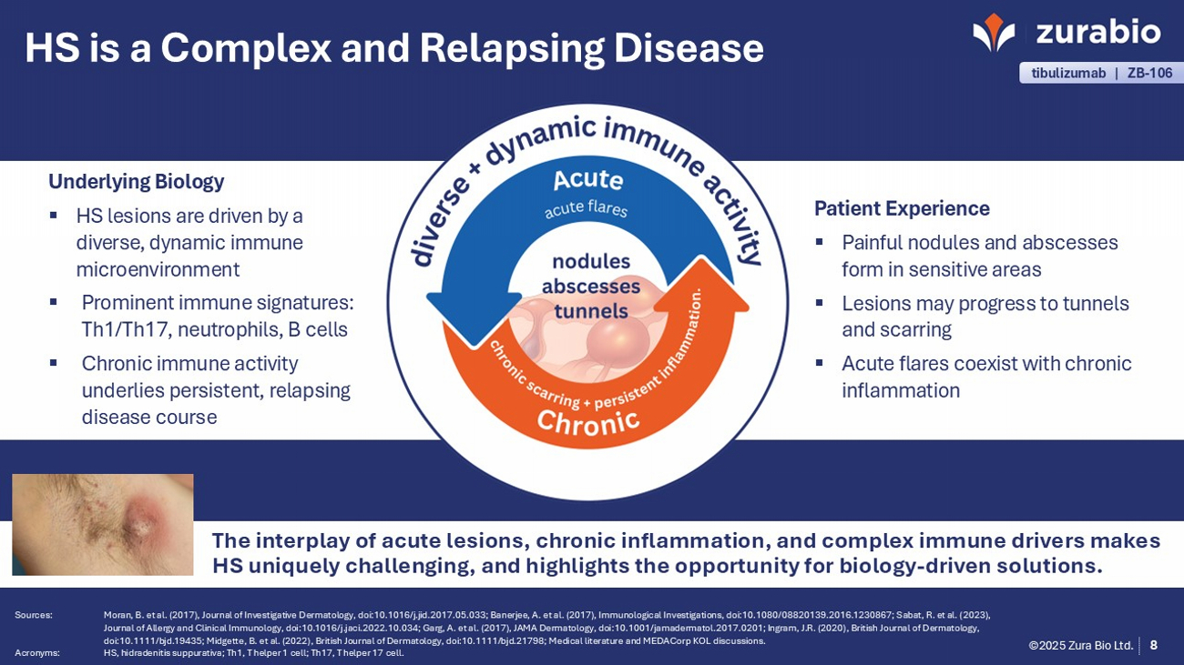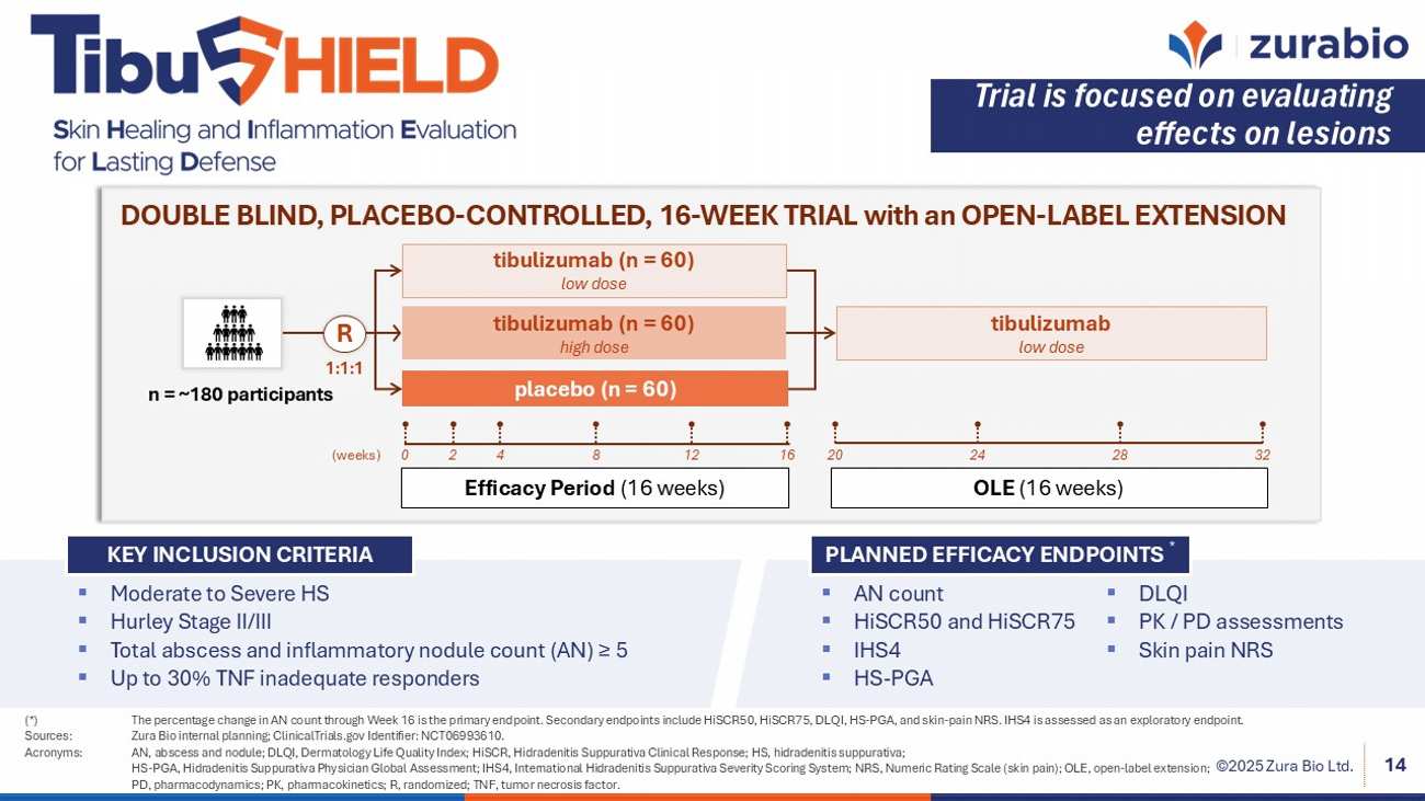 ©2025 Zura Bio Ltd. 13 Dual Targeting IL - 17A and BAFF: A Broader Opportunity in HS Why inhibiting IL - 17A Alone is Not Enough ▪ Controls neutrophilic inflammation but leaves B cell – driven disease active. ▪ Incomplete lesion resolution and persistent fibrosis. Why inhibiting BAFF Alone is Not Enough ▪ Limits B cell activity but fails to control neutrophil - driven inflammation. CONVERGING INFLAMMATORY CYCLES DRIVE HS ▪ IL - 17A and BAFF drive reinforcing cycles of inflammation. ▪ These cycles sustain lesion flares, fibrosis, and chronic disease. • Simultaneously targets two self - amplifying inflammatory cycles • May impact inadequately controlled lesions, scarring, and tunneling • May impact both the acute and chronic phases of the disease, as well as the heterogeneous nature of HS beyond IL - 17 alone THE DUAL APPROACH (tibulizumab) ixekizumab Anti - IL - 17 scFv tabalumab Anti - BAFF Ab Sources: Gudjonsson, J.E. et al. (2020), JCI Insight, doi:10.1172/jci.insight.139930; Macchiarella, G. et al. (2023), J Invest D ermatol, doi:10.1016/j.jid.2022.08.051; Rumberger, B.E. et al. (2020), Inflammation Research, doi:10.1007/s00011 - 020 - 01381 - 7; Sabat, R. et al. (2023), J Allergy Clin Immunol, doi:10.1016/j.jaci.2022.10.034; Vincent, F.B. et al. (2014), Nat Rev Rheumatol , doi:10.1038/nrrheum.2014.33; Rastrick, J. et al. (2024), Br J Dermatol, doi:10.1093/ bjd /ljae442; Kimball, A.B. et al. (2016), J Am Acad Dermatol, doi:10.1016/j.jaad.2016.08.012; Glatt, S. et al. (2021), Dermatol Ther, doi:10.1007/s13555 - 021 - 00586 - 0; Zouboulis , C.C. et al. (2017), Br J Dermatol, doi:10.1111/bjd.15314; Matusiak, Ł. (2018), Clin Dermatol, doi:10.1016/j.clindermatol.2017.10.009. Acronyms: BAFF, B cell – activating factor; DT, draining tunnel; HS, hidradenitis suppurativa; HiSCR , Hidradenitis Suppurativa Clinical Response; IHS4, International Hidradenitis Suppurativa Severity Score System; IL - 17A, interl eukin 17A. tibulizumab | ZB - 106