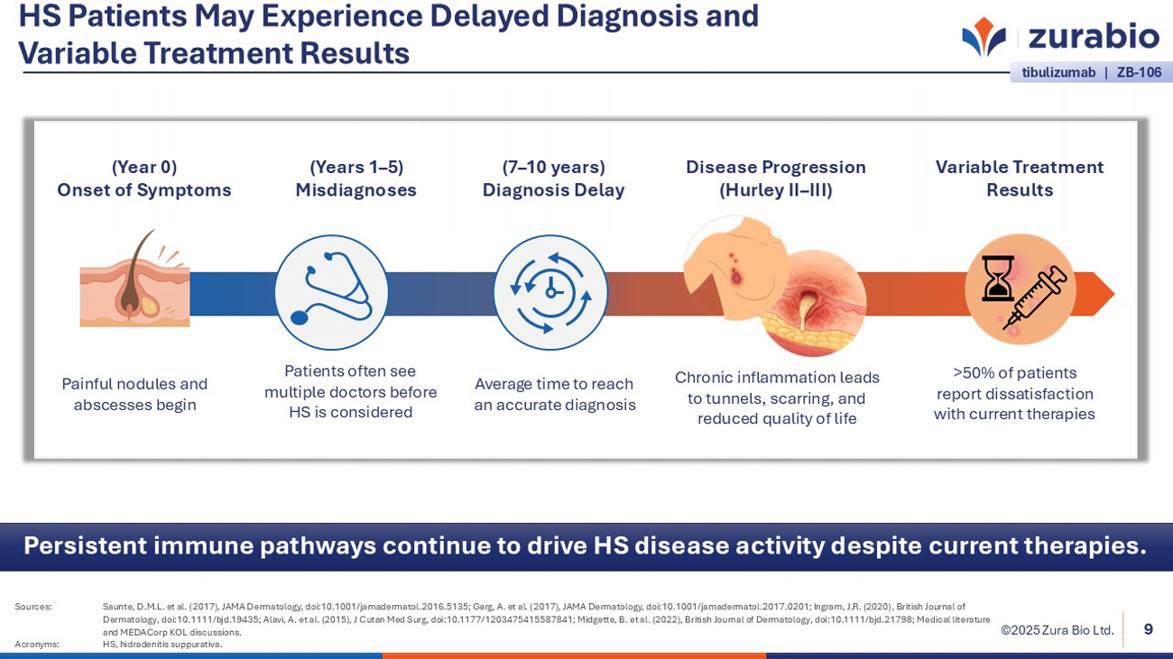 Nasdaq: ZURA | www.zurabio.com HS is a Complex and Relapsing Disease 8 ©2025 Zura Bio Ltd. The interplay of acute lesions, chronic inflammation, and complex immune drivers makes HS uniquely challenging, and highlights the opportunity for biology - driven solutions. Patient Experience ▪ Painful nodules and abscesses form in sensitive areas ▪ Lesions may progress to tunnels and scarring ▪ Acute flares coexist with chronic inflammation Underlying Biology ▪ HS lesions are driven by a diverse, dynamic immune microenvironment ▪ Prominent immune signatures: Th1/Th17, neutrophils, B cells ▪ Chronic immune activity underlies persistent, relapsing disease course Sources: Moran, B. et al. (2017), Journal of Investigative Dermatology, doi:10.1016/j.jid.2017.05.033; Banerjee, A. et al. (2017 ), Immunological Investigations, doi:10.1080/08820139.2016.1230867; Sabat, R. et al. (2023), Journal of Allergy and Clinical Immunology, doi:10.1016/j.jaci.2022.10.034; Garg, A. et al. (2017), JAMA Dermatology, doi:10. 10 01/jamadermatol.2017.0201; Ingram, J.R. (2020), British Journal of Dermatology, doi:10.1111/bjd.19435; Midgette, B. et al. (2022), British Journal of Dermatology, doi:10.1111/bjd.21798; Medical literature an d MEDACorp KOL discussions. Acronyms: HS, hidradenitis suppurativa; Th1, T helper 1 cell; Th17, T helper 17 cell. tibulizumab | ZB - 106
