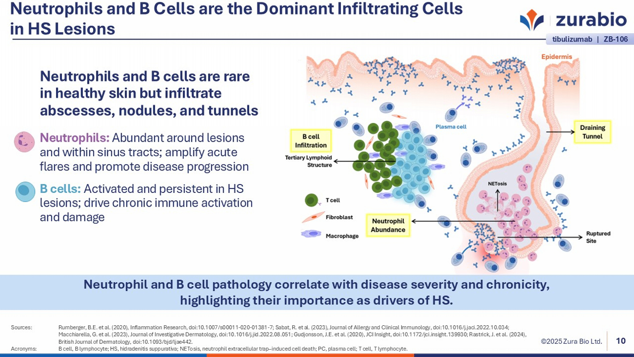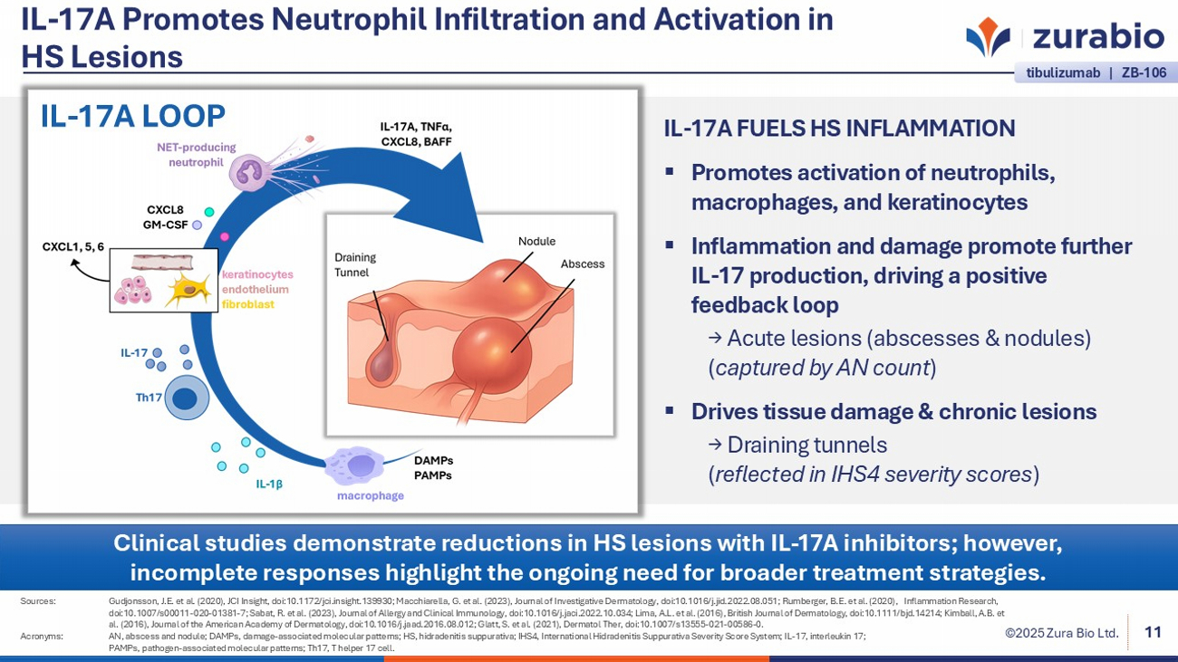 ©2025 Zura Bio Ltd. Neutrophils and B Cells are the Dominant Infiltrating Cells in HS Lesions Sources: Rumberger, B.E. et al. (2020), Inflammation Research, doi:10.1007/s00011 - 020 - 01381 - 7; Sabat, R. et al. (2023), Journal of Allergy and Clinical Immunology, doi:10.1016/j.jaci.2022.10.034; Macchiarella, G. et al. (2023), Journal of Investigative Dermatology, doi:10.1016/j.jid.2022.08.051; Gudjonsson, J.E. et al. (2 020), JCI Insight, doi:10.1172/jci.insight.139930; Rastrick, J. et al. (2024), British Journal of Dermatology, doi:10.1093/ bjd /ljae442. Acronyms: B cell, B lymphocyte; HS, hidradenitis suppurativa; NETosis , neutrophil extracellular trap – induced cell death; PC, plasma cell; T cell, T lymphocyte. 10 Neutrophil and B cell pathology correlate with disease severity and chronicity, highlighting their importance as drivers of HS. Neutrophils and B cells are rare in healthy skin but infiltrate abscesses, nodules, and tunnels Neutrophils: Abundant around lesions and within sinus tracts; amplify acute flares and promote disease progression B cells: Activated and persistent in HS lesions; drive chronic immune activation and damage tibulizumab | ZB - 106