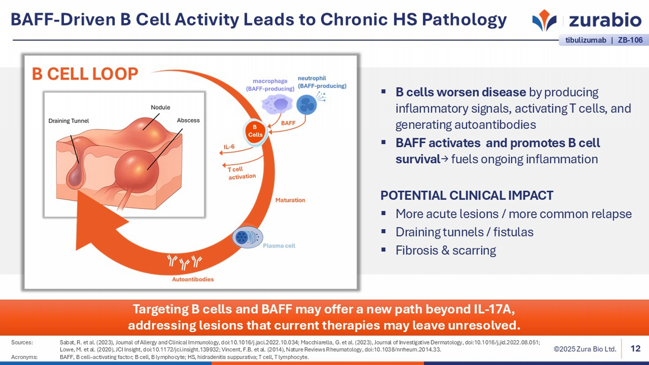 ©2025 Zura Bio Ltd. IL - 17A Promotes Neutrophil Infiltration and Activation in HS Lesions 11 Clinical studies demonstrate reductions in HS lesions with IL - 17A inhibitors; however, incomplete responses highlight the ongoing need for broader treatment strategies. IL - 17A FUELS HS INFLAMMATION ▪ Promotes activation of neutrophils, macrophages, and keratinocytes ▪ Inflammation and damage promote further IL - 17 production, driving a positive feedback loop → Acute lesions (abscesses & nodules) ( captured by AN count ) ▪ Drives tissue damage & chronic lesions → Draining tunnels ( reflected in IHS4 severity scores ) IL - 17A LOOP Sources: Gudjonsson, J.E. et al. (2020), JCI Insight, doi:10.1172/jci.insight.139930; Macchiarella, G. et al. (2023), Journal of Investigative Dermatology, doi:10.1016/j.jid.2022.08.051; Rumberger, B.E. et al. (2020), Inflammation Research, doi:10.1007/s00011 - 020 - 01381 - 7; Sabat, R. et al. (2023), Journal of Allergy and Clinical Immunology, doi:10.1016/j.jaci.2022.10 .034; Lima, A.L. et al. (2016), British Journal of Dermatology, doi:10.1111/bjd.14214; Kimball, A.B. et al. (2016), Journal of the American Academy of Dermatology, doi:10.1016/j.jaad.2016.08.012; Glatt, S. et al. (2021), Dermatol T her, doi:10.1007/s13555 - 021 - 00586 - 0. Acronyms: AN, abscess and nodule; DAMPs, damage - associated molecular patterns; HS, hidradenitis suppurativa; IHS4, International Hidradenitis Suppurativa Severity Score System; IL - 17, interleukin 17; PAMPs, pathogen - associated molecular patterns; Th17, T helper 17 cell. tibulizumab | ZB - 106