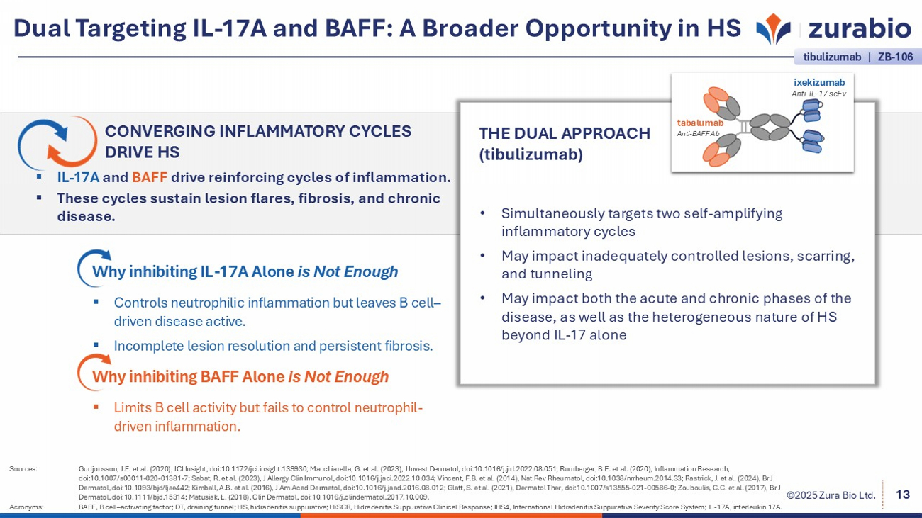 ©2025 Zura Bio Ltd. BAFF - Driven B Cell Activity Leads to Chronic HS Pathology 12 Targeting B cells and BAFF may offer a new path beyond IL - 17A, addressing lesions that current therapies may leave unresolved. Sources: Sabat, R. et al. (2023), Journal of Allergy and Clinical Immunology, doi:10.1016/j.jaci.2022.10.034; Macchiarella, G. e t al. (2023), Journal of Investigative Dermatology, doi:10.1016/j.jid.2022.08.051; Lowe, M. et al. (2020), JCI Insight, doi:10.1172/jci.insight.139932; Vincent, F.B. et al. (2014), Nature Reviews Rheumatology , doi:10.1038/nrrheum.2014.33. Acronyms: BAFF, B cell – activating factor; B cell, B lymphocyte; HS, hidradenitis suppurativa; T cell, T lymphocyte. ▪ B cells worsen disease by producing inflammatory signals, activating T cells, and generating autoantibodies ▪ BAFF activates and promotes B cell survival → fuels ongoing inflammation POTENTIAL CLINICAL IMPACT ▪ More acute lesions / more common relapse ▪ Draining tunnels / fistulas ▪ Fibrosis & scarring B CELL LOOP tibulizumab | ZB - 106
