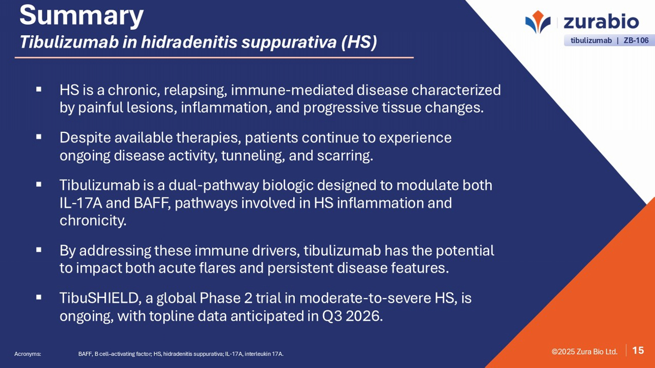 ©2025 Zura Bio Ltd. 14 Efficacy Period (16 weeks) OLE (16 weeks) 1:1:1 R tibulizumab ( n = 6 0) high dose p lacebo ( n = 6 0) n = ~180 participants (w eeks) 24 28 32 20 DOUBLE BLIND, PLACEBO - CONTROLLED, 16 - WEEK TRIAL with an OPEN - LABEL EXTENSION tibulizumab ( n = 6 0) low dose tibulizumab low dose 2 4 8 12 16 0 ▪ AN count ▪ HiSCR50 and HiSCR75 ▪ IHS4 ▪ HS - PGA ▪ DLQI ▪ PK / PD assessments ▪ Skin pain NRS PLANNED EFFICACY ENDPOINTS * KEY INCLUSION CRITERIA ▪ Moderate to Severe HS ▪ Hurley Stage II/III ▪ Total abscess and inflammatory nodule count (AN) ≥ 5 ▪ Up to 30% TNF inadequate responders Trial is focused on evaluating effects on lesions (*) The percentage change in AN count through Week 16 is the primary endpoint. Secondary endpoints include HiSCR50, HiSCR75, DLQ I, HS - PGA, and skin - pain NRS. IHS4 is assessed as an exploratory endpoint. Sources: Zura Bio internal planning; ClinicalTrials.gov Identifier: NCT06993610. Acronyms: AN, abscess and nodule; DLQI, Dermatology Life Quality Index; HiSCR , Hidradenitis Suppurativa Clinical Response; HS, hidradenitis suppurativa; HS - PGA, Hidradenitis Suppurativa Physician Global Assessment; IHS4, International Hidradenitis Suppurativa Severity Scoring Sys tem; NRS, Numeric Rating Scale (skin pain); OLE, open - label extension; PD, pharmacodynamics; PK, pharmacokinetics; R, randomized; TNF, tumor necrosis factor.