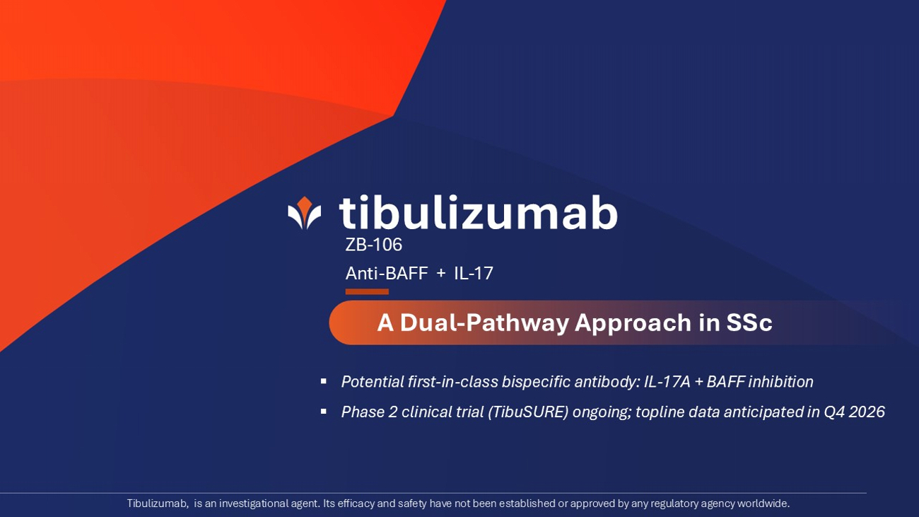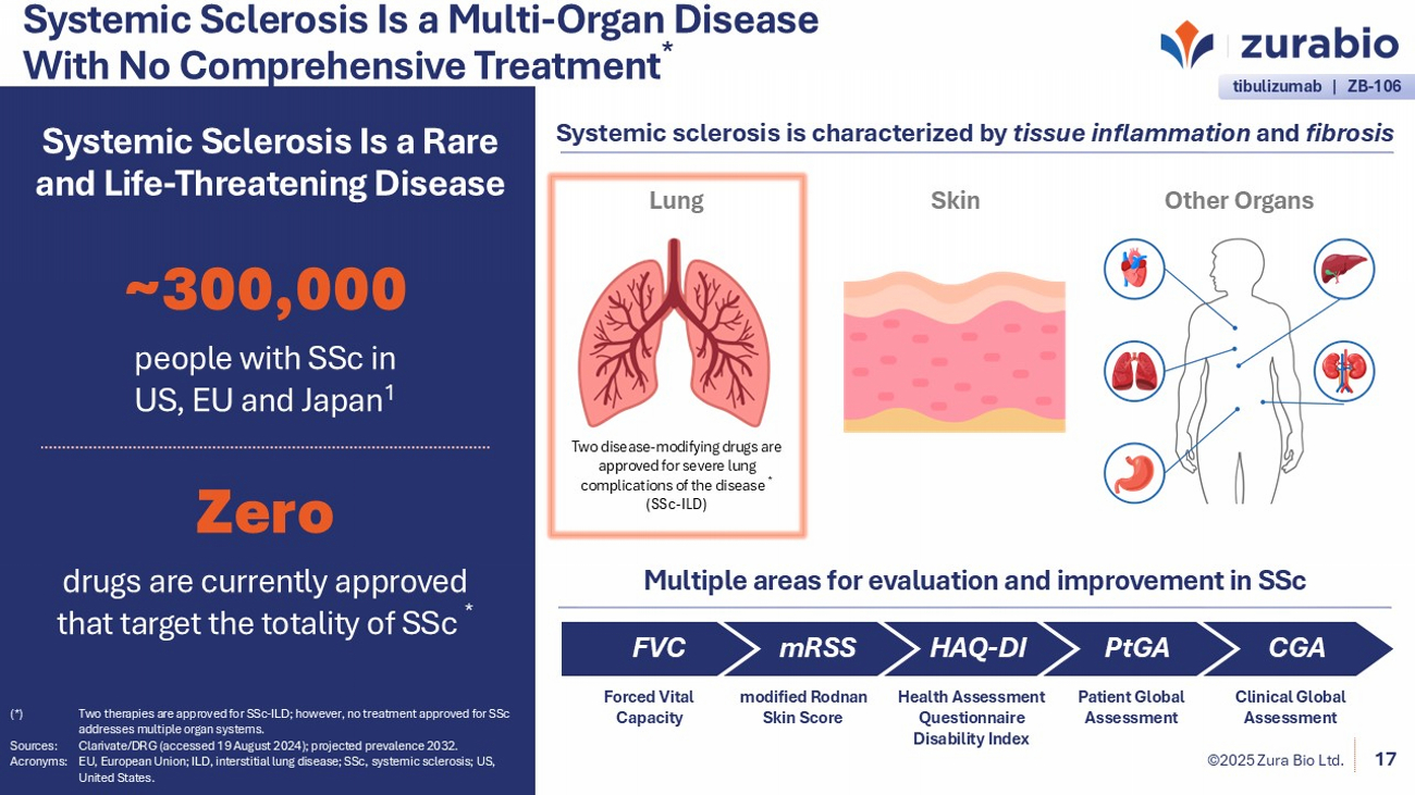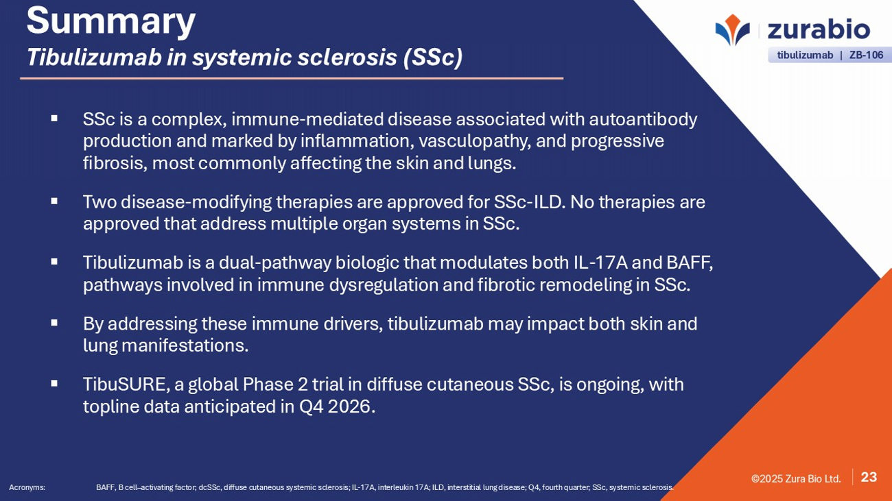 ©2025 Zura Bio Ltd. ▪ SSc is a complex, immune - mediated disease associated with autoantibody production and marked by inflammation, vasculopathy, and progressive fibrosis, most commonly affecting the skin and lungs. ▪ Two disease - modifying therapies are approved for SSc - ILD. No therapies are approved that address multiple organ systems in SSc. ▪ Tibulizumab is a dual - pathway biologic that modulates both IL - 17A and BAFF, pathways involved in immune dysregulation and fibrotic remodeling in SSc. ▪ By addressing these immune drivers, tibulizumab may impact both skin and lung manifestations. ▪ TibuSURE, a global Phase 2 trial in diffuse cutaneous SSc, is ongoing, with topline data anticipated in Q4 2026. Summary Tibulizumab in systemic sclerosis (SSc) Acronyms: BAFF, B cell – activating factor; dcSSc , diffuse cutaneous systemic sclerosis; IL - 17A, interleukin 17A; ILD, interstitial lung disease; Q4, fourth quarter; SSc, system ic sclerosis. 23 ©2025 Zura Bio Ltd. tibulizumab | ZB - 106