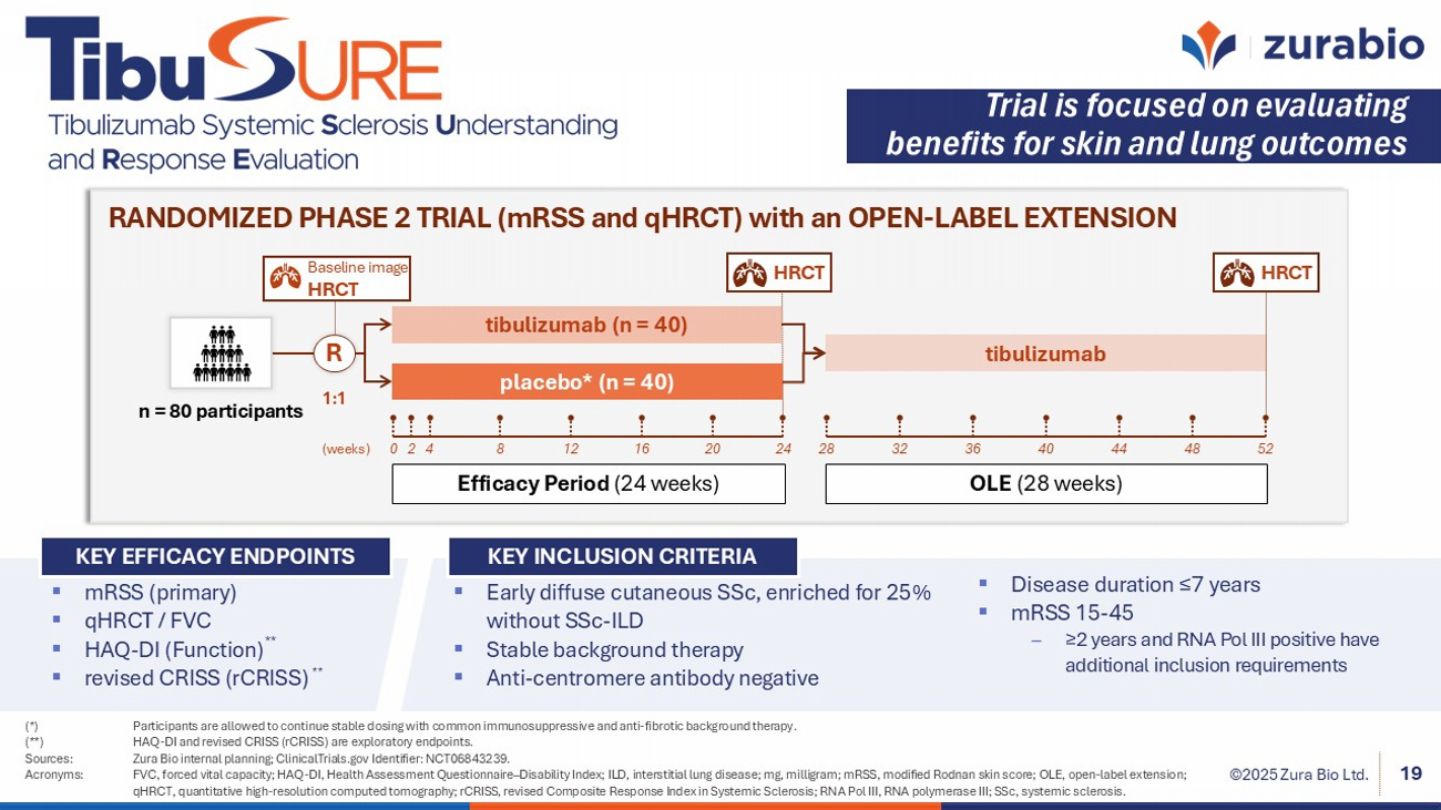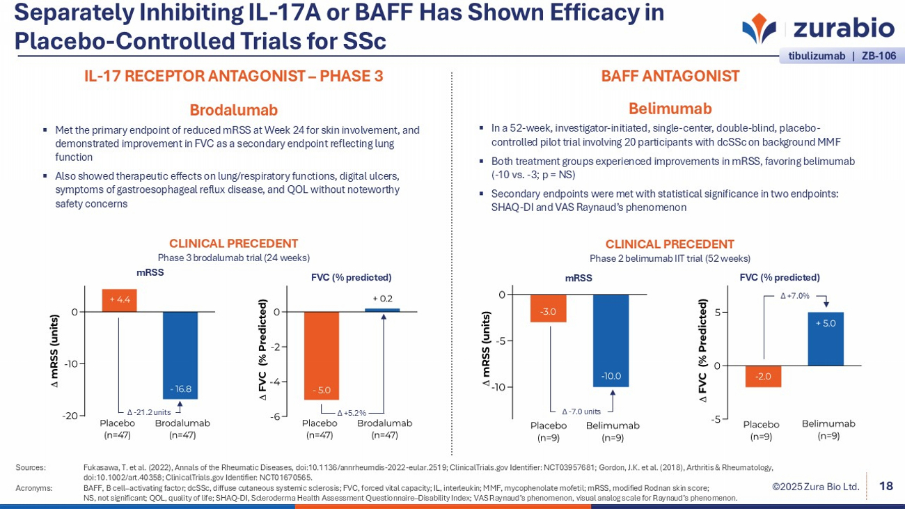 ©2025 Zura Bio Ltd. Separately Inhibiting IL - 17A or BAFF Has Shown Efficacy in Placebo - Controlled Trials for SSc Sources: Fukasawa , T. et al. (2022), Annals of the Rheumatic Diseases, doi:10.1136/annrheumdis - 2022 - eular.2519; ClinicalTrials.gov Identifier: NC T03957681; Gordon, J.K. et al. (2018), Arthritis & Rheumatology, doi:10.1002/art.40358; ClinicalTrials.gov Identifier: NCT01670565. Acronyms: BAFF, B cell – activating factor; dcSSc , diffuse cutaneous systemic sclerosis; FVC, forced vital capacity; IL, interleukin; MMF, mycophenolate mofetil; mRSS, modifi ed Rodnan skin score; NS, not significant; QOL, quality of life; SHAQ - DI, Scleroderma Health Assessment Questionnaire – Disability Index; VAS Raynaud’s phenomenon, visual analog scale for Raynaud’s phenomenon. 18 IL - 17 RECEPTOR ANTAGONIST – PHASE 3 Brodalumab ▪ Met the primary endpoint of reduced mRSS at Week 24 for skin involvement, and demonstrated improvement in FVC as a secondary endpoint reflecting lung function ▪ Also showed therapeutic effects on lung/respiratory functions, digital ulcers, symptoms of gastroesophageal reflux disease, and QOL without noteworthy safety concerns Δ + 5.2% Δ - 21.2 units CLINICAL PRECEDENT Phase 3 b rodalumab trial (24 weeks) mRSS FVC (% predicted) BAFF ANTAGONIST Belimumab ▪ In a 52 - week, investigator - initiated, single - center, double - blind, placebo - controlled pilot trial involving 20 participants with dcSSc on background MMF ▪ Both treatment groups experienced improvements in mRSS, favoring belimumab ( - 10 vs. - 3; p = NS) ▪ Secondary endpoints were met with statistical significance in two endpoints: SHAQ - DI and VAS Raynaud’s phenomenon CLINICAL PRECEDENT Phase 2 belimumab IIT trial (52 weeks) mRSS FVC (% predicted ) Δ - 7.0 units Δ +7.0% tibulizumab | ZB - 106