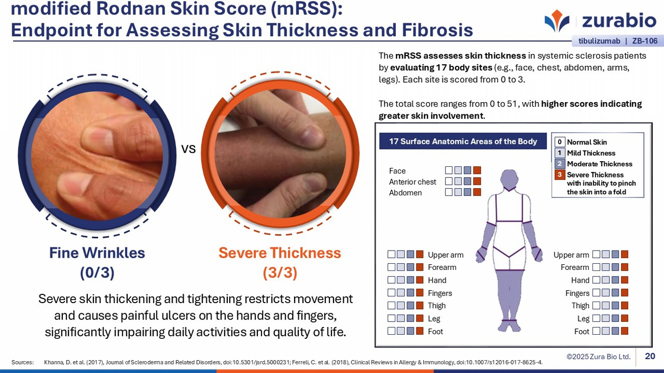©2025 Zura Bio Ltd. modified Rodnan Skin Score (mRSS): Endpoint for Assessing Skin Thickness and Fibrosis 20 Severe skin thickening and tightening restricts movement and causes painful ulcers on the hands and fingers, significantly impairing daily activities and quality of life. vs Fine Wrinkles (0/3) Severe Thickness (3/3) The mRSS assesses skin thickness in systemic sclerosis patients by evaluating 17 body sites (e.g., face, chest, abdomen, arms, legs). Each site is scored from 0 to 3. The total score ranges from 0 to 51, with higher scores indicating greater skin involvement . 17 Surface Anatomic Areas of the Body Moderate Thickness 2 Mild Thickness 1 Severe Thickness 3 Normal Skin 0 Face Anterior chest Abdomen Upper arm Forearm Hand Fingers Thigh Leg Foot Upper arm Forearm Hand Fingers Thigh Leg Foot with inability to pinch the skin into a fold Sources: Khanna, D. et al. (2017), Journal of Scleroderma and Related Disorders, doi:10.5301/jsrd.5000231; Ferreli , C. et al. (2018), Clinical Reviews in Allergy & Immunology, doi:10.1007/s12016 - 017 - 8625 - 4. tibulizumab | ZB - 106