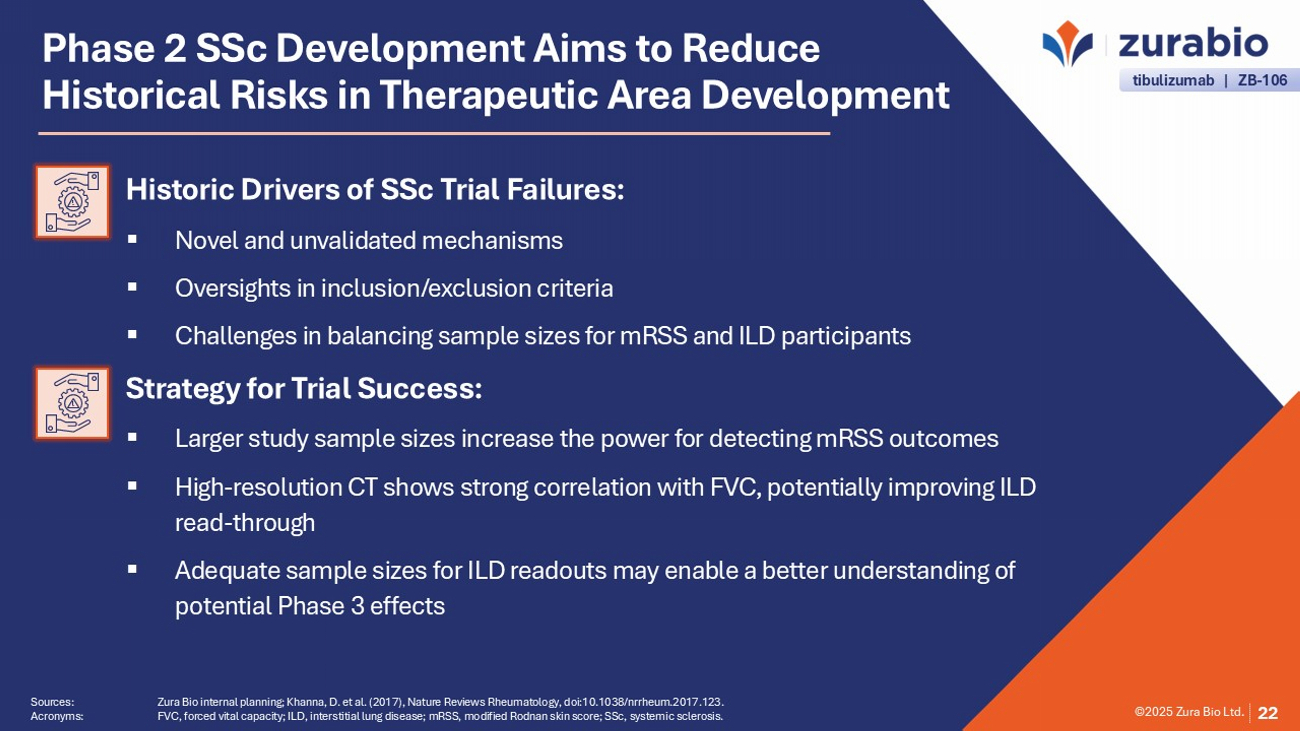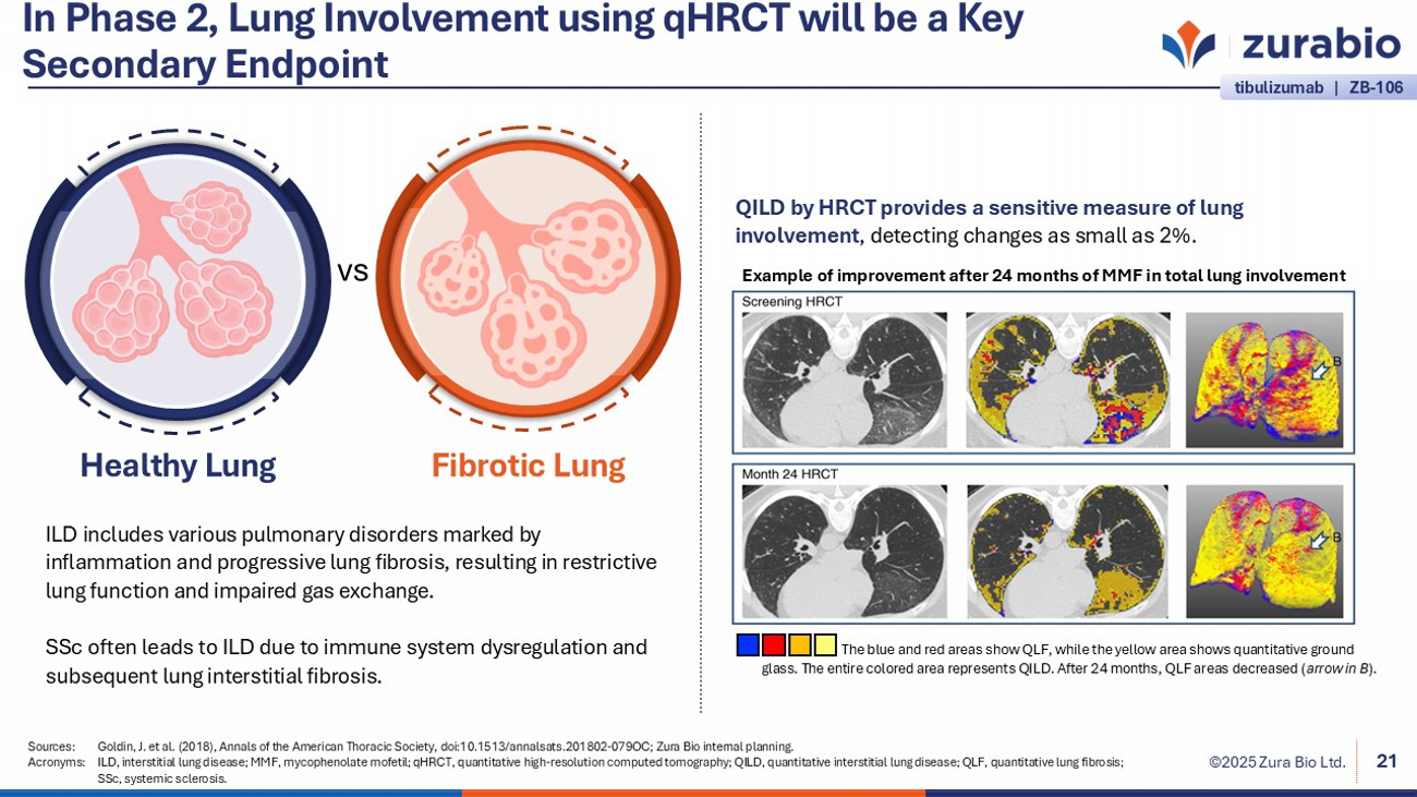 ©2025 Zura Bio Ltd. In Phase 2, Lung Involvement using qHRCT will be a Key Secondary Endpoint 21 Sources: Goldin, J. et al. (2018), Annals of the American Thoracic Society, doi:10.1513/annalsats.201802 - 079OC; Zura Bio interna l planning. Acronyms: ILD, interstitial lung disease; MMF, mycophenolate mofetil; qHRCT , quantitative high - resolution computed tomography; QILD, quantitative interstitial lung disease; QLF, quantitative lung fibrosi s; SSc, systemic sclerosis. ILD includes various pulmonary disorders marked by inflammation and progressive lung fibrosis, resulting in restrictive lung function and impaired gas exchange. SSc often leads to ILD due to immune system dysregulation and subsequent lung interstitial fibrosis. vs Healthy Lung Fibrotic Lung QILD by HRCT provides a sensitive measure of lung involvement , detecting changes as small as 2%. Example of improvement after 24 months of MMF in total lung involvement The blue and red areas show QLF, while the yellow area shows quantitative ground glass. The entire colored area represents QILD. After 24 months, QLF areas decreased ( arrow in B ). tibulizumab | ZB - 106