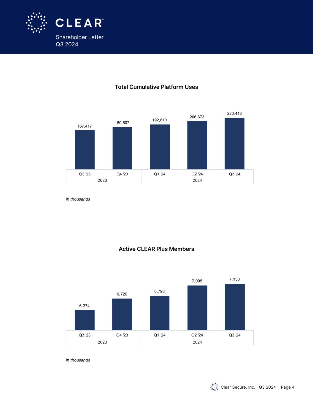 Clear Secure, Inc. | Q3 2024 | Page 3 Shareholder Letter Q3 2024 8.5x 8.1x 7.8x 7.4x Q3 '23 Q4 '23 Q1 '24 Q2 '24 2024 Annualized CLEAR Plus Member Usage 88.5% 86.3% Q3 '23 Q4 '23 Annual CLEAR Plus Net Member Retention 6,374 6,720 Q3 '23 Q4 '23 Acitve CLEAR Plus Members (Thousands) $160.4 $171.0 $179.0 $186.7 $198.4 $191.7 $195.3 $180.6 $197.0 $227.5 Q3 '23 Q4 '23 Q1 '24 Q2 '24 Q3 '24 2024 Total GAAP Revenue & Bookings Revenue Total Bookings 18,594 20,194 Q3 '23 Q4 '23 Total Cumulative Enrollments (Thousands) 167,417 180,807 192,610 206,673 220,413 Q3 '23 Q4 '23 Q1 '24 Q2 '24 Q3 '24 2024 Total Cumulative Platform Uses (Thousands) 88.0% 89.3% 89.8% 89.3% 89.0% Q3 '23 Q4 '23 Q1 '24 Q2 '24 Q3 '24 2024 Annual CLEAR Plus Gross Dollar Retention 88.5% 86.3% 84.0% 83.2% 81.5% Q3 '23 Q4 '23 Q1 '24 Q2 '24 Q3 '24 2024 Annual CLEAR Plus Net Member Retention 6,374 6,720 6,798 7,095 7,150 Q3 '23 Q4 '23 Q1 '24 Q2 '24 Q3 '24 2024 Acitve CLEAR Plus Members (Thousands) $227.5 18,594 20,194 21,941 24,221 26,453 Q3 '23 Q4 '23 Q1 '24 Q2 '24 Q3 '24 2024 Total Cumulative Enrollments (Thousands) in millions 2023 2023 in thousands Total GAAP Revenue & Bookings Total Cumulative Enrollments