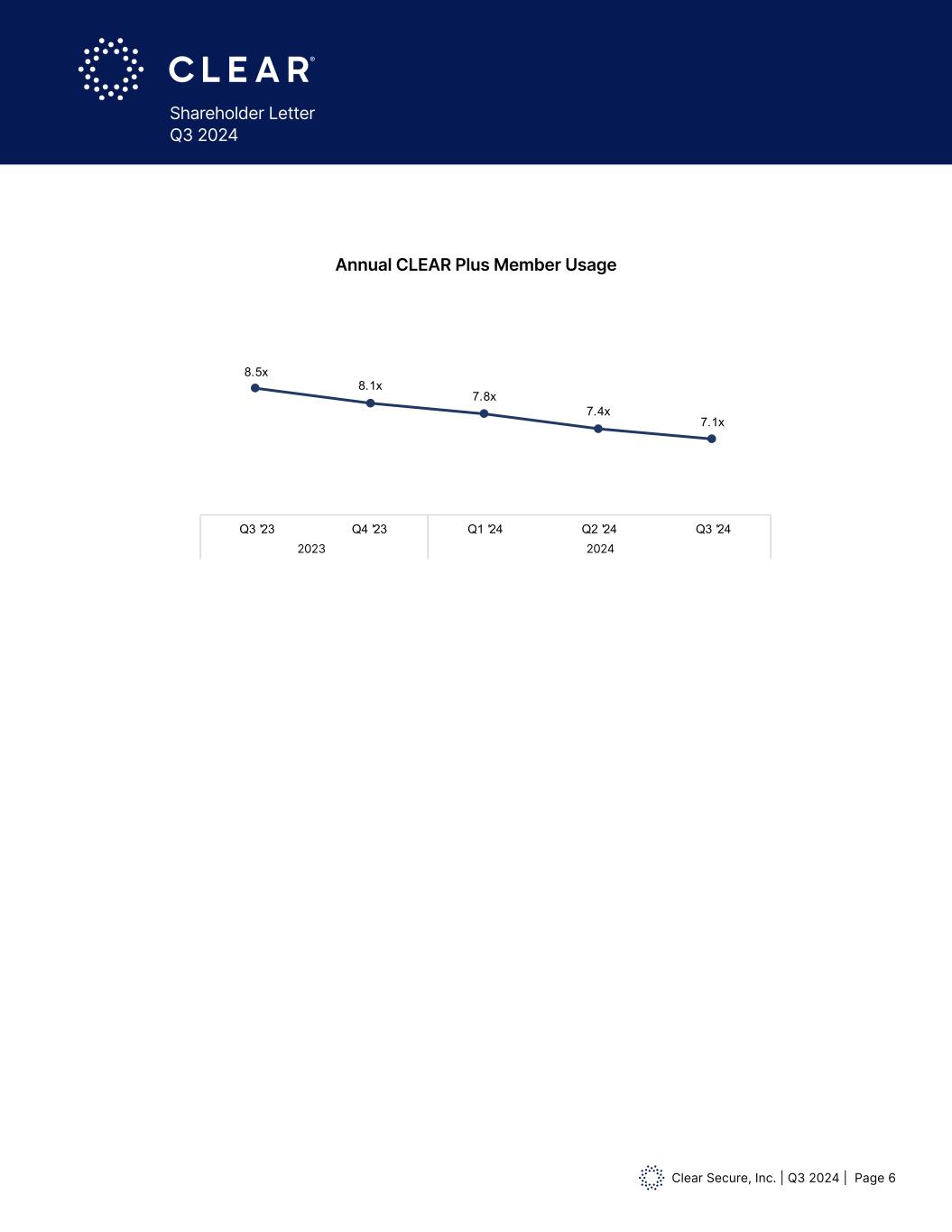Clear Secure, Inc. | Q3 2024 | Page 6 Shareholder Letter Q3 2024 Annual CLEAR Plus Member Usage 8.5x 8.1x 7.8x 7.4x 7.1x Q3 '23 Q4 '23 Q1 '24 Q2 '24 Q3 '24 2024 Annualized CLEAR Plus Member Usage Q3 '23 Q4 '23 Q1 '24Q1 '24 Q2 '24 Q3 '24 2024 2023