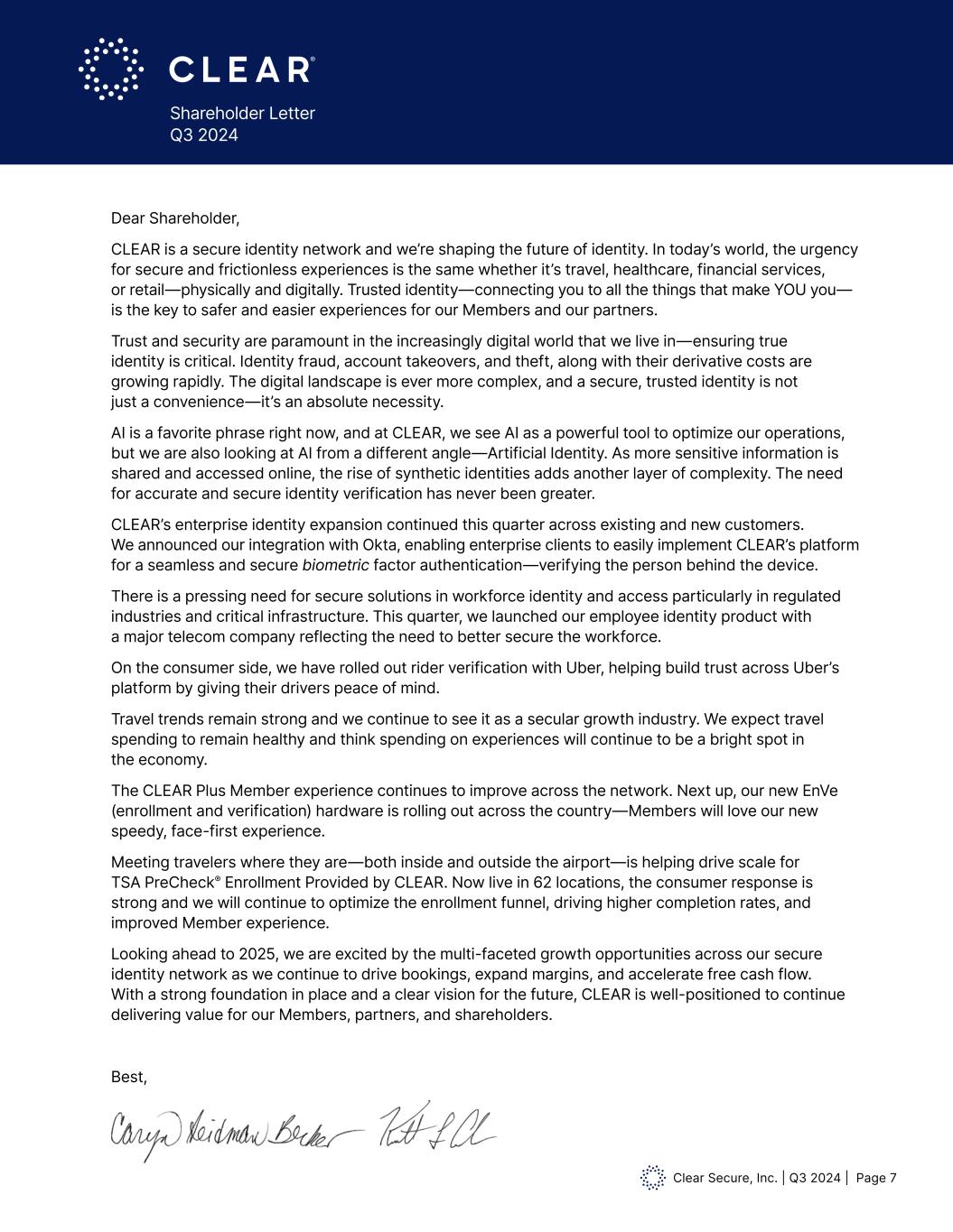 Clear Secure, Inc. | Q3 2024 | Page 7 Shareholder Letter Q3 2024 Dear Shareholder, CLEAR is a secure identity network and we’re shaping the future of identity. In today’s world, the urgency for secure and frictionless experiences is the same whether it’s travel, healthcare, financial services, or retail—physically and digitally. Trusted identity—connecting you to all the things that make YOU you— is the key to safer and easier experiences for our Members and our partners. Trust and security are paramount in the increasingly digital world that we live in—ensuring true identity is critical. Identity fraud, account takeovers, and theft, along with their derivative costs are growing rapidly. The digital landscape is ever more complex, and a secure, trusted identity is not just a convenience—it’s an absolute necessity. AI is a favorite phrase right now, and at CLEAR, we see AI as a powerful tool to optimize our operations, but we are also looking at AI from a different angle—Artificial Identity. As more sensitive information is shared and accessed online, the rise of synthetic identities adds another layer of complexity. The need for accurate and secure identity verification has never been greater. CLEAR’s enterprise identity expansion continued this quarter across existing and new customers. We announced our integration with Okta, enabling enterprise clients to easily implement CLEAR’s platform for a seamless and secure biometric factor authentication—verifying the person behind the device. There is a pressing need for secure solutions in workforce identity and access particularly in regulated industries and critical infrastructure. This quarter, we launched our employee identity product with a major telecom company reflecting the need to better secure the workforce. On the consumer side, we have rolled out rider verification with Uber, helping build trust across Uber’s platform by giving their drivers peace of mind. Travel trends remain strong and we continue to see it as a secular growth industry. We expect travel spending to remain healthy and think spending on experiences will continue to be a bright spot in the economy. The CLEAR Plus Member experience continues to improve across the network. Next up, our new EnVe (enrollment and verification) hardware is rolling out across the country—Members will love our new speedy, face-first experience. Meeting travelers where they are—both inside and outside the airport—is helping drive scale for TSA PreCheck® Enrollment Provided by CLEAR. Now live in 62 locations, the consumer response is strong and we will continue to optimize the enrollment funnel, driving higher completion rates, and improved Member experience. Looking ahead to 2025, we are excited by the multi-faceted growth opportunities across our secure identity network as we continue to drive bookings, expand margins, and accelerate free cash flow. With a strong foundation in place and a clear vision for the future, CLEAR is well-positioned to continue delivering value for our Members, partners, and shareholders. Best,