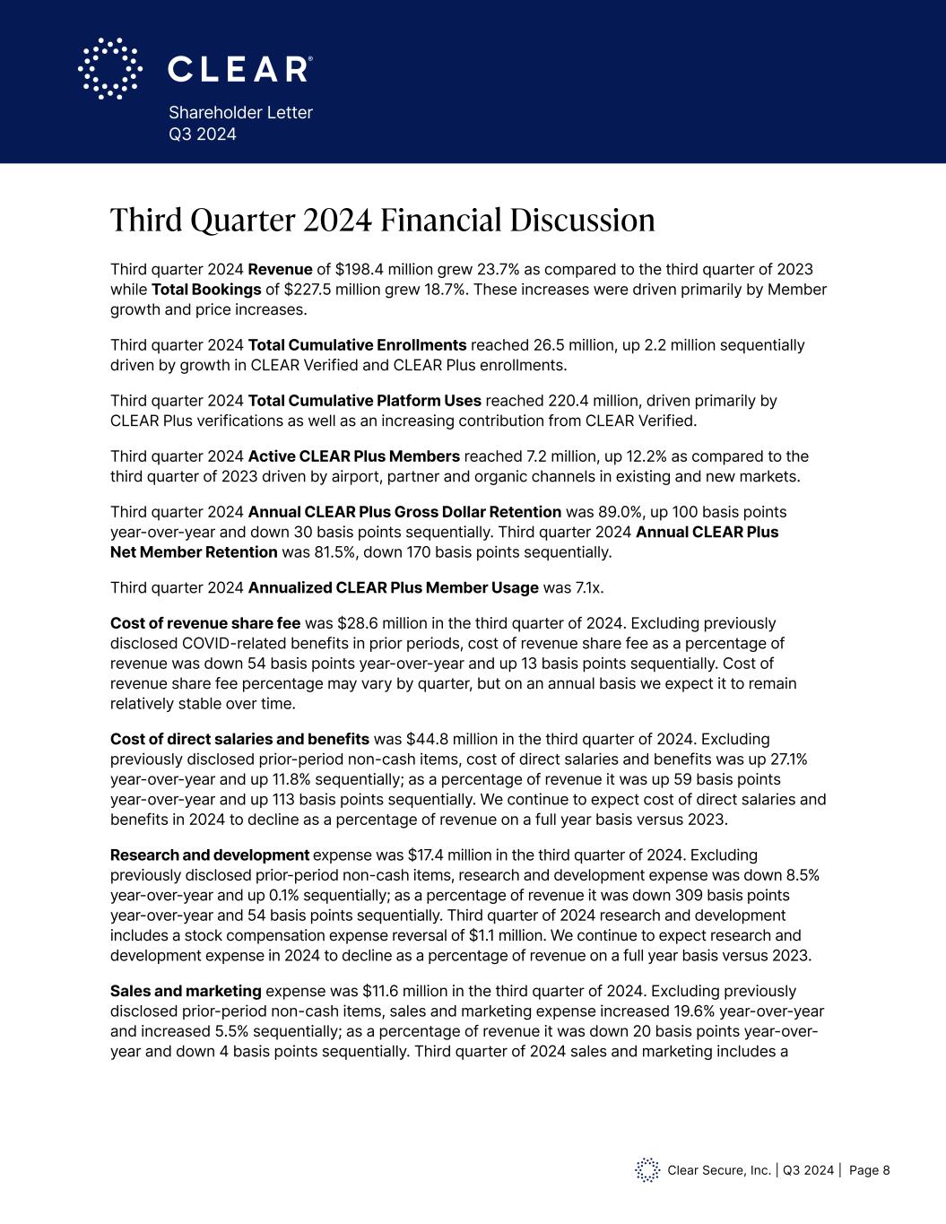 Clear Secure, Inc. | Q3 2024 | Page 8 Shareholder Letter Q3 2024 Third quarter 2024 Revenue of $198.4 million grew 23.7% as compared to the third quarter of 2023 while Total Bookings of $227.5 million grew 18.7%. These increases were driven primarily by Member growth and price increases. Third quarter 2024 Total Cumulative Enrollments reached 26.5 million, up 2.2 million sequentially driven by growth in CLEAR Verified and CLEAR Plus enrollments. Third quarter 2024 Total Cumulative Platform Uses reached 220.4 million, driven primarily by CLEAR Plus verifications as well as an increasing contribution from CLEAR Verified. Third quarter 2024 Active CLEAR Plus Members reached 7.2 million, up 12.2% as compared to the third quarter of 2023 driven by airport, partner and organic channels in existing and new markets. Third quarter 2024 Annual CLEAR Plus Gross Dollar Retention was 89.0%, up 100 basis points year-over-year and down 30 basis points sequentially. Third quarter 2024 Annual CLEAR Plus Net Member Retention was 81.5%, down 170 basis points sequentially. Third quarter 2024 Annualized CLEAR Plus Member Usage was 7.1x. Cost of revenue share fee was $28.6 million in the third quarter of 2024. Excluding previously disclosed COVID-related benefits in prior periods, cost of revenue share fee as a percentage of revenue was down 54 basis points year-over-year and up 13 basis points sequentially. Cost of revenue share fee percentage may vary by quarter, but on an annual basis we expect it to remain relatively stable over time. Cost of direct salaries and benefits was $44.8 million in the third quarter of 2024. Excluding previously disclosed prior-period non-cash items, cost of direct salaries and benefits was up 27.1% year-over-year and up 11.8% sequentially; as a percentage of revenue it was up 59 basis points year-over-year and up 113 basis points sequentially. We continue to expect cost of direct salaries and benefits in 2024 to decline as a percentage of revenue on a full year basis versus 2023. Research and development expense was $17.4 million in the third quarter of 2024. Excluding previously disclosed prior-period non-cash items, research and development expense was down 8.5% year-over-year and up 0.1% sequentially; as a percentage of revenue it was down 309 basis points year-over-year and 54 basis points sequentially. Third quarter of 2024 research and development includes a stock compensation expense reversal of $1.1 million. We continue to expect research and development expense in 2024 to decline as a percentage of revenue on a full year basis versus 2023. Sales and marketing expense was $11.6 million in the third quarter of 2024. Excluding previously disclosed prior-period non-cash items, sales and marketing expense increased 19.6% year-over-year and increased 5.5% sequentially; as a percentage of revenue it was down 20 basis points year-over- year and down 4 basis points sequentially. Third quarter of 2024 sales and marketing includes a Third Quarter 2024 Financial Discussion