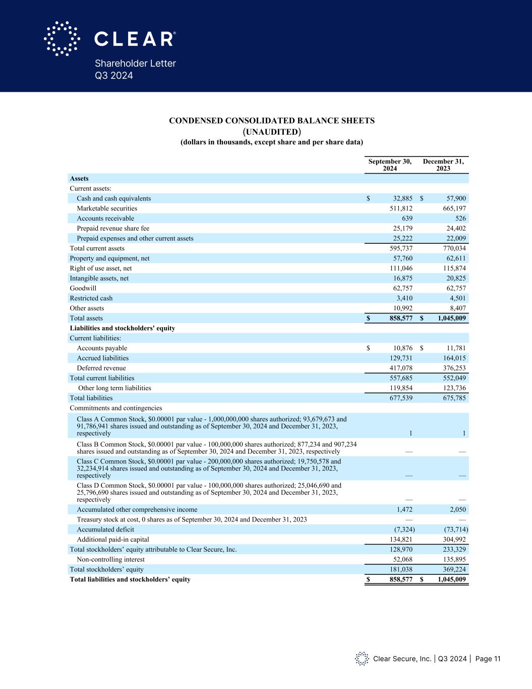 Clear Secure, Inc. | Q3 2024 | Page 11 Shareholder Letter Q3 2024 CLEAR SECURE, INC. CONDENSED CONSOLIDATED BALANCE SHEETS (UNAUDITED) (dollars in thousands, except share and per share data) September 30, 2024 December 31, 2023 Assets Current assets: Cash and cash equivalents $ 32,885 $ 57,900 Marketable securities 511,812 665,197 Accounts receivable 639 526 Prepaid revenue share fee 25,179 24,402 Prepaid expenses and other current assets 25,222 22,009 Total current assets 595,737 770,034 Property and equipment, net 57,760 62,611 Right of use asset, net 111,046 115,874 Intangible assets, net 16,875 20,825 Goodwill 62,757 62,757 Restricted cash 3,410 4,501 Other assets 10,992 8,407 Total assets $ 858,577 $ 1,045,009 Liabilities and stockholders' equity Current liabilities: Accounts payable $ 10,876 $ 11,781 Accrued liabilities 129,731 164,015 Deferred revenue 417,078 376,253 Total current liabilities 557,685 552,049 Other long term liabilities 119,854 123,736 Total liabilities 677,539 675,785 Commitments and contingencies Class A Common Stock, $0.00001 par value - 1,000,000,000 shares authorized; 93,679,673 and 91,786,941 shares issued and outstanding as of September 30, 2024 and December 31, 2023, respectively 1 1 Class B Common Stock, $0.00001 par value - 100,000,000 shares authorized; 877,234 and 907,234 shares issued and outstanding as of September 30, 2024 and December 31, 2023, respectively — — Class C Common Stock, $0.00001 par value - 200,000,000 shares authorized; 19,750,578 and 32,234,914 shares issued and outstanding as of September 30, 2024 and December 31, 2023, respectively — — Class D Common Stock, $0.00001 par value - 100,000,000 shares authorized; 25,046,690 and 25,796,690 shares issued and outstanding as of September 30, 2024 and December 31, 2023, respectively — — Accumulated other comprehensive income 1,472 2,050 Treasury stock at cost, 0 shares as of September 30, 2024 and December 31, 2023 — — Accumulated deficit (7,324) (73,714) Additional paid-in capital 134,821 304,992 Total stockholders’ equity attributable to Clear Secure, Inc. 128,970 233,329 Non-controlling interest 52,068 135,895 Total stockholders’ equity 181,038 369,224 Total liabilities and stockholders’ equity $ 858,577 $ 1,045,009