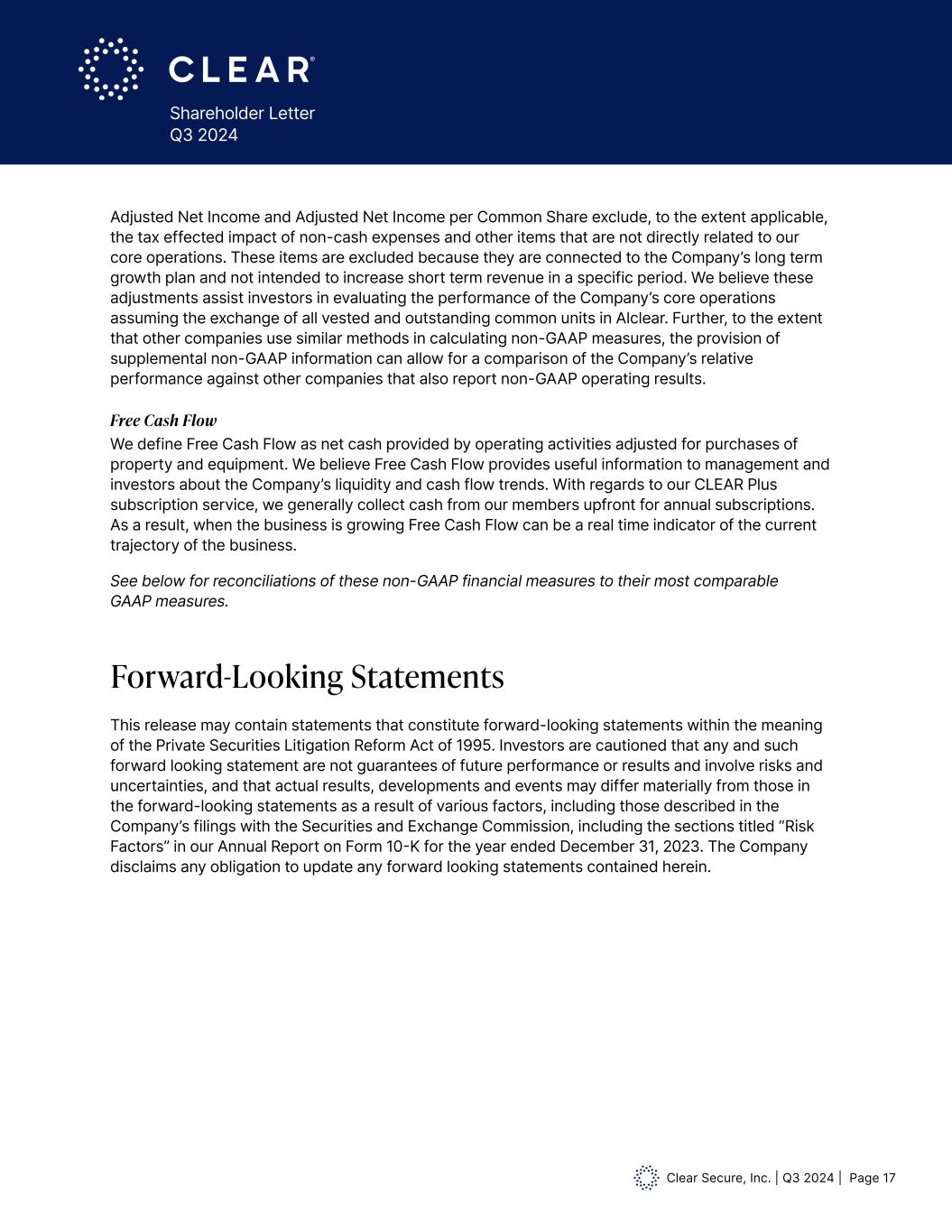 Clear Secure, Inc. | Q3 2024 | Page 17 Shareholder Letter Q3 2024 Adjusted Net Income and Adjusted Net Income per Common Share exclude, to the extent applicable, the tax effected impact of non-cash expenses and other items that are not directly related to our core operations. These items are excluded because they are connected to the Company’s long term growth plan and not intended to increase short term revenue in a specific period. We believe these adjustments assist investors in evaluating the performance of the Company’s core operations assuming the exchange of all vested and outstanding common units in Alclear. Further, to the extent that other companies use similar methods in calculating non-GAAP measures, the provision of supplemental non-GAAP information can allow for a comparison of the Company’s relative performance against other companies that also report non-GAAP operating results. Free Cash Flow We define Free Cash Flow as net cash provided by operating activities adjusted for purchases of property and equipment. We believe Free Cash Flow provides useful information to management and investors about the Company’s liquidity and cash flow trends. With regards to our CLEAR Plus subscription service, we generally collect cash from our members upfront for annual subscriptions. As a result, when the business is growing Free Cash Flow can be a real time indicator of the current trajectory of the business. See below for reconciliations of these non-GAAP financial measures to their most comparable GAAP measures. Forward-Looking Statements This release may contain statements that constitute forward-looking statements within the meaning of the Private Securities Litigation Reform Act of 1995. Investors are cautioned that any and such forward looking statement are not guarantees of future performance or results and involve risks and uncertainties, and that actual results, developments and events may differ materially from those in the forward-looking statements as a result of various factors, including those described in the Company’s filings with the Securities and Exchange Commission, including the sections titled “Risk Factors” in our Annual Report on Form 10-K for the year ended December 31, 2023. The Company disclaims any obligation to update any forward looking statements contained herein.