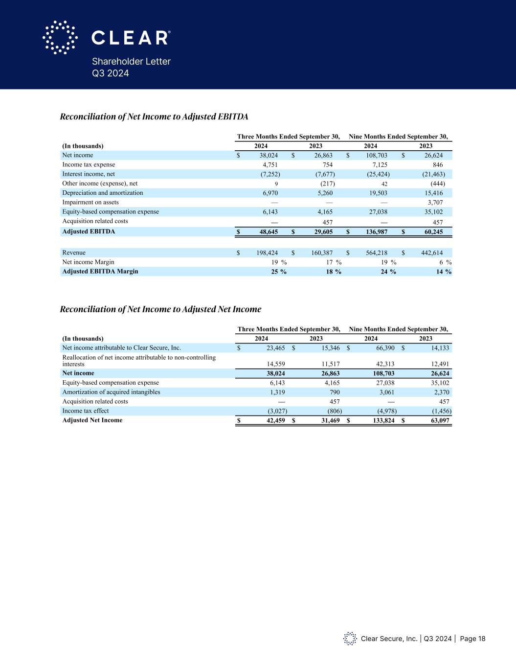Clear Secure, Inc. | Q3 2024 | Page 18 Shareholder Letter Q3 2024 Free Cash Flow We define Free Cash Flow as net cash provided by operating activities adjusted for purchases of property and equipment. We believe Free Cash Flow provides useful information to management and investors about the Company’s liquidity and cash flow trends. With regards to our CLEAR Plus subscription service, we generally collect cash from our members upfront for annual subscriptions. As a result, when the business is growing Free Cash Flow can be a real time indicator of the current trajectory of the business. See below for reconciliations of these non-GAAP financial measures to their most comparable GAAP measures. Forward Looking Statements This release may contain statements that constitute forward-looking statements within the meaning of the Private Securities Litigation Reform Act of 1995. Investors are cautioned that any and such forward looking statement are not guarantees of future performance or results and involve risks and uncertainties, and that actual results, developments and events may differ materially from those in the forward-looking statements as a result of various factors, including those described in the Company’s filings with the Securities and Exchange Commission, including the sections titled “Risk Factors” in our Annual Report on Form 10-K for the year ended December 31, 2023. The Company disclaims any obligation to update any forward looking statements contained herein. Reconciliation of Net Income to Adjusted EBITDA Three Months Ended September 30, Nine Months Ended September 30, (In thousands) 2024 2023 2024 2023 Net income $ 38,024 $ 26,863 $ 108,703 $ 26,624 Income tax expense 4,751 754 7,125 846 Interest income, net (7,252) (7,677) (25,424) (21,463) Other income (expense), net 9 (217) 42 (444) Depreciation and amortization 6,970 5,260 19,503 15,416 Impairment on assets — — — 3,707 Equity-based compensation expense 6,143 4,165 27,038 35,102 Acquisition related costs — 457 — 457 Adjusted EBITDA $ 48,645 $ 29,605 $ 136,987 $ 60,245 Revenue $ 198,424 $ 160,387 $ 564,218 $ 442,614 Net income Margin 19 % 17 % 19 % 6 % Adjusted EBITDA Margin 25 % 18 % 24 % 14 % Reconciliation of Net Income to Adjusted Net Income Three Months Ended September 30, Nine Months Ended September 30, (In thousands) 2024 2023 2024 2023 Net income attributable to Clear Secure, Inc. $ 23,465 $ 15,346 $ 66,390 $ 14,133 Reallocation of net income attributable to non-controlling interests 14,559 11,517 42,313 12,491 Net income 38,024 26,863 108,703 26,624 Equity-based compensation expense 6,143 4,165 27,038 35,102 Amortization of acquired intangibles 1,319 790 3,061 2,370 Acquisition related costs — 457 — 457 Income tax effect (3,027) (806) (4,978) (1,456) Adjusted Net Income $ 42,459 $ 31,469 $ 133,824 $ 63,097 Free Cash Flow We define Free Cash Flow as net cash provided by operating activities adjusted for purchases of property and equipment. We believe Free Cash Flow provides useful information to management and investors about the Company’s liquidity and cash flow trends. With regards to our CLEAR Plus subscription service, we generally collect cash from our members upfront for annual subscriptions. As a result, when the business is growing Free Cash Flow can be a real time indicator of the current trajectory of the business. See below for reconciliations of these non-GAAP financial measures to their most comparable GAAP measures. Forward Looking Statements This release may contain statements that constitute forward-looking statements within the meaning of the Private Securities Litigation Reform Act of 1995. Investors are cautioned that any and such forward looking statement are not guarantees of future performance or results and involve risks and uncertainties, and that actual results, developments and events may differ materially from those in the forward-looking state ents as a result of various factors, including those described in the Company’s filings with the Securities and Exchange Commission, including the sections titled “Risk Factors” in our Annual Report on Form 10-K for the year ended Decemb r 31, 2023. The Company disclaims any obligation to update any forward looking statements contained herein. Reconciliation of Net Income to Adjusted EBITDA Three Months Ended September 30, Nine Months Ended September 30, (In thousands) 2024 2023 2024 2023 Net income $ 38 024 $ 26 863 $ 108 703 $ 6 624 Income tax exp ns 4,751 754 7,125 8 6 Inte st income, net (7 252) (7 677) (25 424) (21 63) Other income (exp nse), net 9 (217) 42 (444) Depreciation and amortization 970 5 2 0 19 503 1 416 Impairment on assets — 3,70 Equity-based compensation expense 6,1 3 4,16 27,038 35,102 Acquisition related costs — 457 — 457 Adjusted EBITDA $ 48,645 $ 29,605 $ 136,987 $ 60,245 Revenue $ 198,4 4 $ 160,387 $ 564,218 $ 442,6 Net income Margin 19 % 17 % 19 % 6 % Adjusted EBITDA Margin 25 % 18 % 24 % 14 % Reconcili tion of Net Income to Adjusted Net Income Three Months Ended September 30, Nine Months Ended September 30, (In thousands) 2024 2023 2024 2023 Net income attributable to Clear Secure, Inc. $ 23,465 $ 15,346 $ 66,390 $ 14,133 Reallocation of net income attributable to non-controlling interests 14 559 11 517 42 313 12 491 Net income 38 024 26,863 108 703 26 624 Equity-based compensation expense 6,143 4,165 27,038 35,102 Amortization of acquired intangibles 1 319 790 3 061 2 370 cq isition related costs — 57 — 45 Income tax effect (3,027) (806) (4,978) (1,456) Adjusted Net Income $ 42,459 $ 31,469 $ 133,824 $ 63,097 Reconciliation of Net Income to Adjusted EBITDA Reconciliation of Net Income to Adjusted Net Income