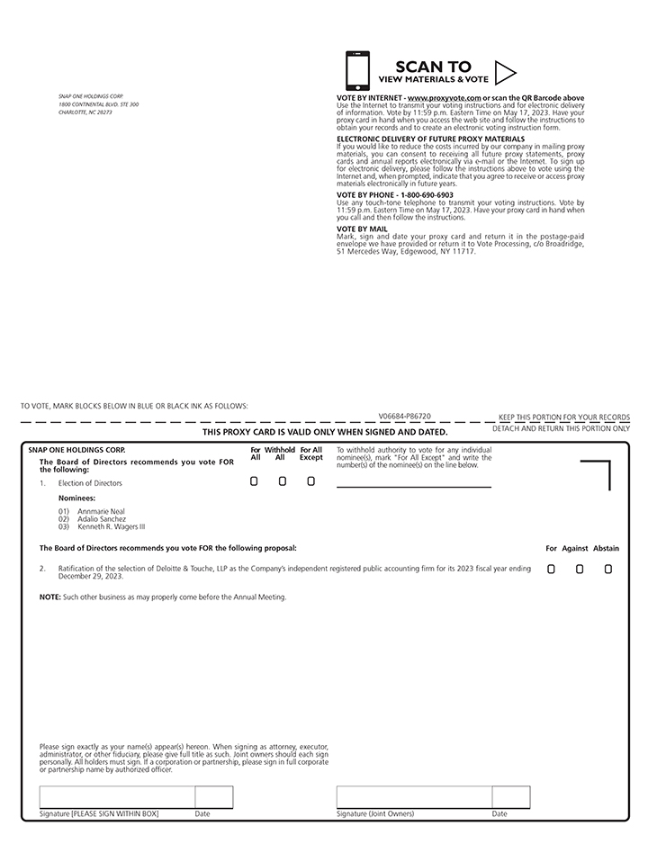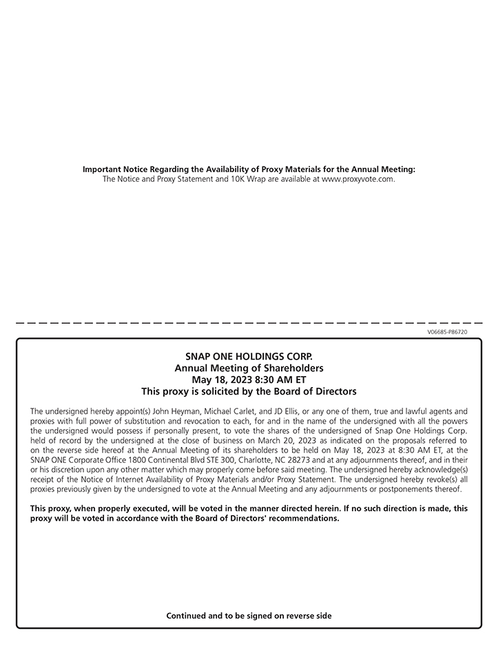 Thank you for your continued interest in Snap One. I am pleased to invite you to attend the Company’s 2023 Annual Meeting of Stockholders (“Annual Meeting”) to be held on Thursday, May 18, 2023 at 8:30 a.m. Eastern Time at Snap One’s corporate offices located at 1800 Continental Blvd STE 300, Charlotte, NC 28273.