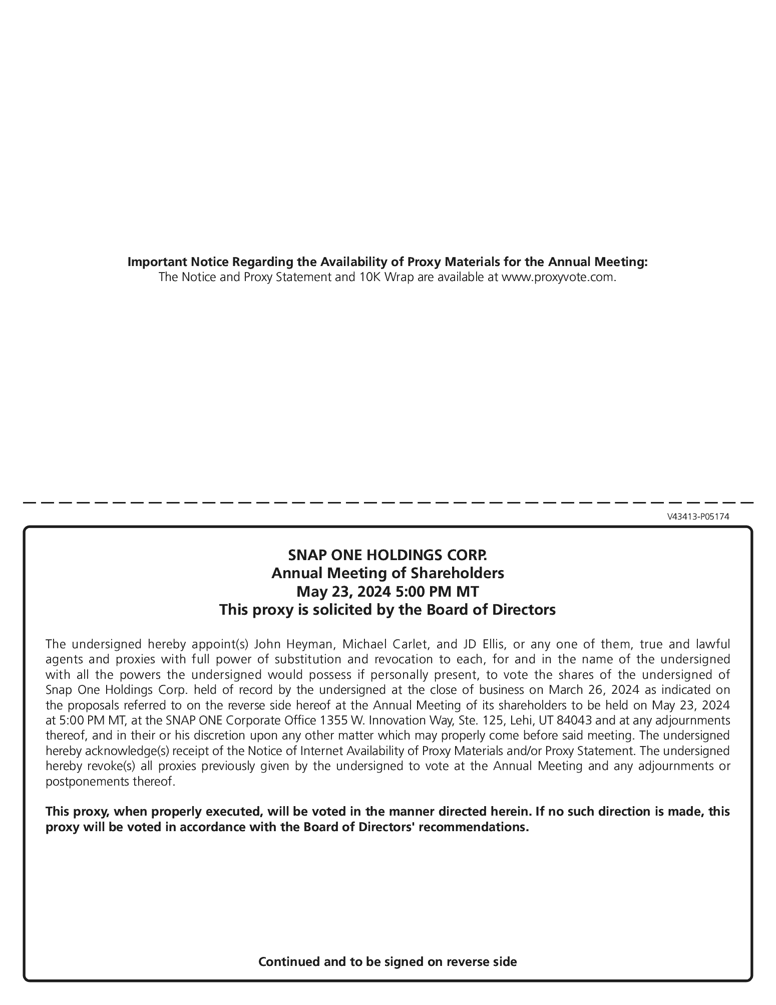 | | Important Notice Regarding Availability of Proxy Materials for the Annual Meeting on May 23, 2024: This notice of Annual Meeting, and the accompanying proxy statement (“Proxy Statement”), and form of electronic proxy card, as well as the annual report on Form 10-K for the fiscal year ended December 29, 2023 (“2023 Annual Report,” collectively, “Proxy Materials”), are first being distributed or made available, as the case may be, on or about April 9, 2024. Registered and beneficial shareholders may visit www.proxyvote.com to view and print these documents. The Proxy Statement and 2023 Annual Report may also be found in the Investor Relations section of the Company’s website at www.snapone.com under SEC Filings. | |