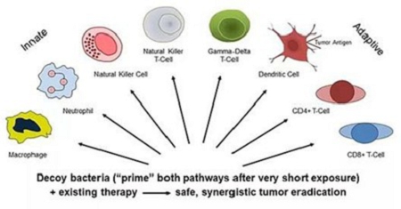 Our patented approach is based on the hypothesis that efficient activation of both innate and adaptive immune cells and associated anti-tumor immune responses can be achieved by using intact bacteria, containing multiple PAMPs, which have been attenuated so that they can be administered safely intravenously. Because LPS appears to be the most important contributor to both toxicity and efficacy, our patented product candidates are single strains of killed, non-pathogenic Gram-negative bacteria that have been treated in an effort to kill the bacteria and significantly reduce, but not completely eliminate, the cell surface LPS-endotoxin activity. Our product candidates are designed to have enhanced sufficient residual LPS to synergize with other PAMPs in the bacteria to efficiently prime innate and adaptive immune pathways. This approach has led to broad anti-tumor responses, including synergistic regressions and durable responses with five different classes of existing anti-tumor agents, in preclinical models, including checkpoint therapy, targeted antibody therapy and low-dose chemotherapy. Tumor eradication by our technology is designed to produce both innate and adaptive immunological memory and, importantly, not require provision of an exogenous tumor antigen, potentially due to the ability of LPS and other PAMPS to activate dendritic cells that have already captured a tumor antigen.